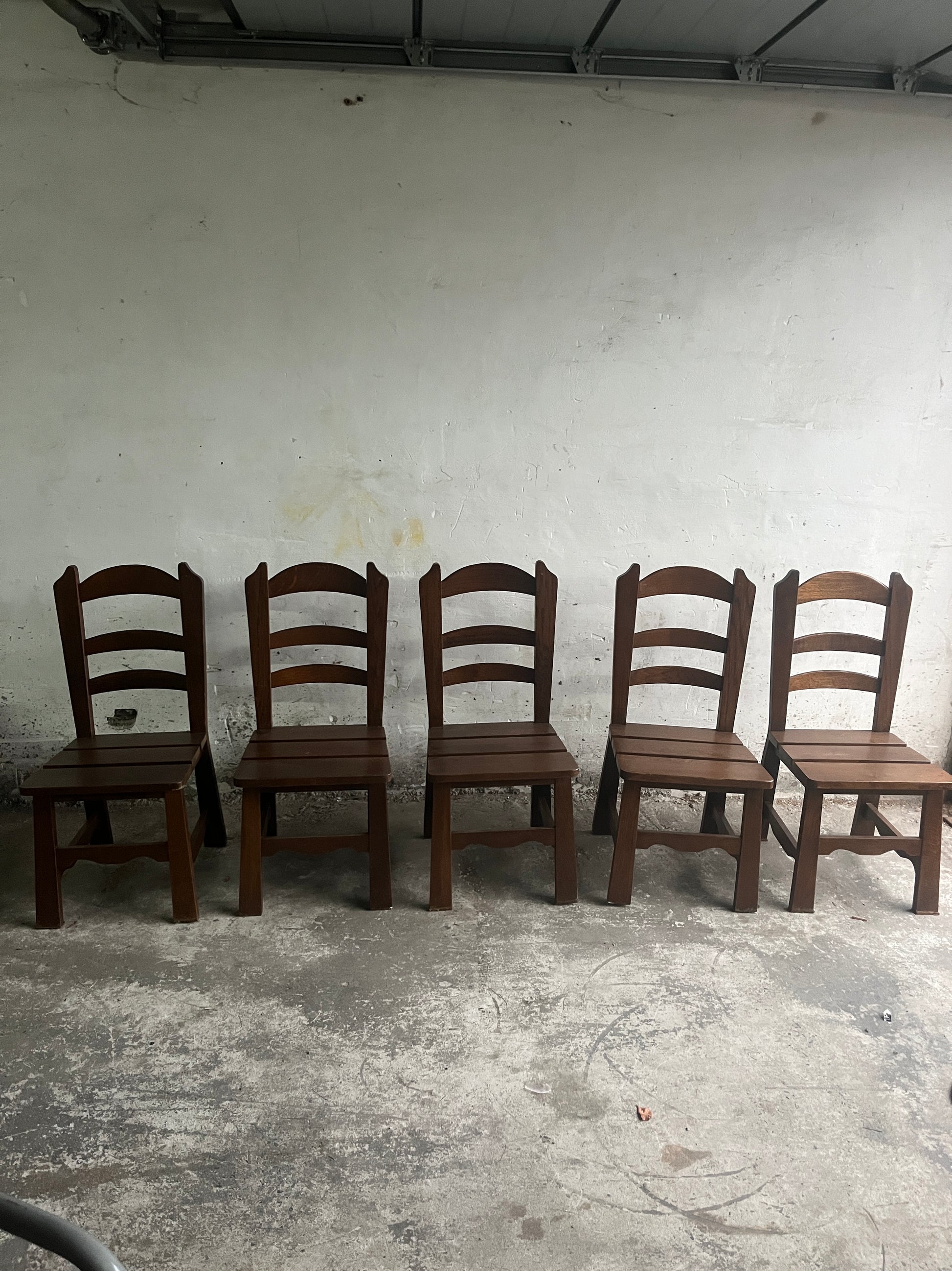 A striking set of ten handcrafted Brutalist dining chairs in solid stained wood. Their sculptural ladder-back design, visible wooden joinery and angular frame give them a strong architectural presence typical of mid-century Brutalist craftsmanship. Perfect for a large dining table, hospitality setting or rustic contemporary interior.