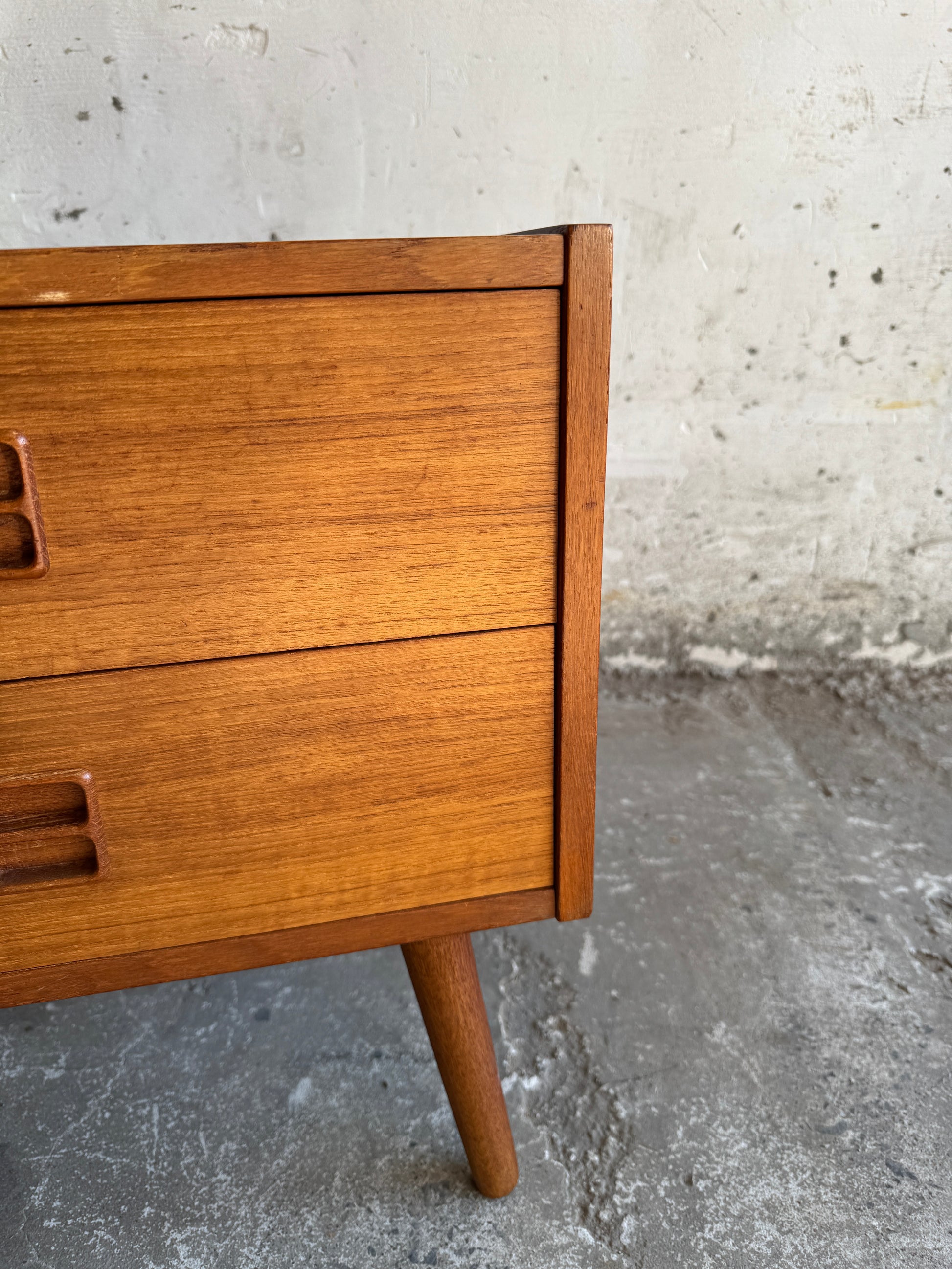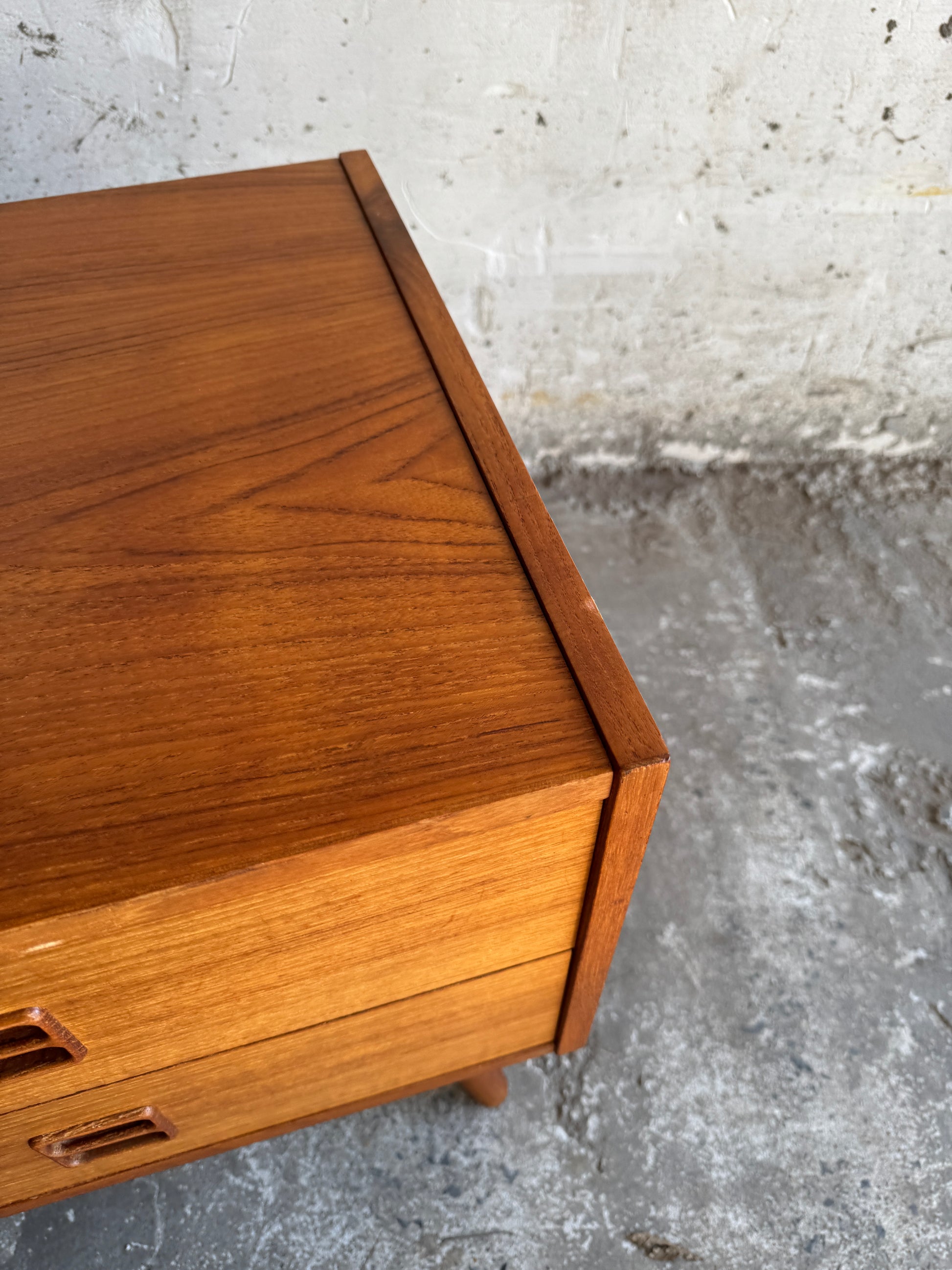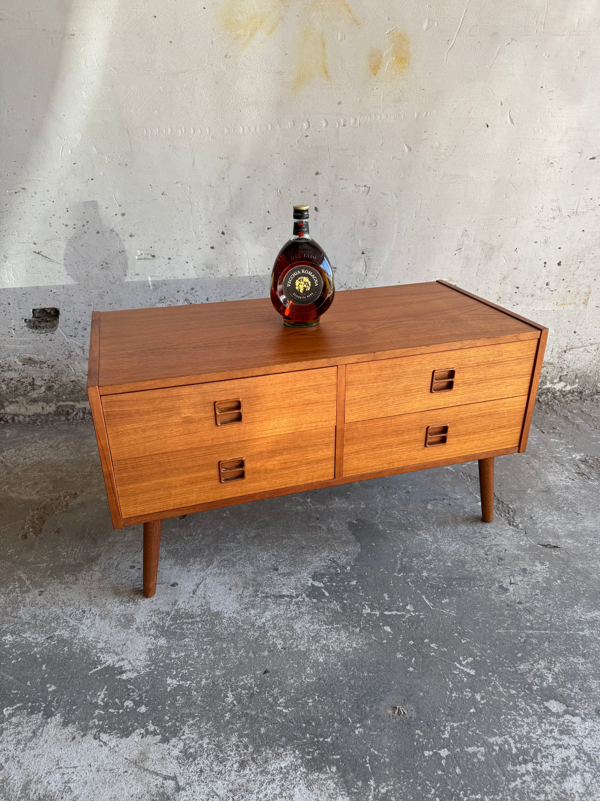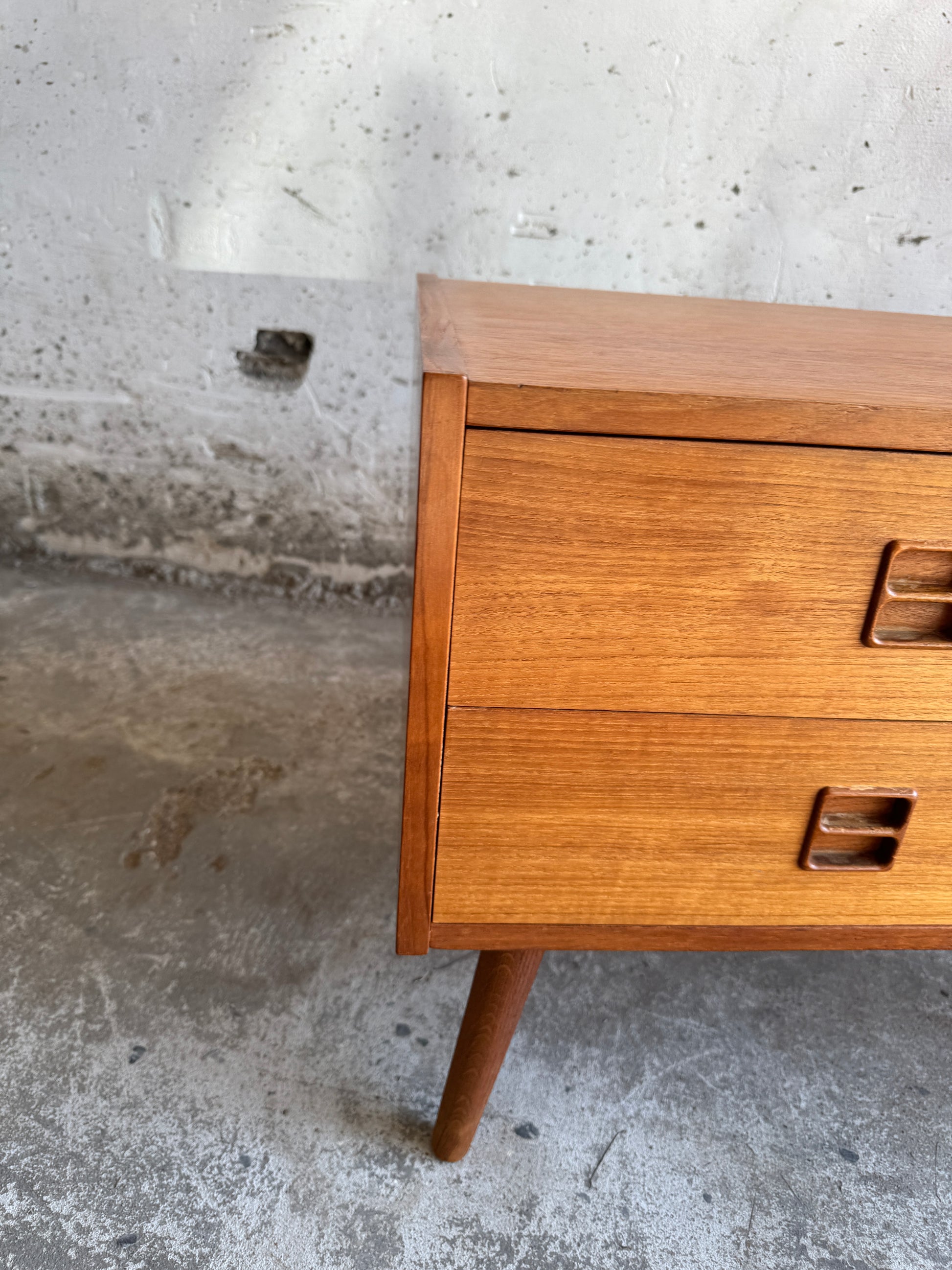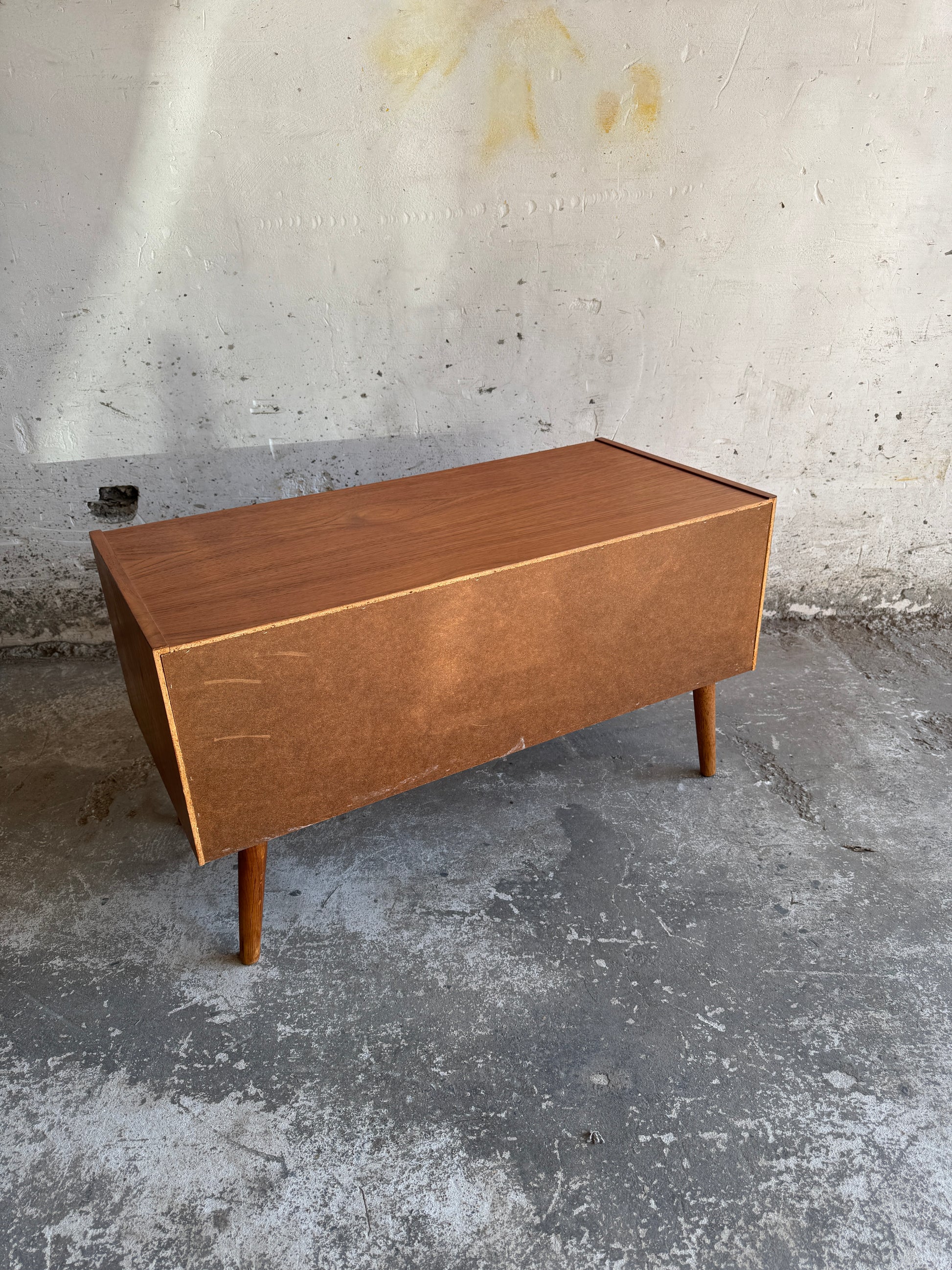 Commode vintage élégante de Millenium Design, réalisée en placage de teck chaleureux. Ce meuble compact respire l'élégance scandinave pure tout en offrant un espace de rangement pratique.