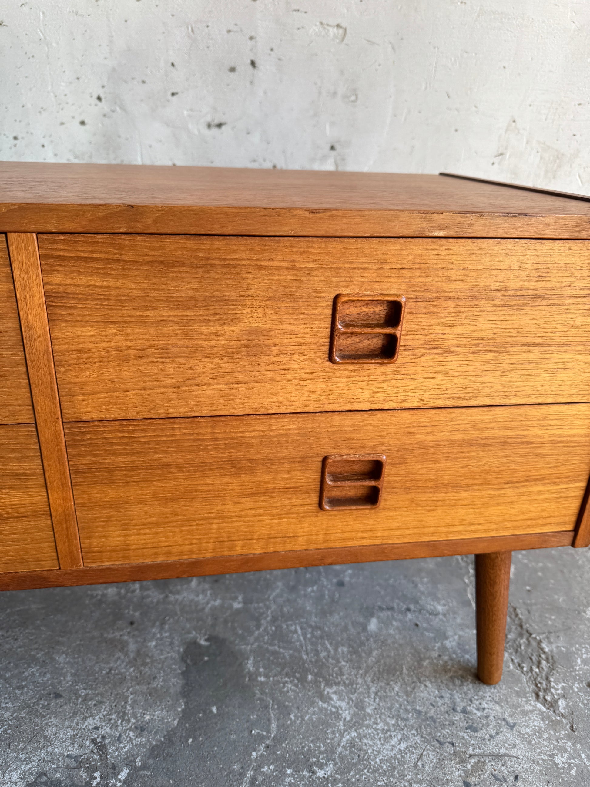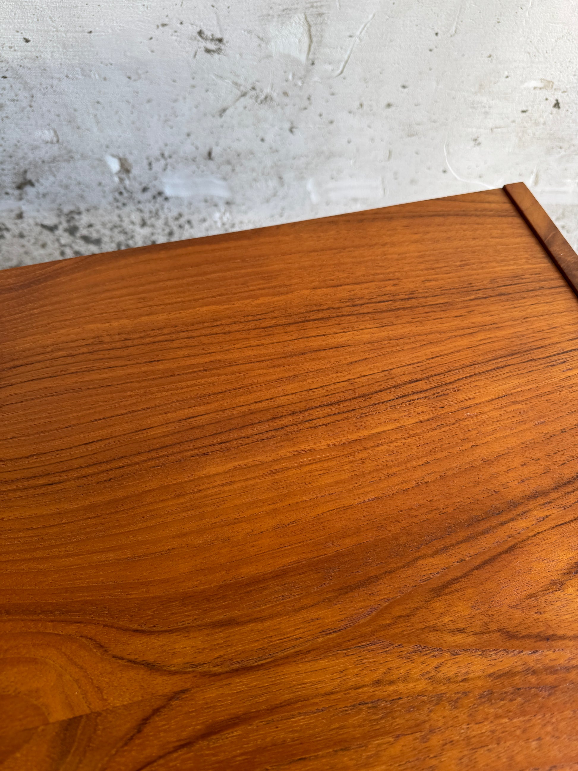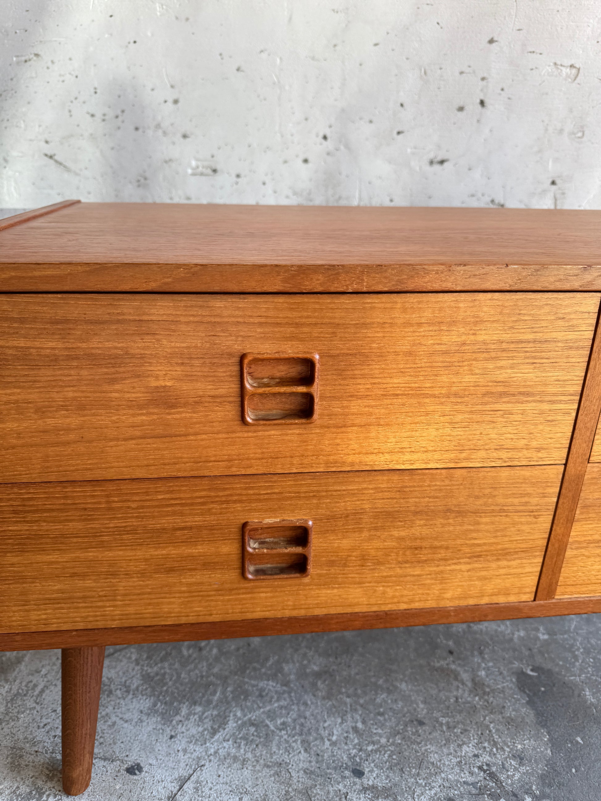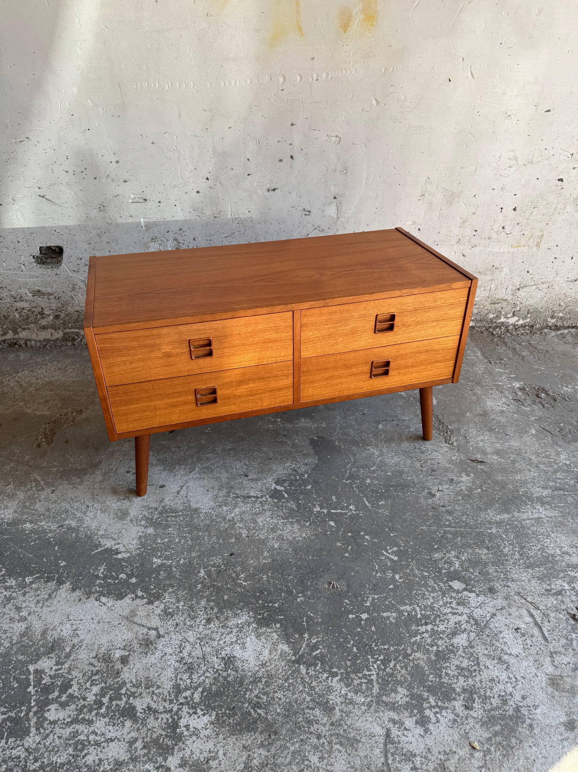 Commode vintage élégante de Millenium Design, réalisée en placage de teck chaleureux. Ce meuble compact respire l'élégance scandinave pure tout en offrant un espace de rangement pratique.