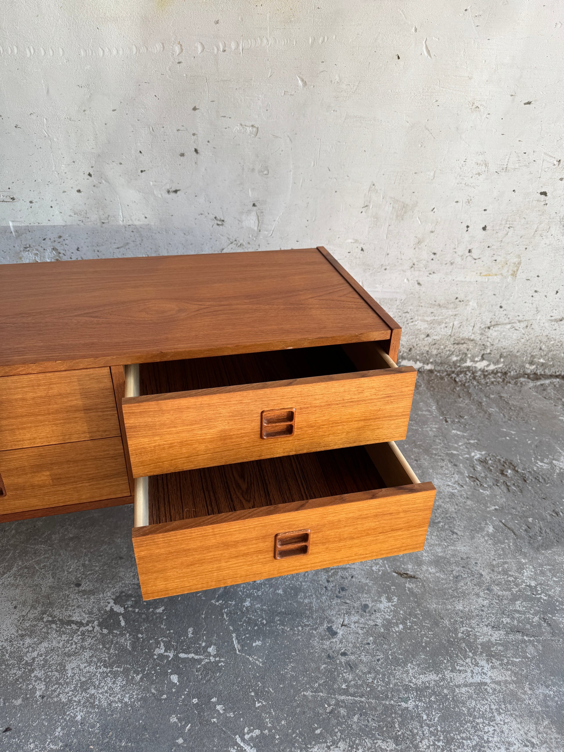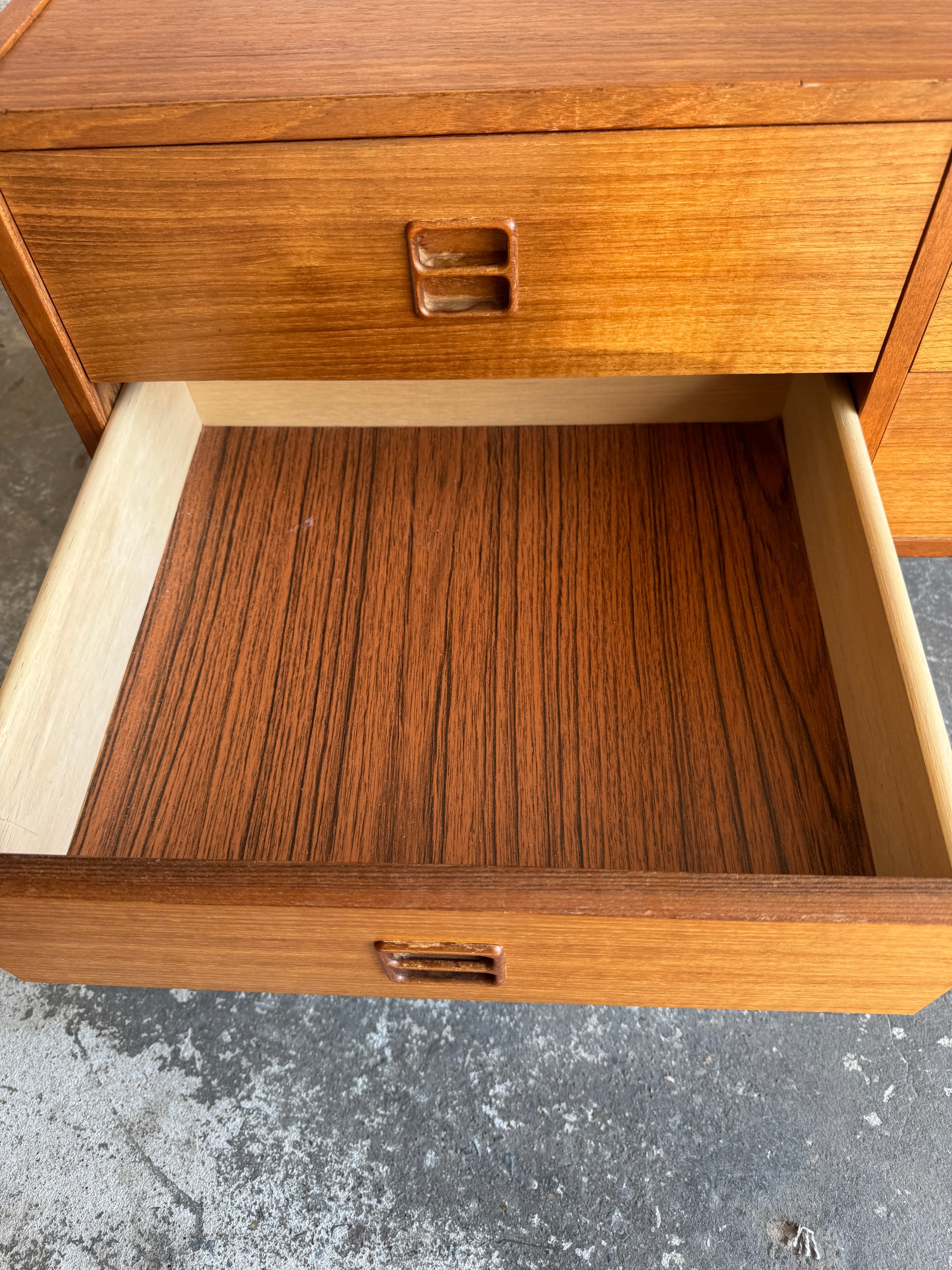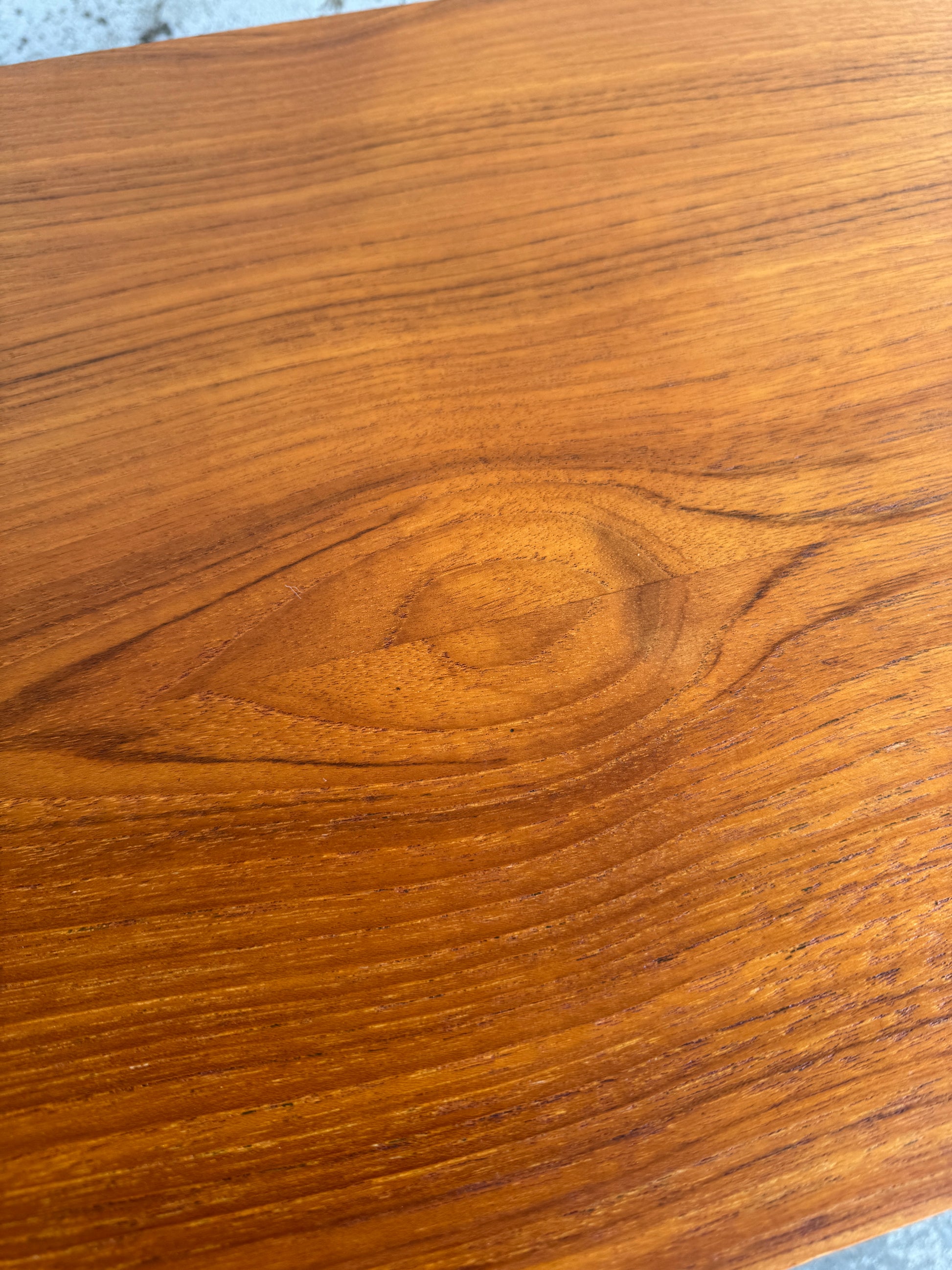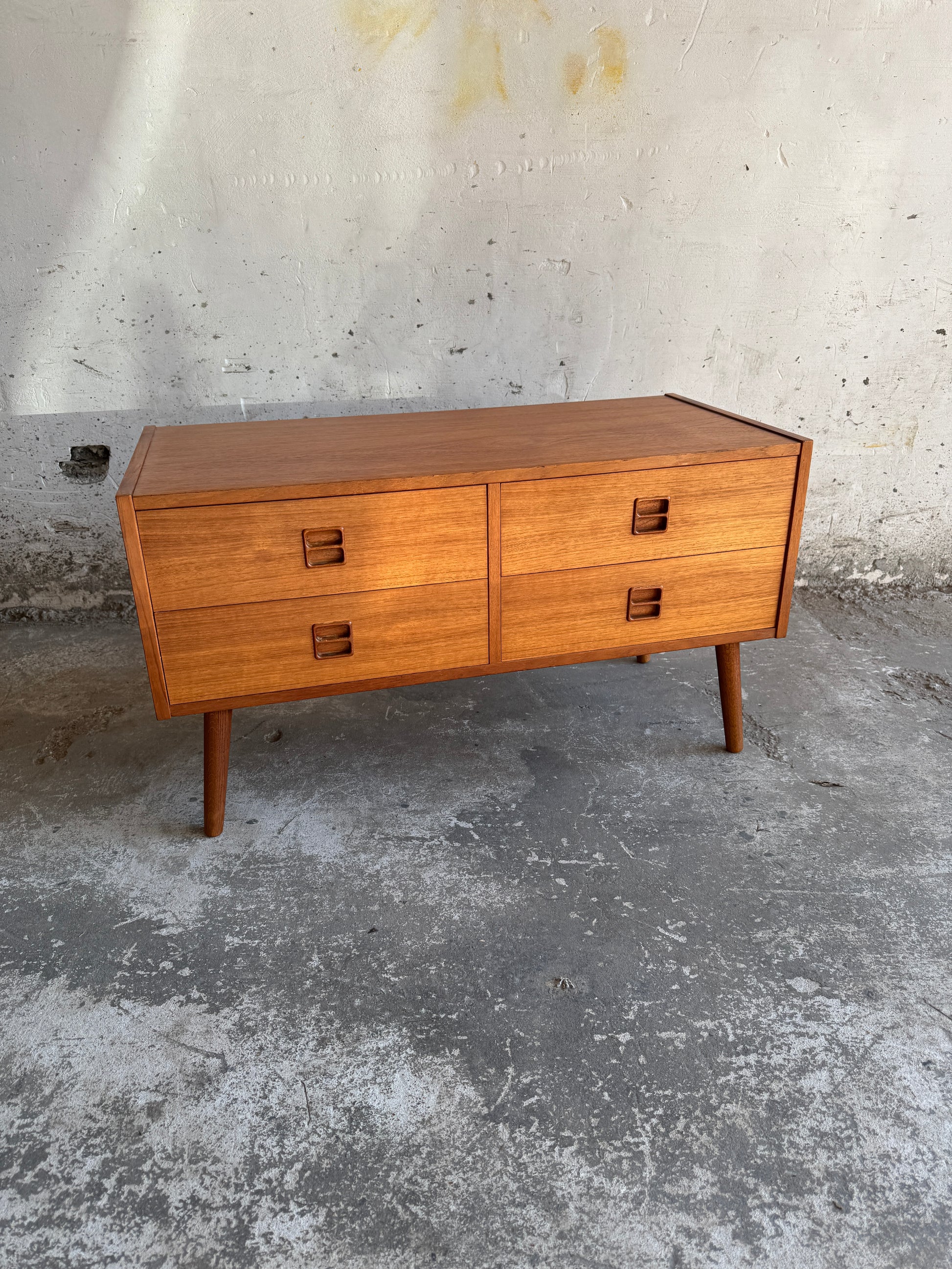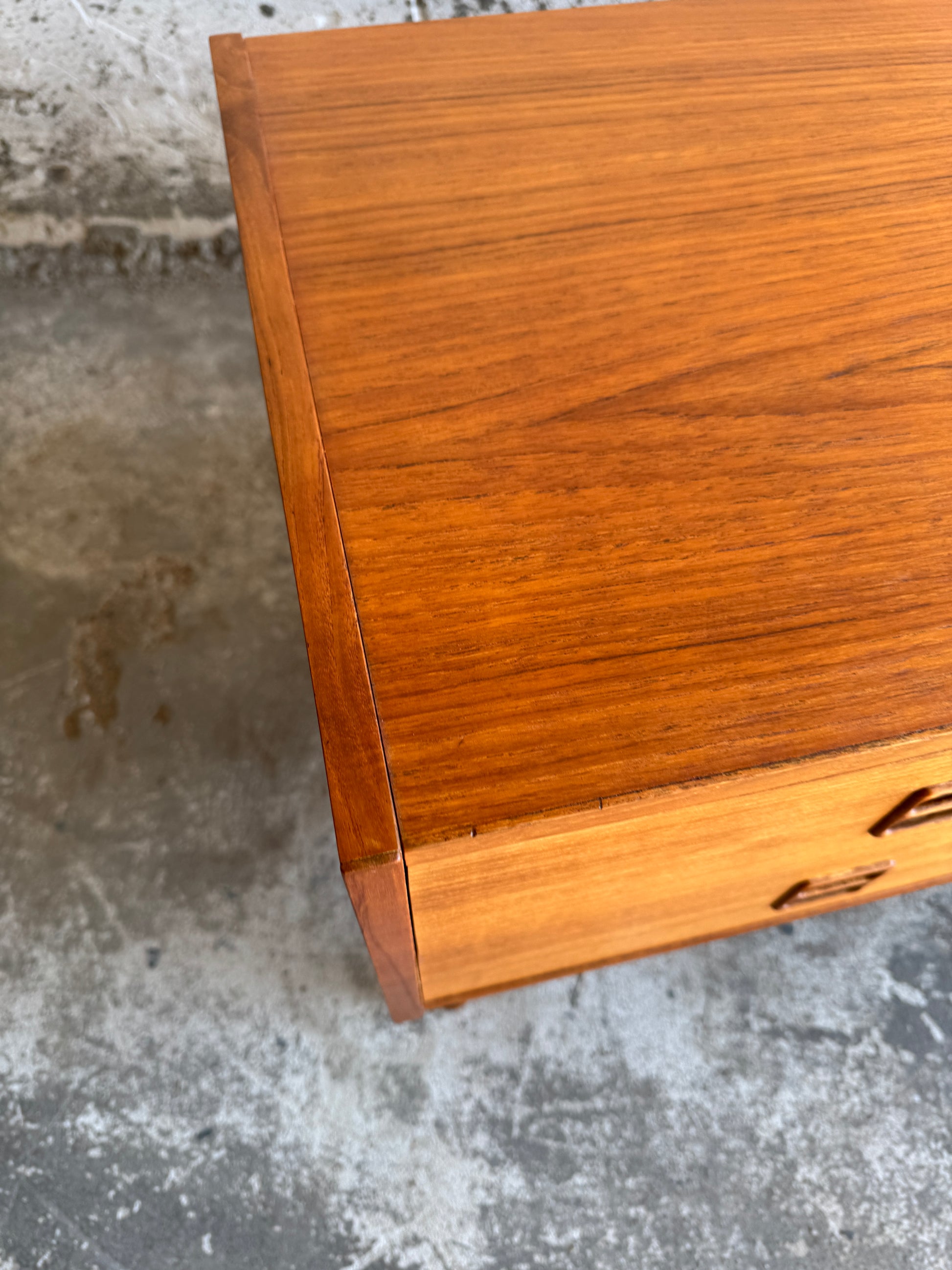 Commode vintage élégante de Millenium Design, réalisée en placage de teck chaleureux. Ce meuble compact respire l'élégance scandinave pure tout en offrant un espace de rangement pratique.