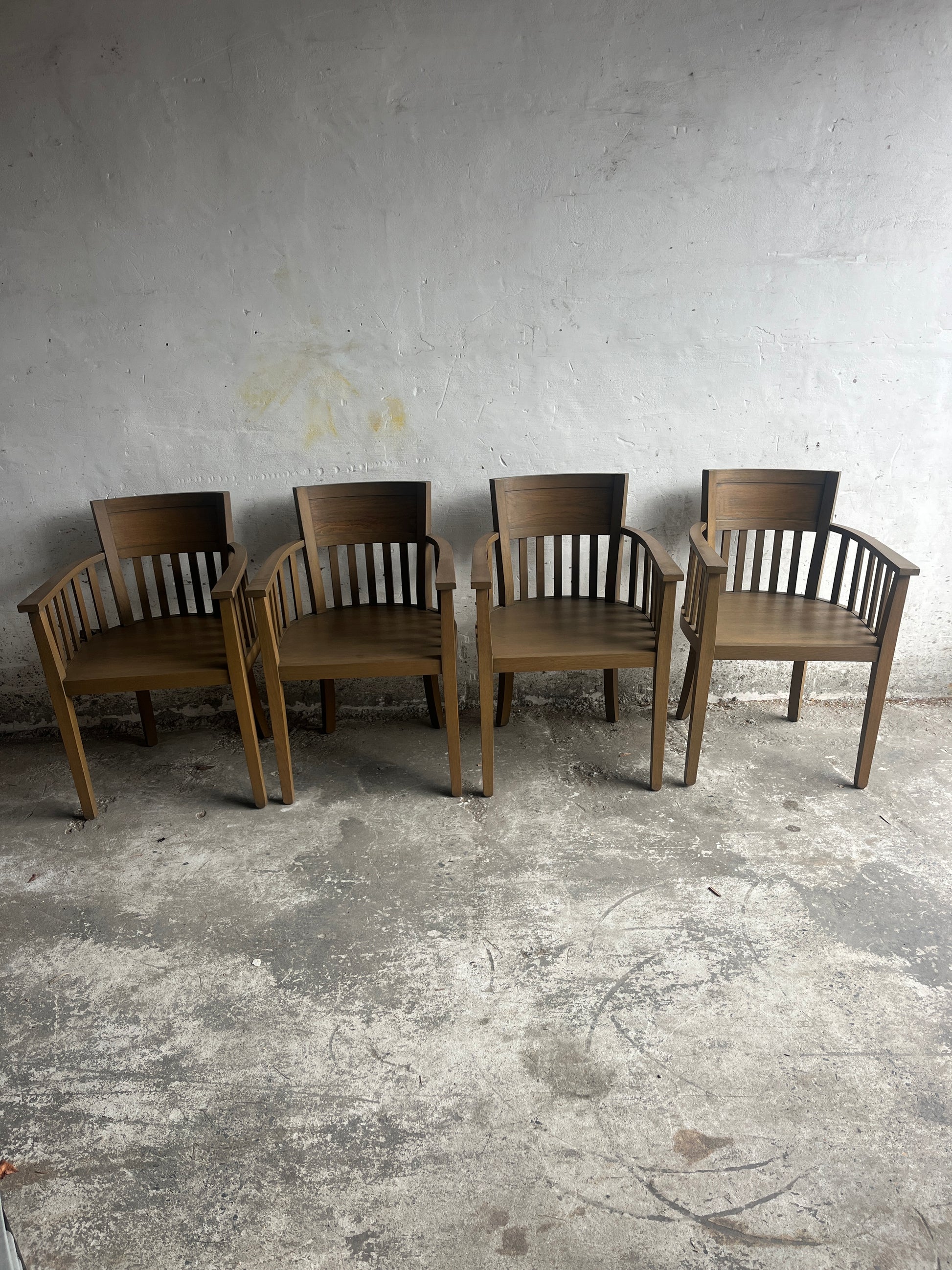 A beautiful set of eight solid wooden armchairs featuring a timeless slatted back and armrest design. With their warm finish and architectural lines, these chairs bring character and functionality to any dining room, workspace, or hospitality setting.