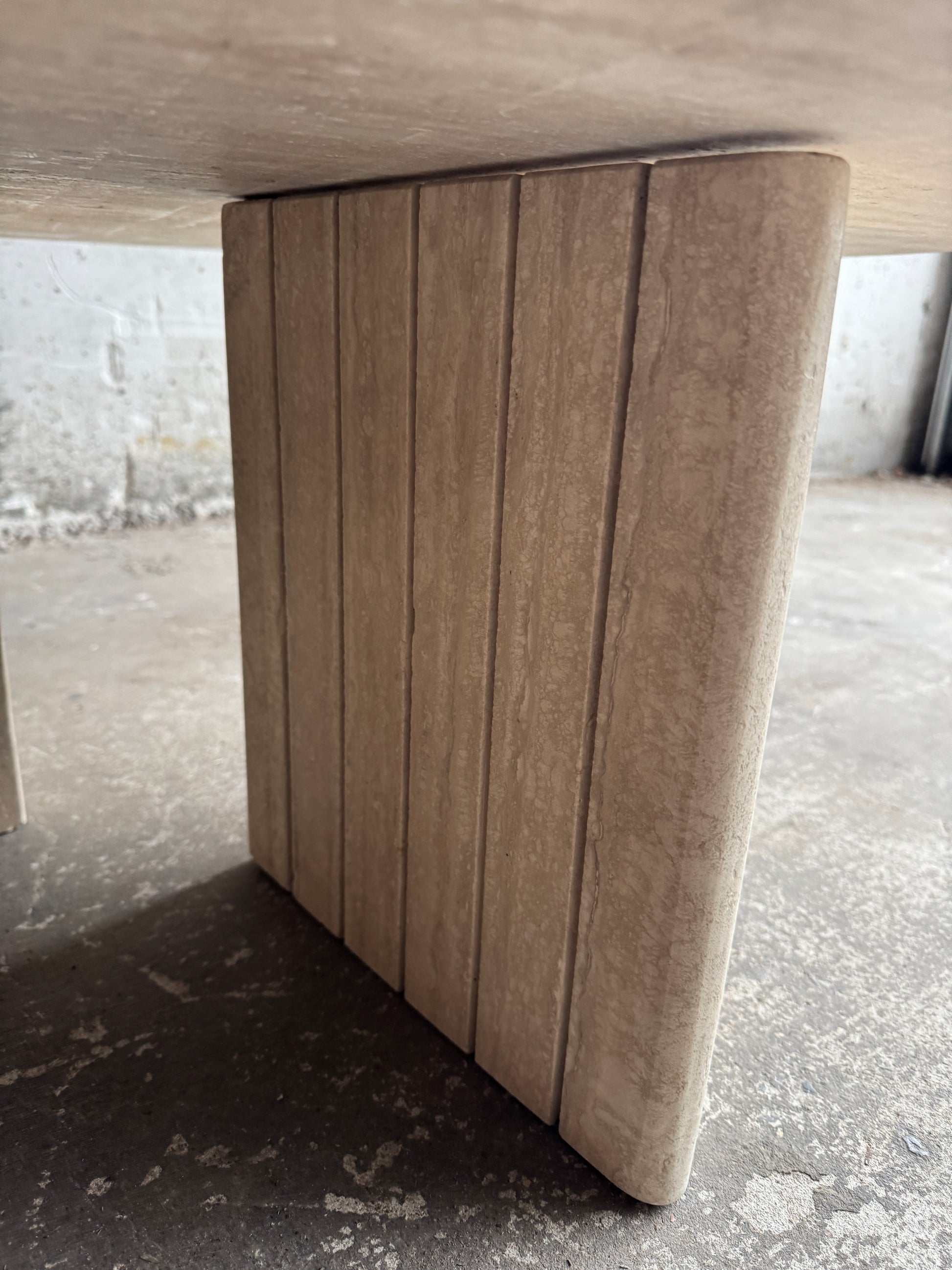 Une table basse ronde en travertin naturel, sculpturale et sereine, incarnant l'esthétique raffinée du design moderniste italien. La table présente un épais plateau circulaire reposant sur un piédestal asymétrique aux détails nervurés, un clin d'œil architectural subtil au brutalisme et à l'élégance postmoderne.