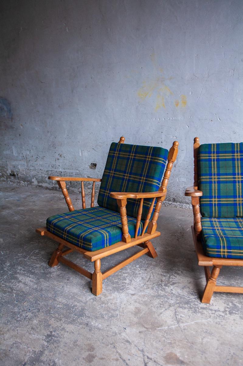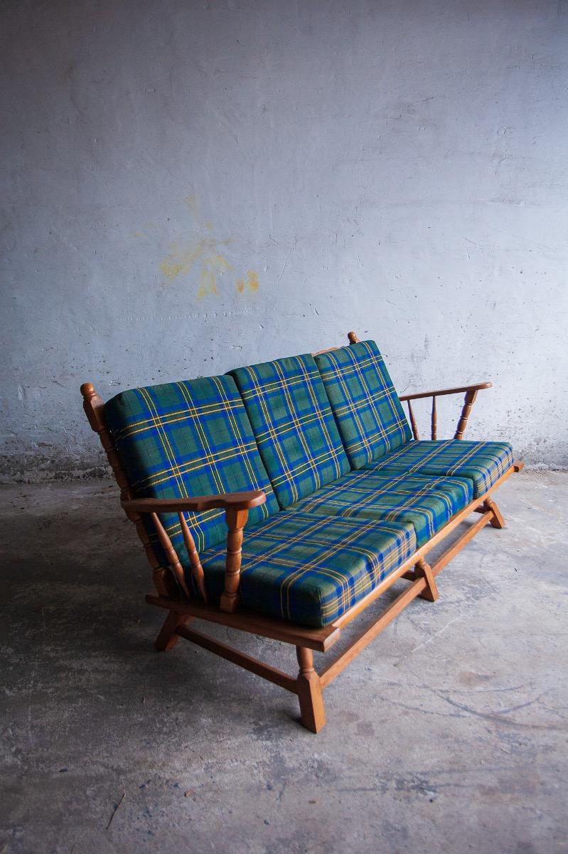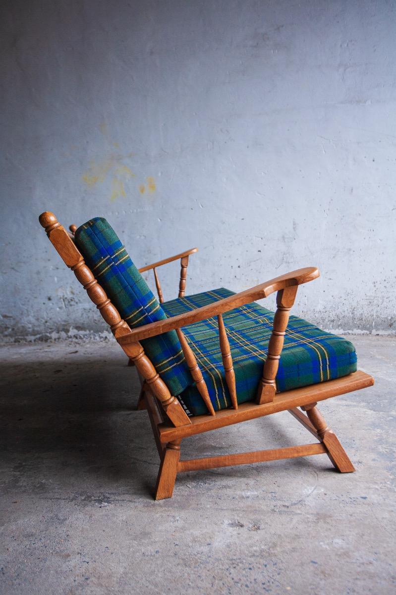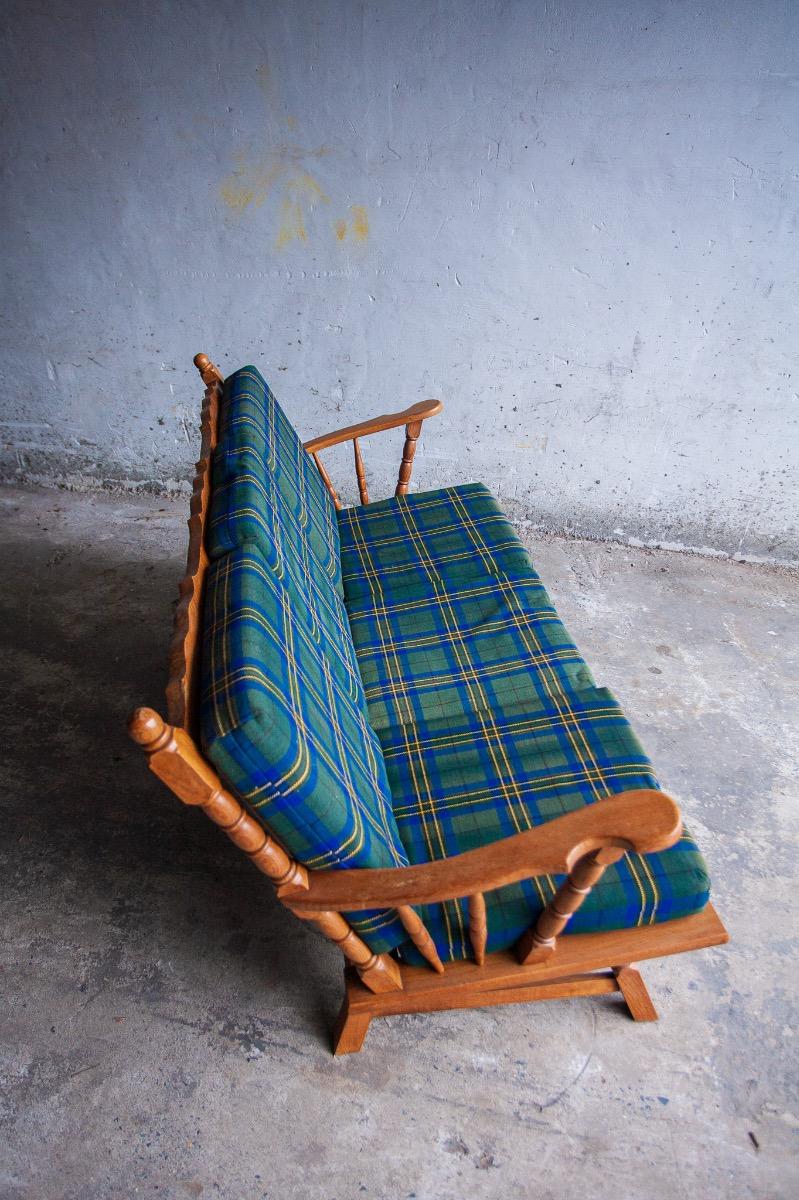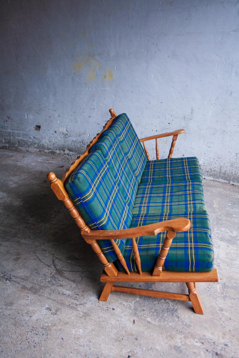 Authentieke vintage bank ontworpen door het Franse duo Guillerme et Chambron. Het eikenhouten frame met karakteristieke gedraaide elementen contrasteert prachtig met de originele bekleding in een blauwgroen ruitmotief. Een echte blikvanger met Franse flair.