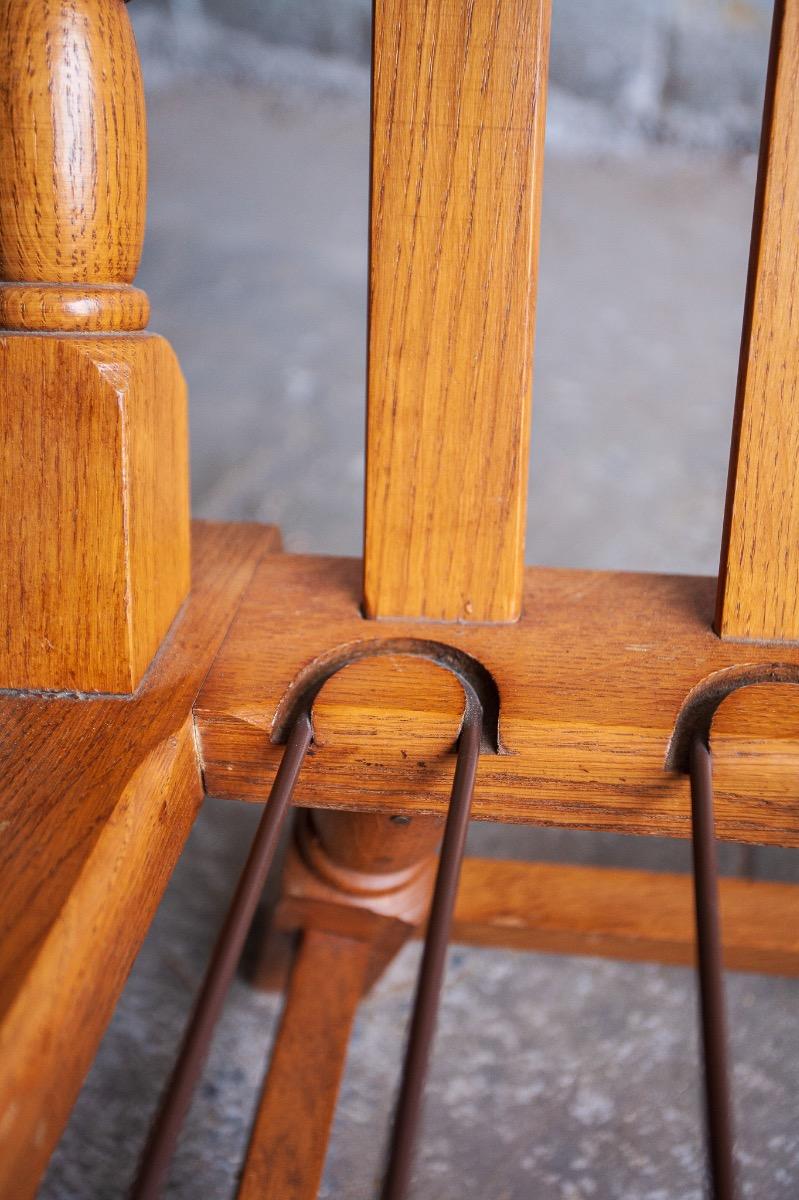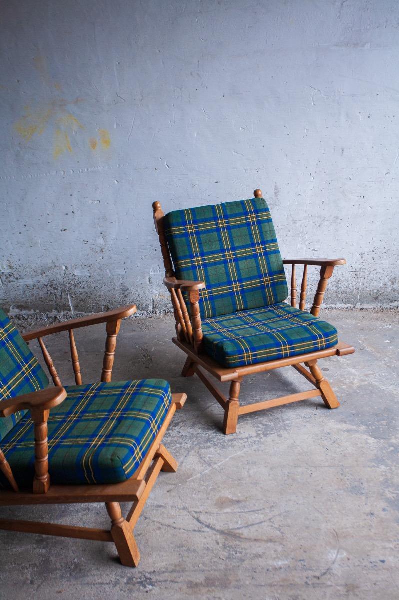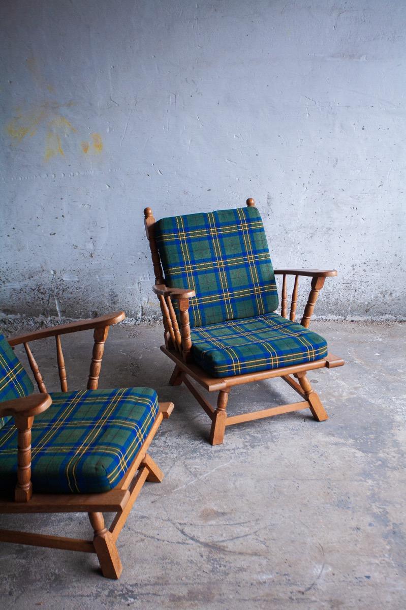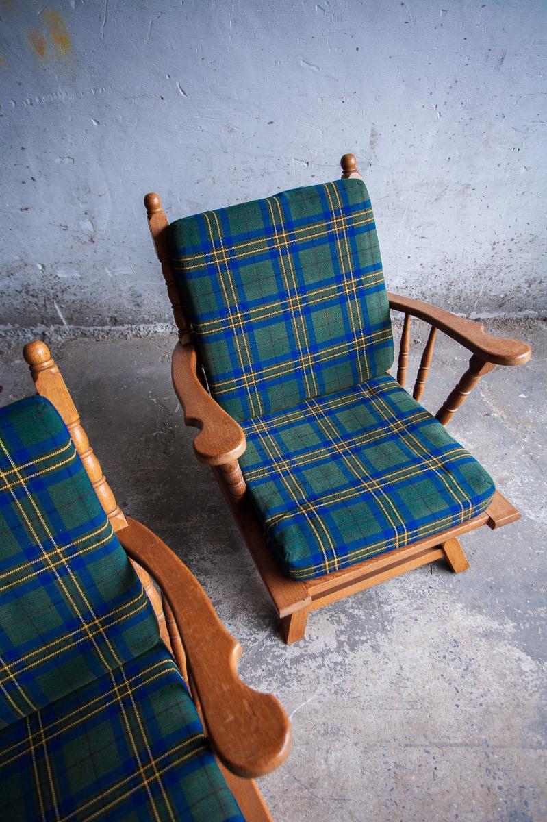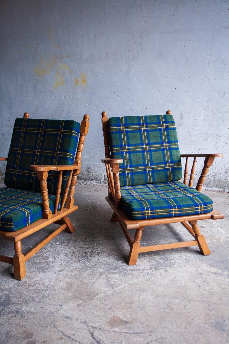 Authentieke vintage bank ontworpen door het Franse duo Guillerme et Chambron. Het eikenhouten frame met karakteristieke gedraaide elementen contrasteert prachtig met de originele bekleding in een blauwgroen ruitmotief. Een echte blikvanger met Franse flair.