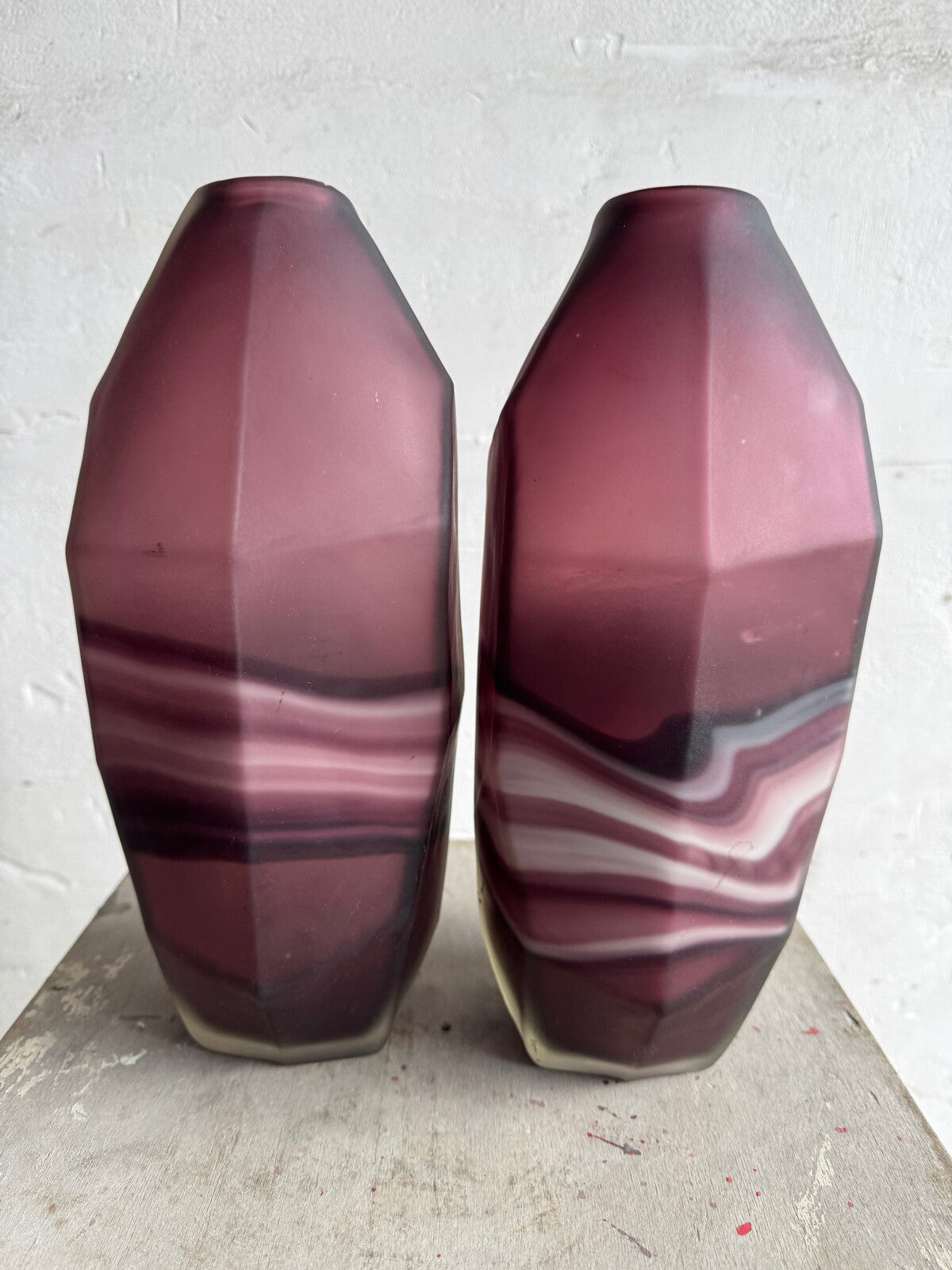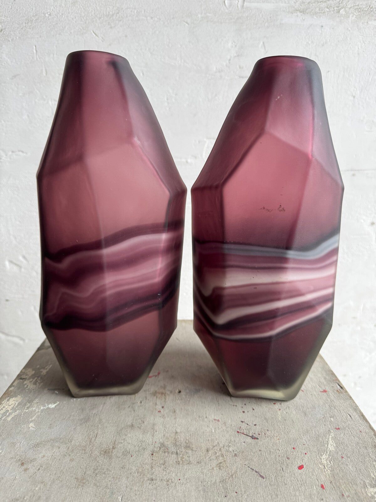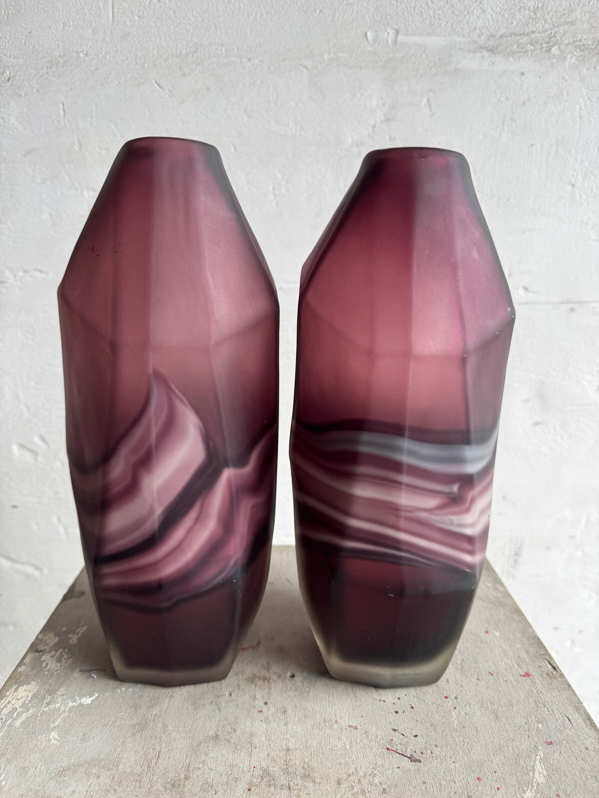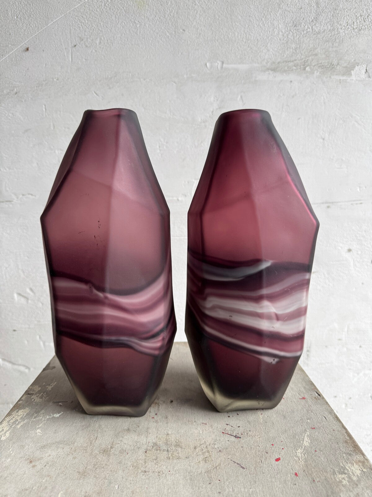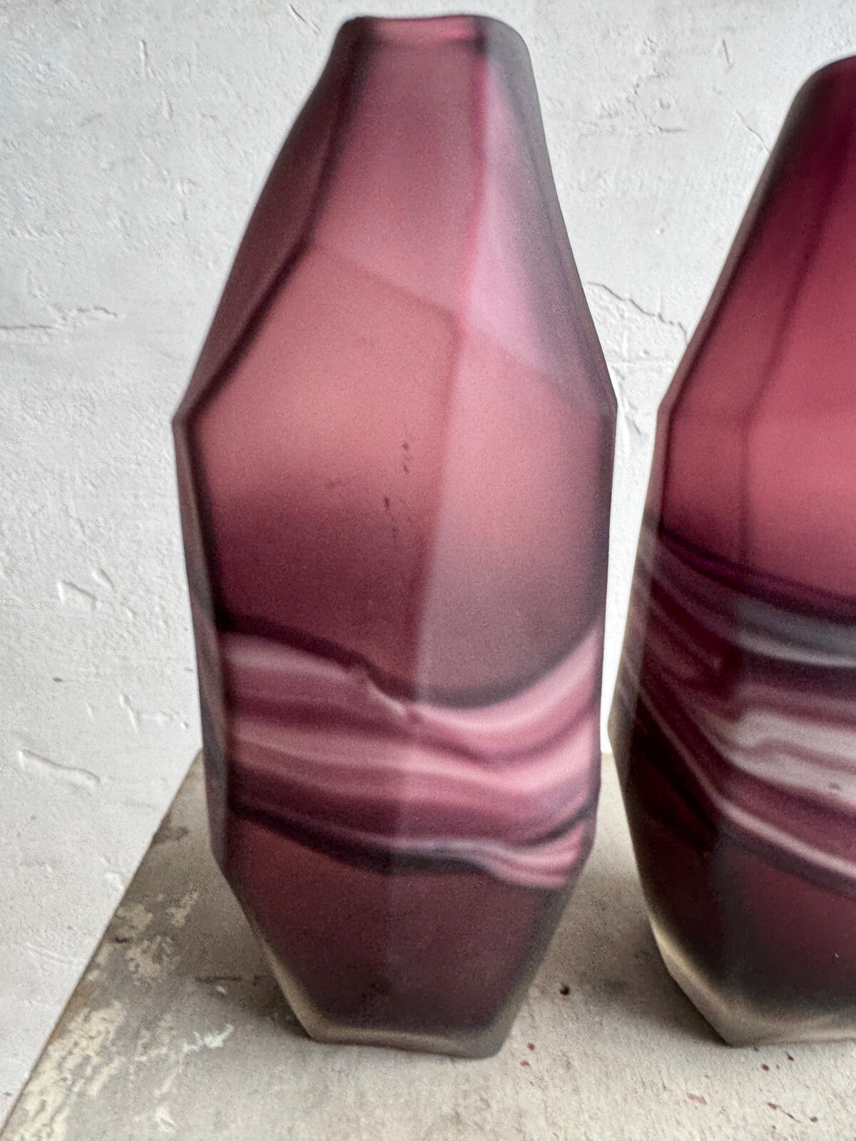 Deze opvallende set glazen vazen heeft een prachtige mix van amethist en witte wervelingen, wat een betoverend, artistiek effect creëert. De vazen hebben een modern geometrisch ontwerp met hoekige snedes die de wervelende patronen van het glas complementeren. De diepe amethistkleur in combinatie met de zachte witte wervelingen maken deze vazen een perfect statement piece voor eigentijdse of vintage-geïnspireerde interieurs.