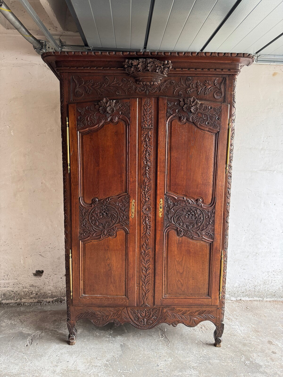 Deze prachtige antieke kledingkast is een waar bewijs van vakmanschap, met ingewikkelde handgesneden bloemen- en bladmotieven op de deuren en het frame. De kast is gemaakt van rijk, donker hout en heeft een klassieke Lodewijk XVI-stijl, met decoratieve accenten zoals een kroonmotief op de bovenkant en elegante messing handgrepen. Het gedetailleerde snijwerk geeft het stuk een grandeur en historische uitstraling, waardoor het een echte blikvanger is in elke kamer.