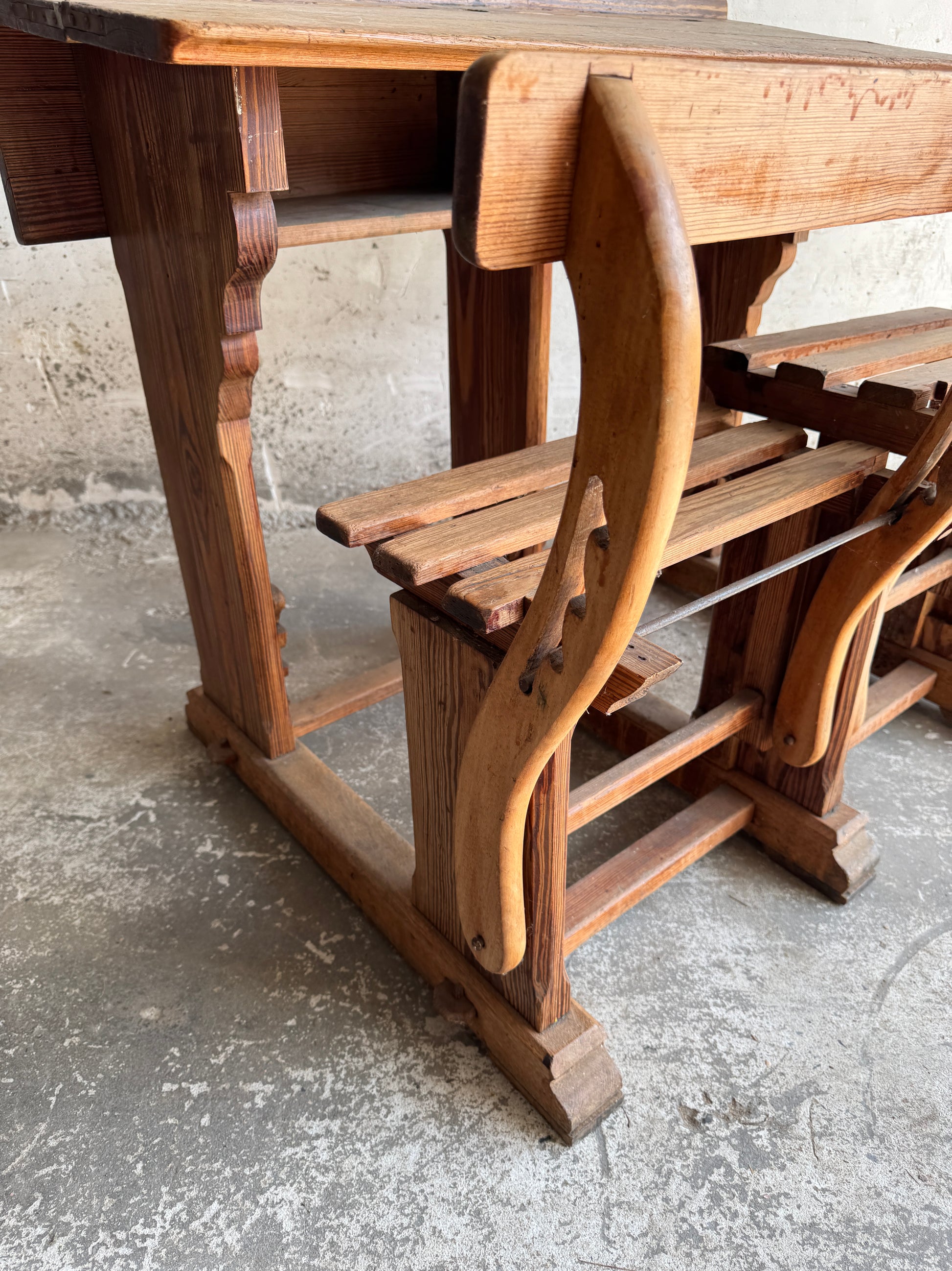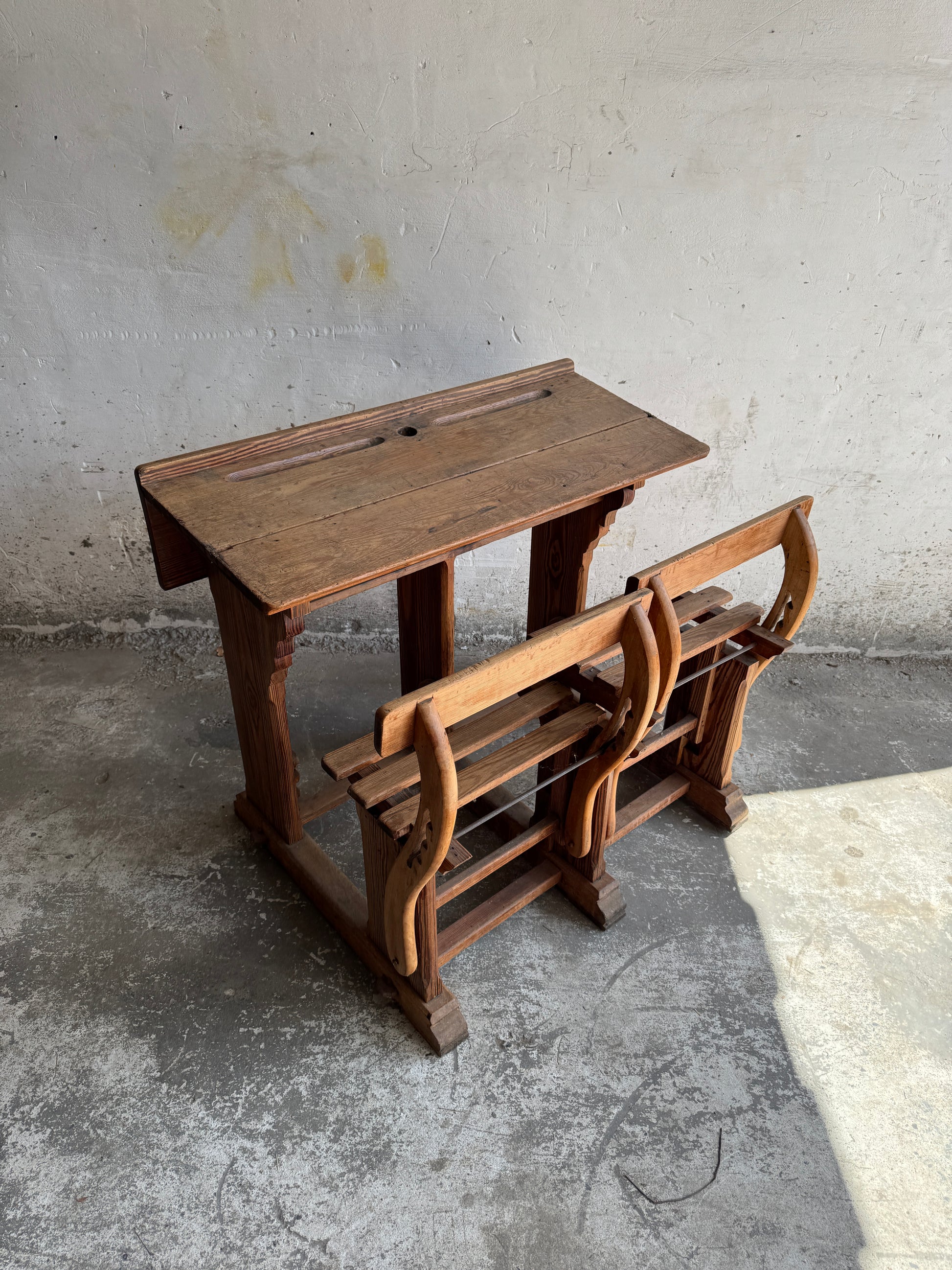 Antieke houten schoolbank met twee banken – begin 20e eeuw