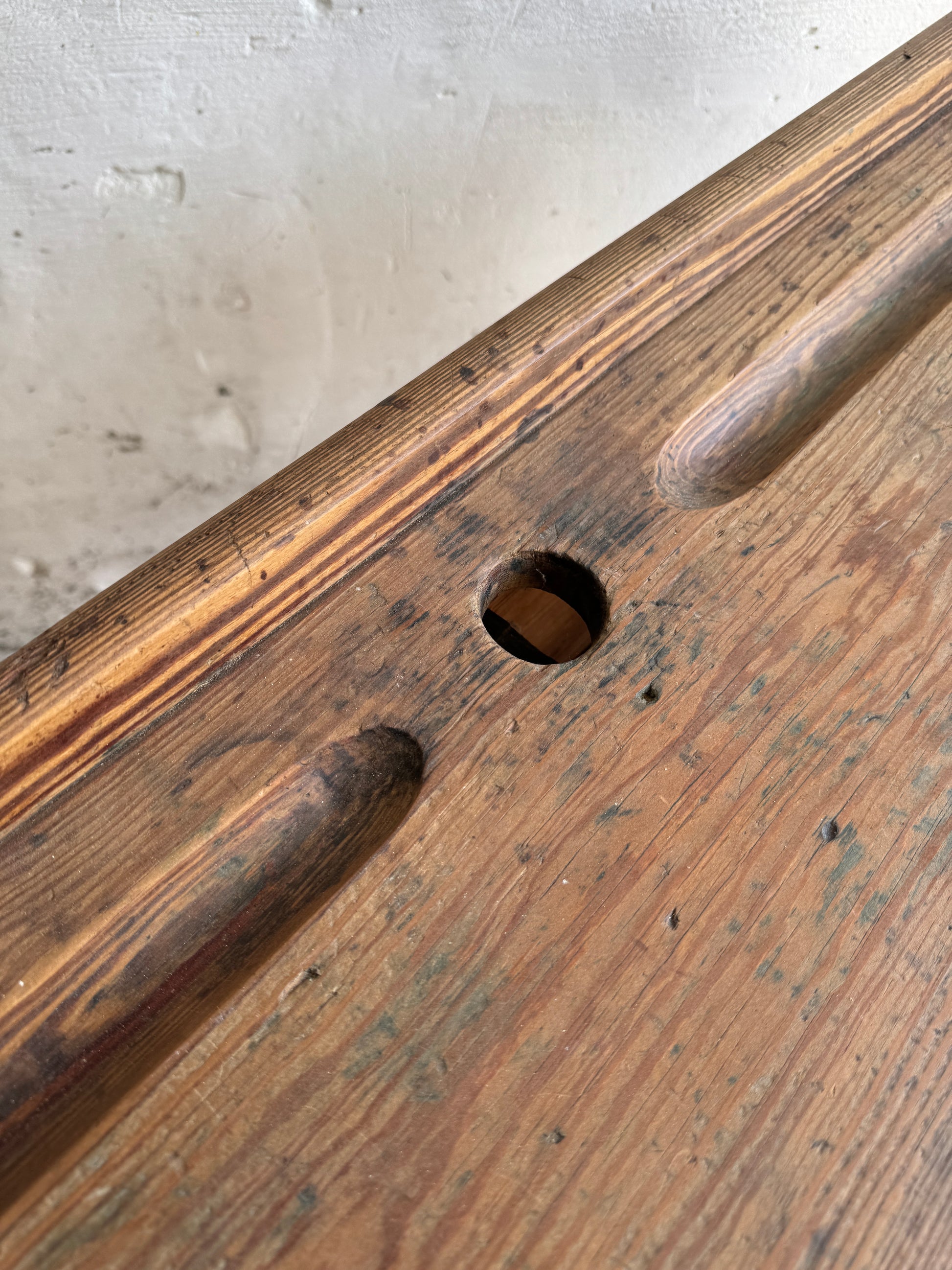 Een nostalgische en authentieke vintage schoolbank met twee aangebouwde bankjes, vervaardigd uit massief grenen en eikenhout. Met het originele inktpotgat en de gegroefde penhouders legt dit meubelstuk de essentie van klaslokaalontwerp uit het begin van de 20e eeuw vast.