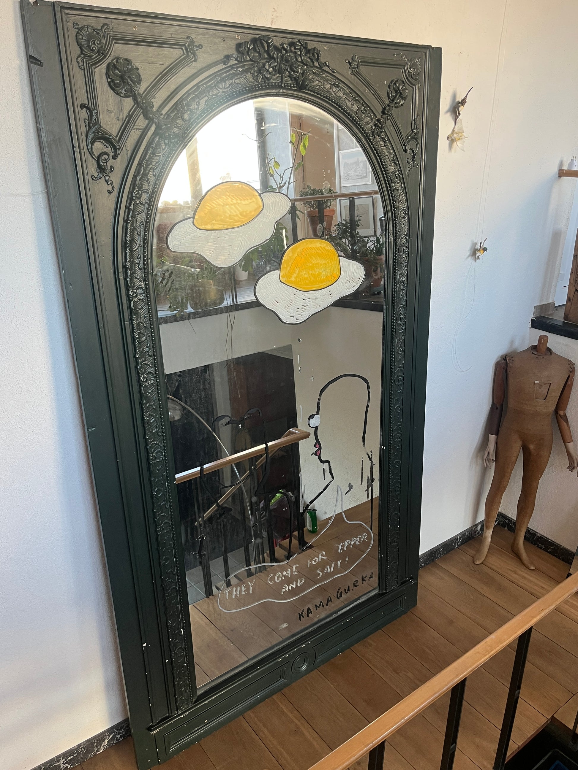 This impressive antique château-style mirror is transformed into a witty artwork by Kamagurka, the renowned Belgian cartoonist and artist. Featuring hand-painted sunny side-up eggs and a minimalist portrait, it combines the grandeur of a château mirror with Kamagurka’s absurdist humor and satirical touch.