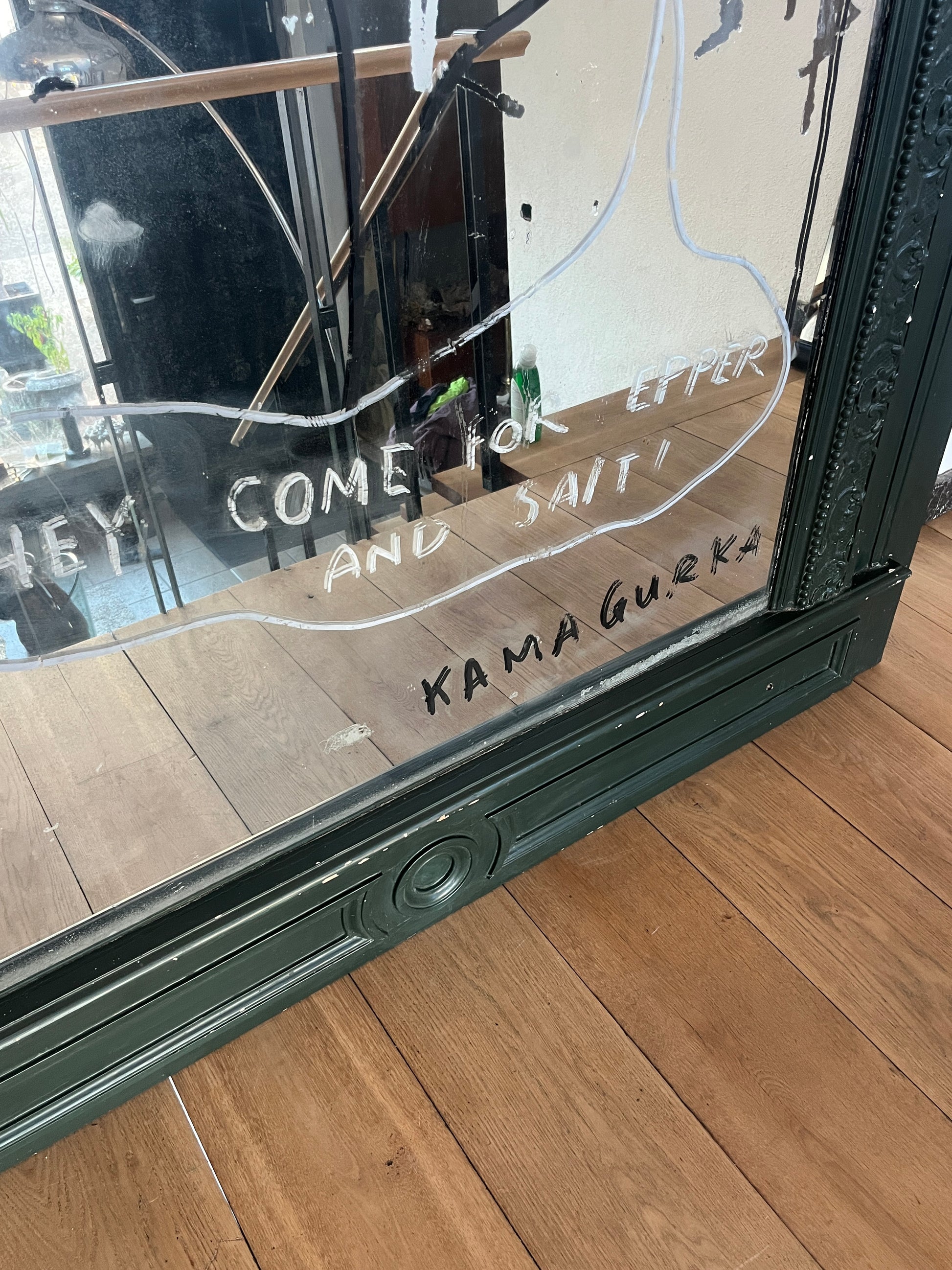 The richly ornamented antique frame contrasts playfully with the contemporary comic-style drawing. The text “They come for pepper and salt!” adds Kamagurka’s trademark surreal twist. Both decorative and functional, it serves as a château statement mirror as well as a unique collectible artwork.