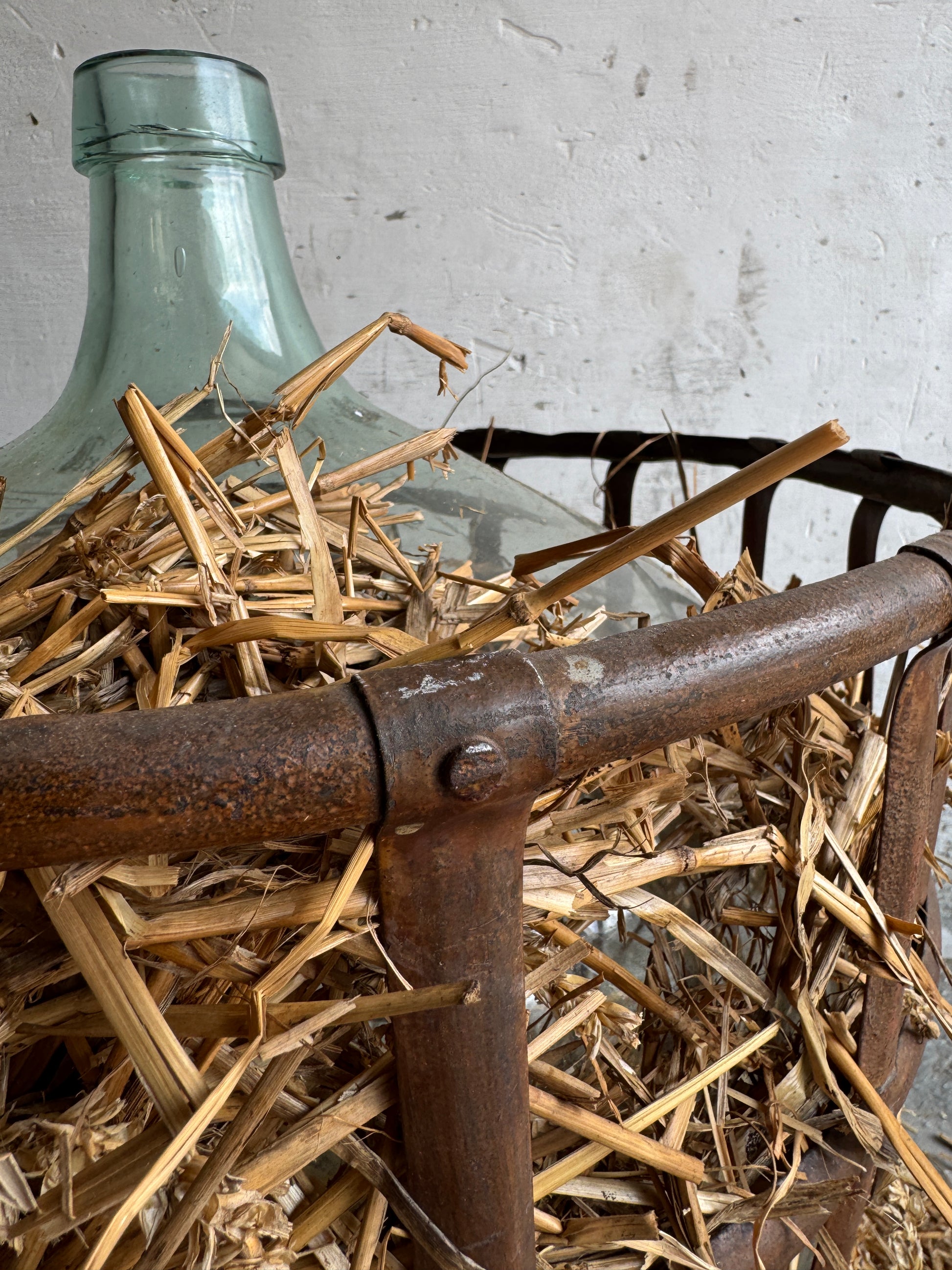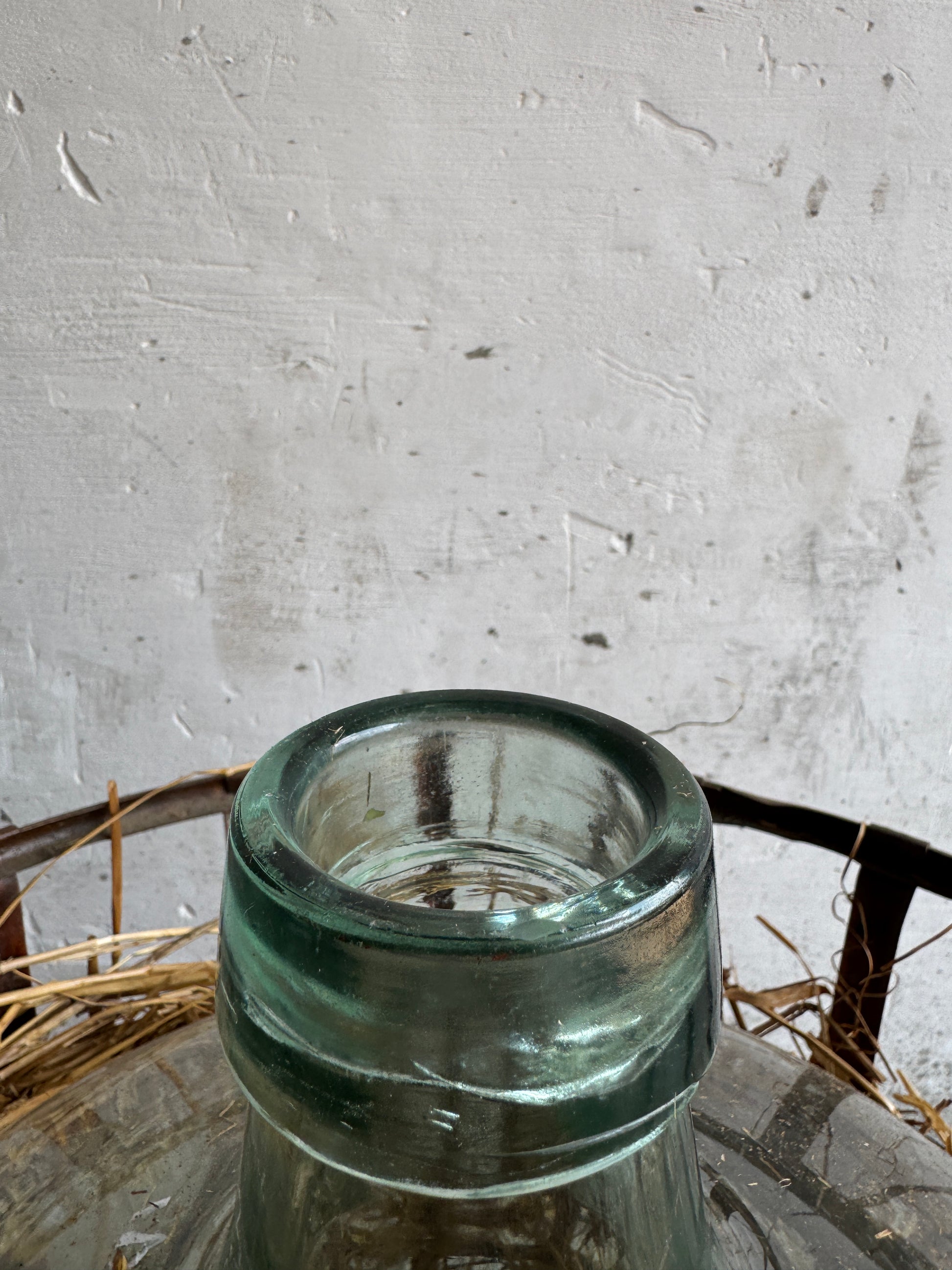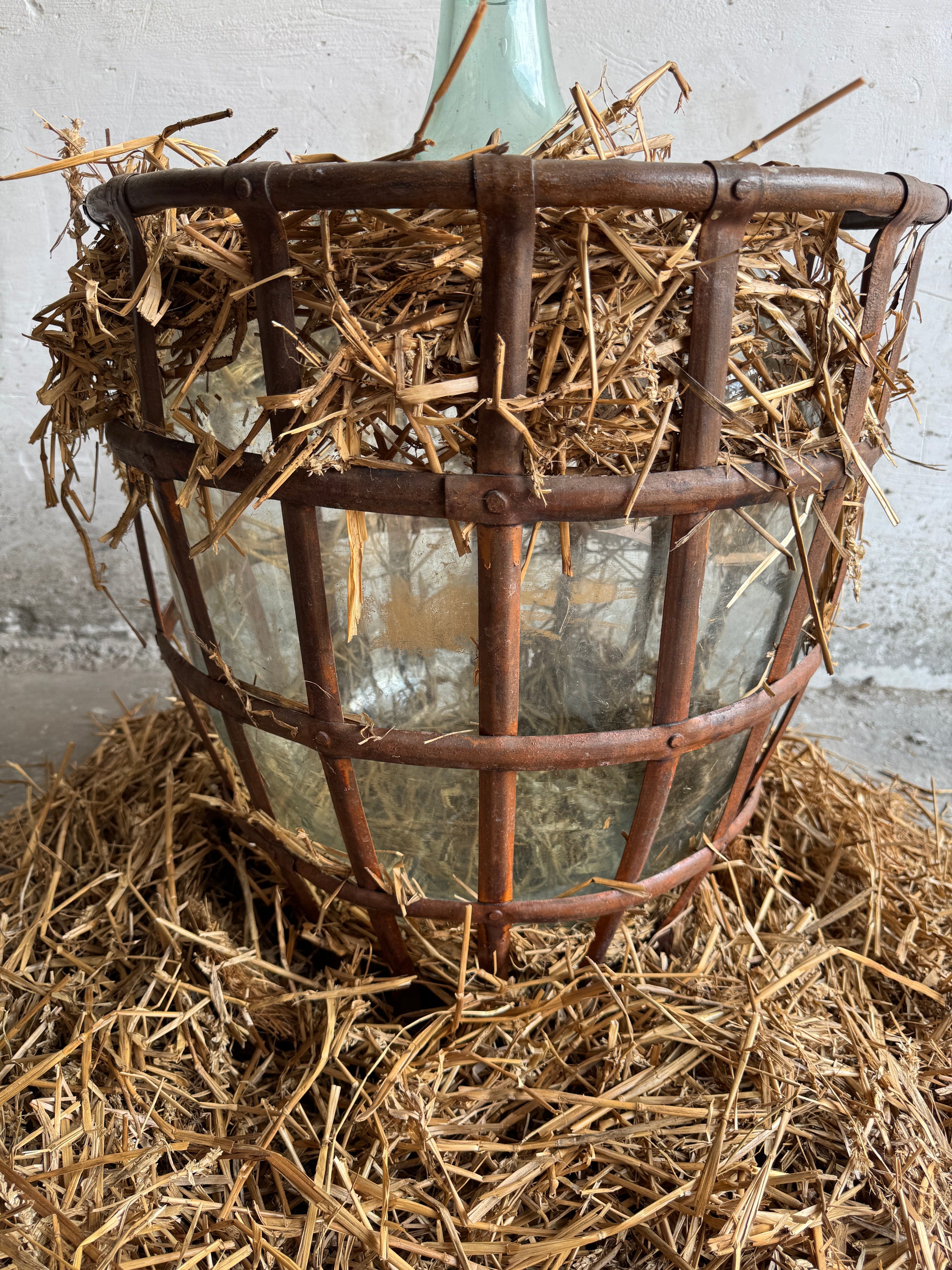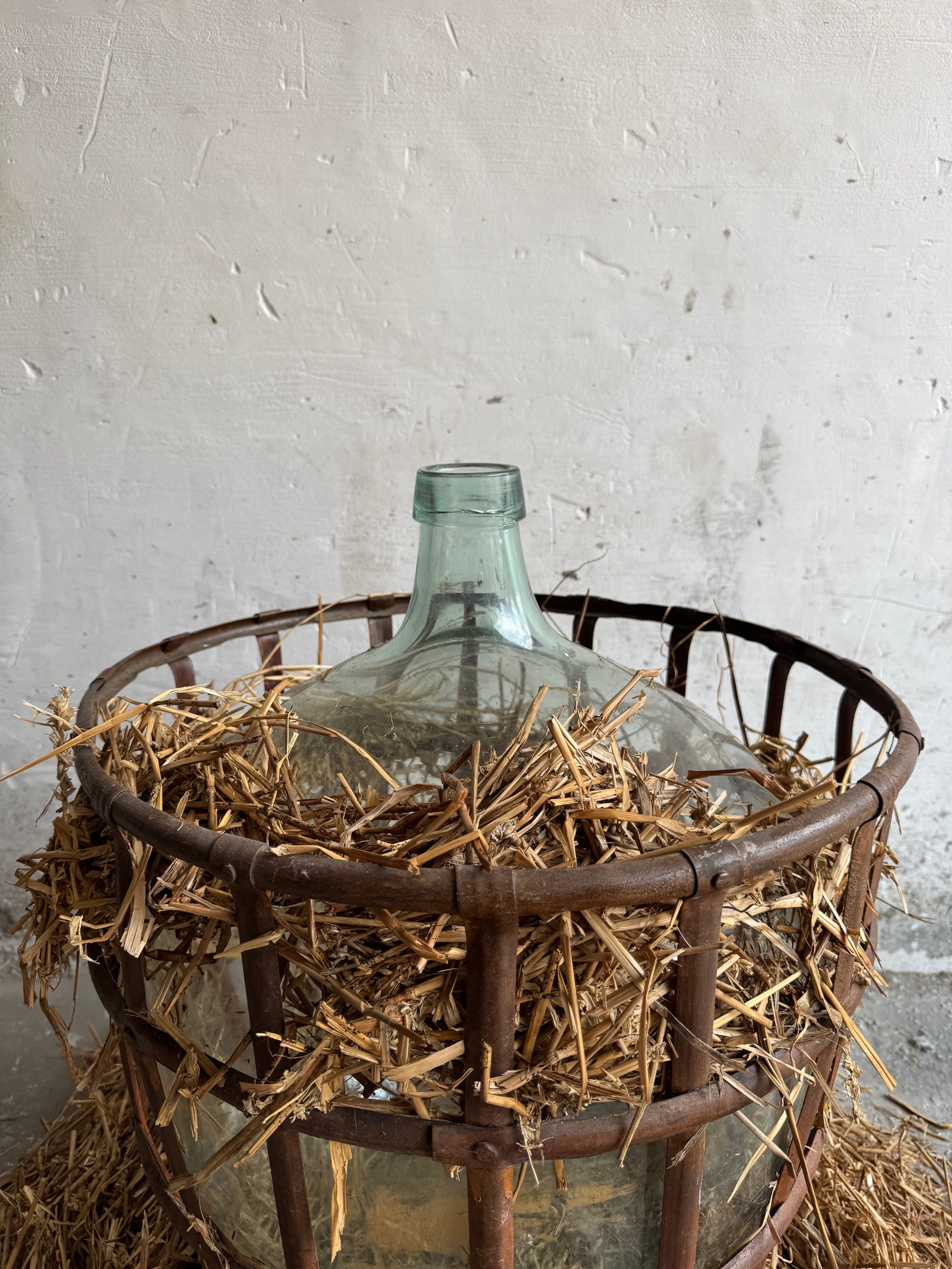 Large antique glass demijohn in a sturdy metal basket with original straw padding. Once used for wine storage and transport, now a striking decorative piece full of rustic charm.
