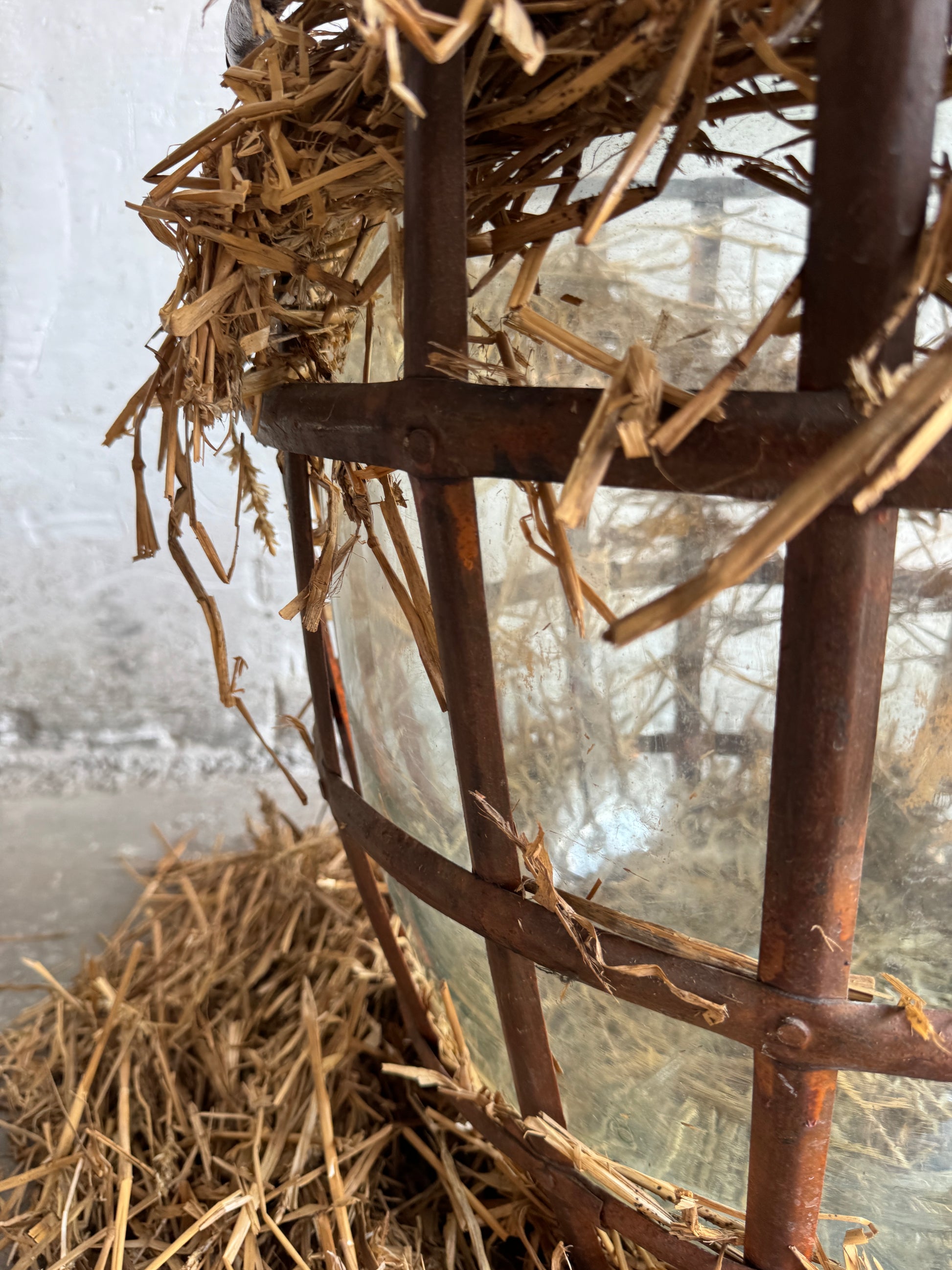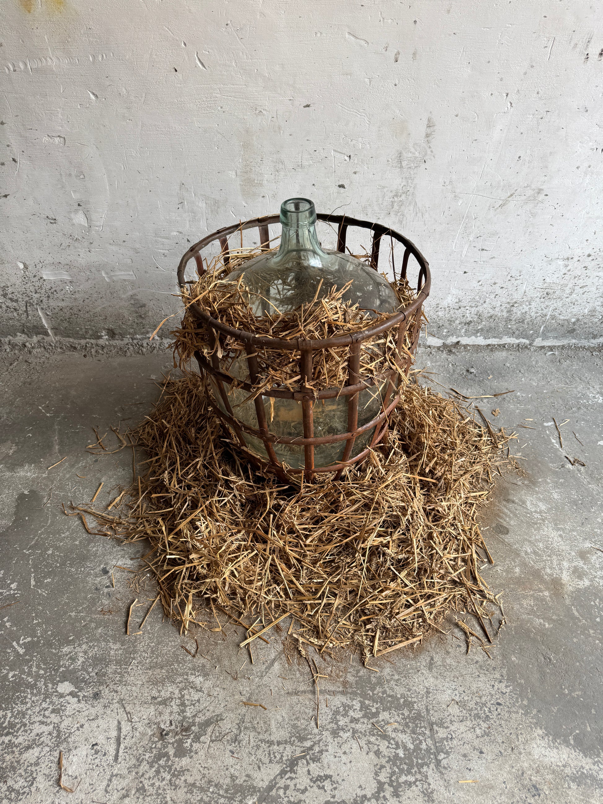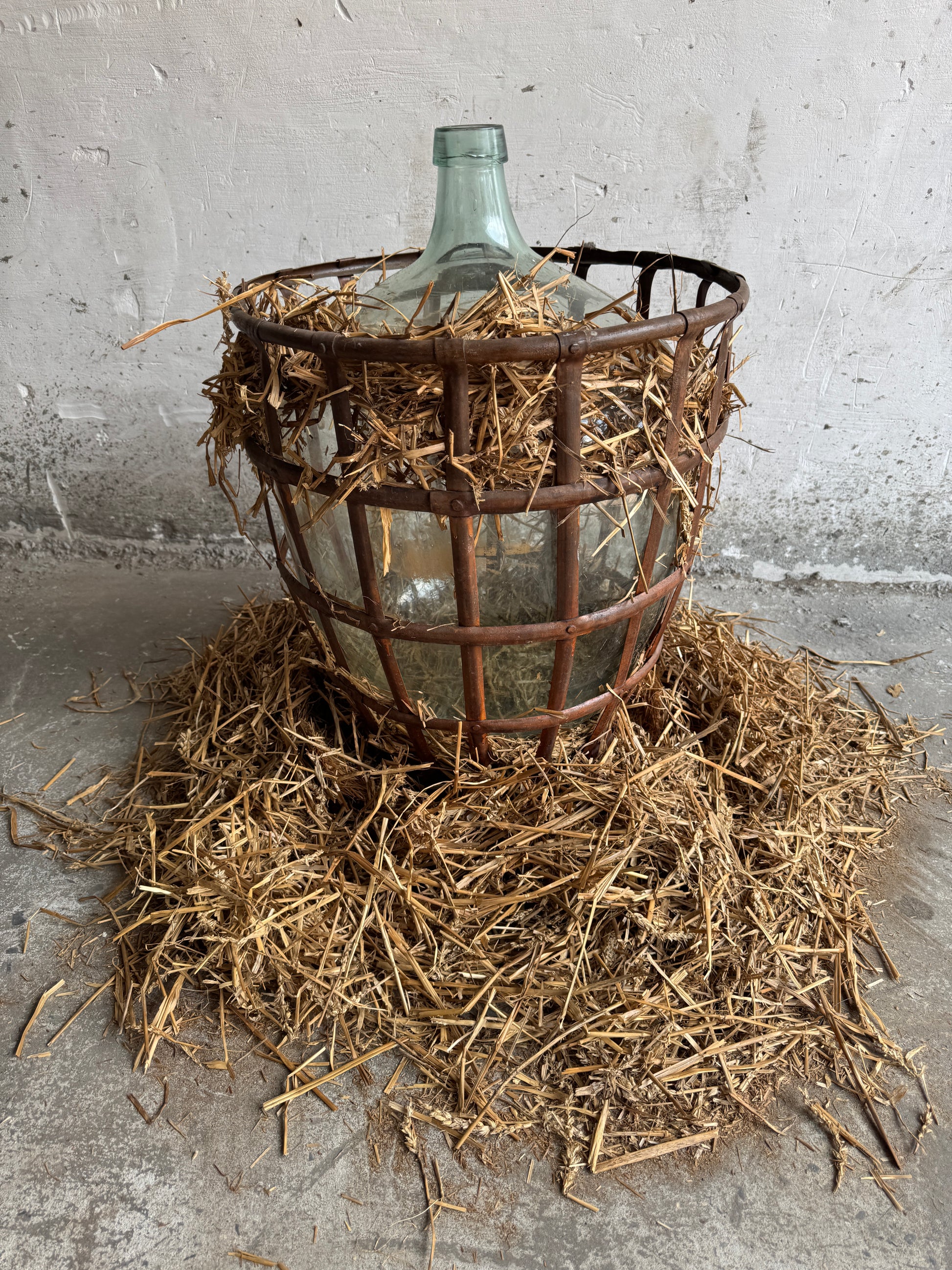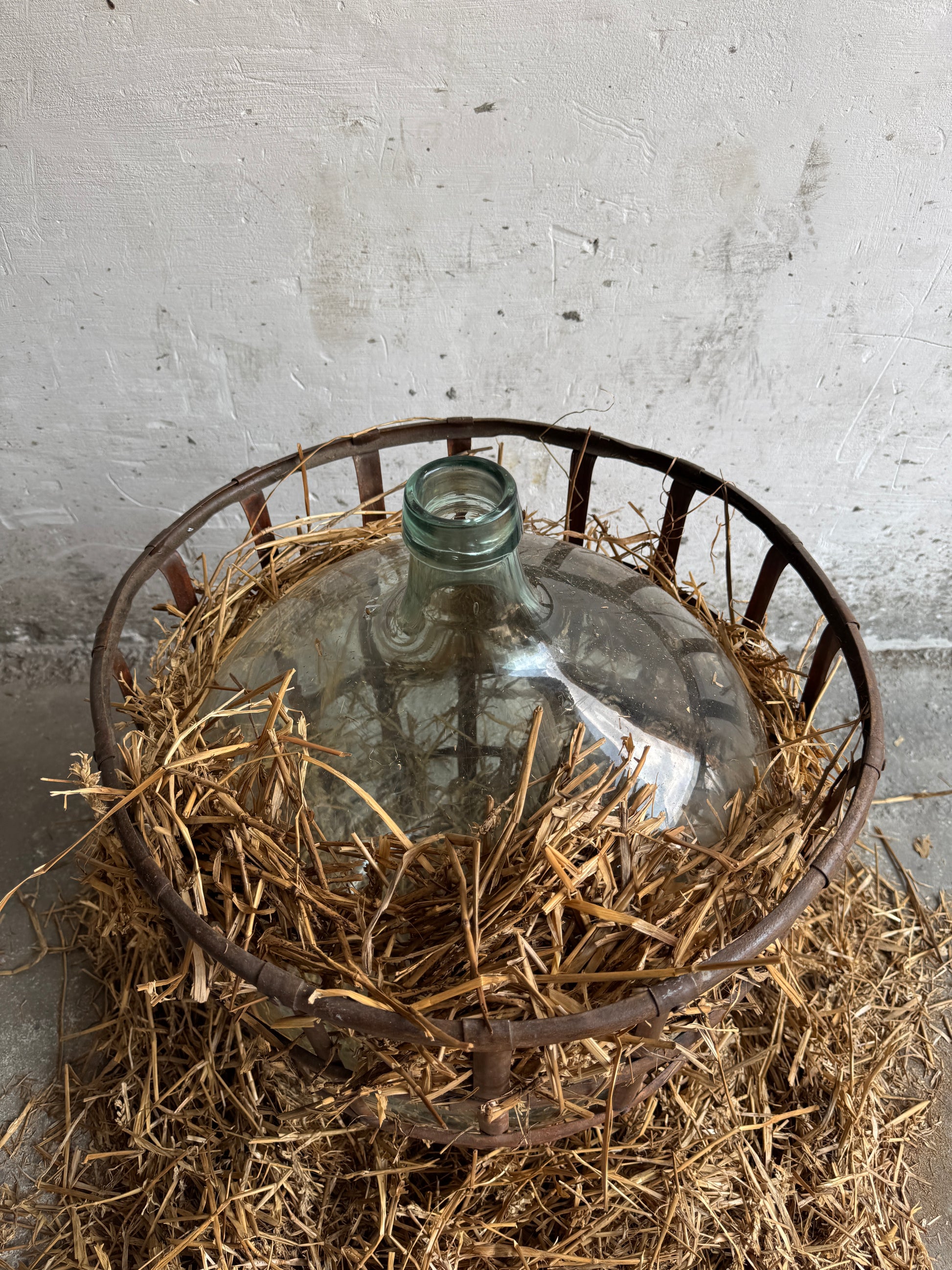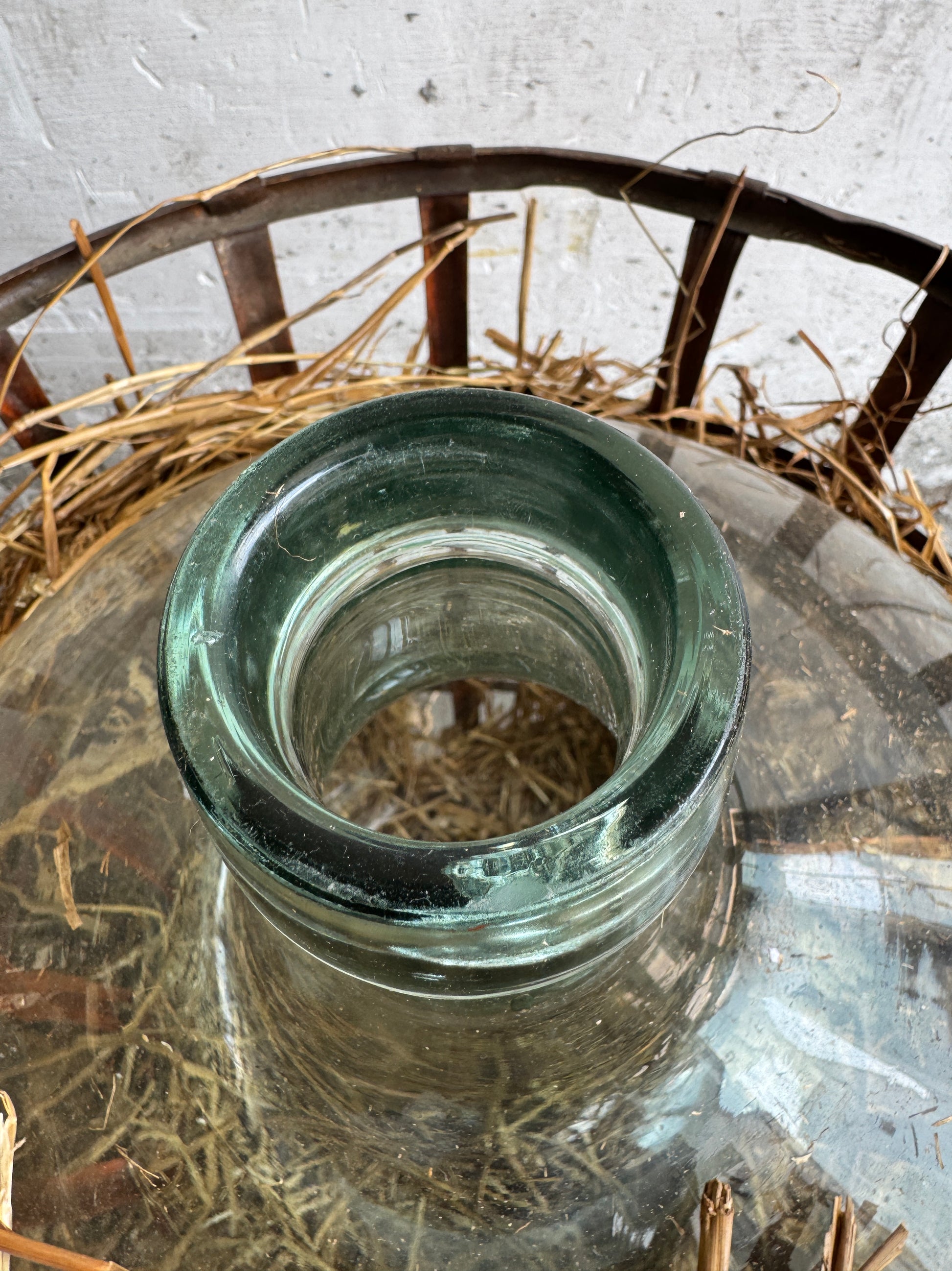 Large antique glass demijohn in a sturdy metal basket with original straw padding. Once used for wine storage and transport, now a striking decorative piece full of rustic charm.