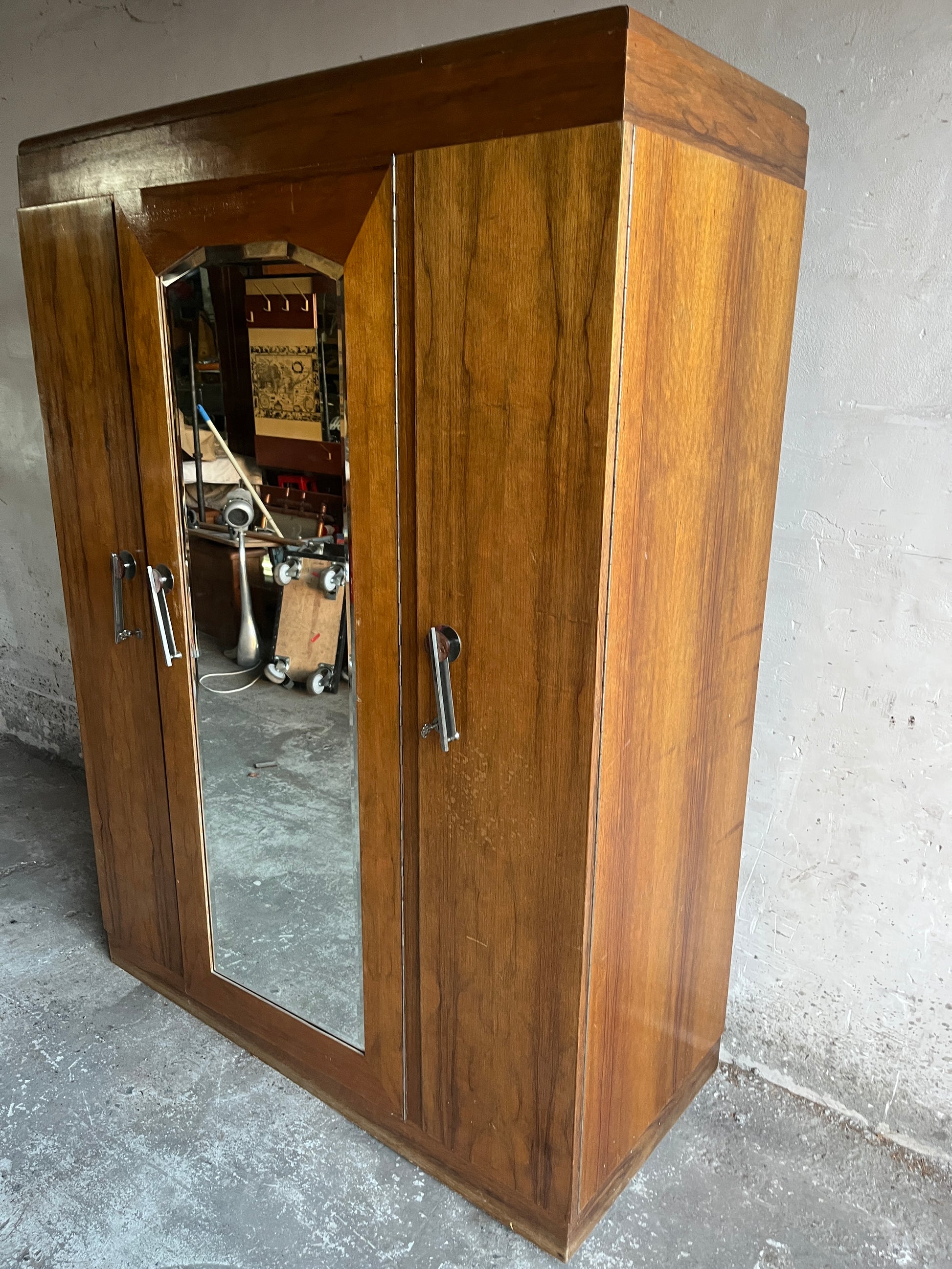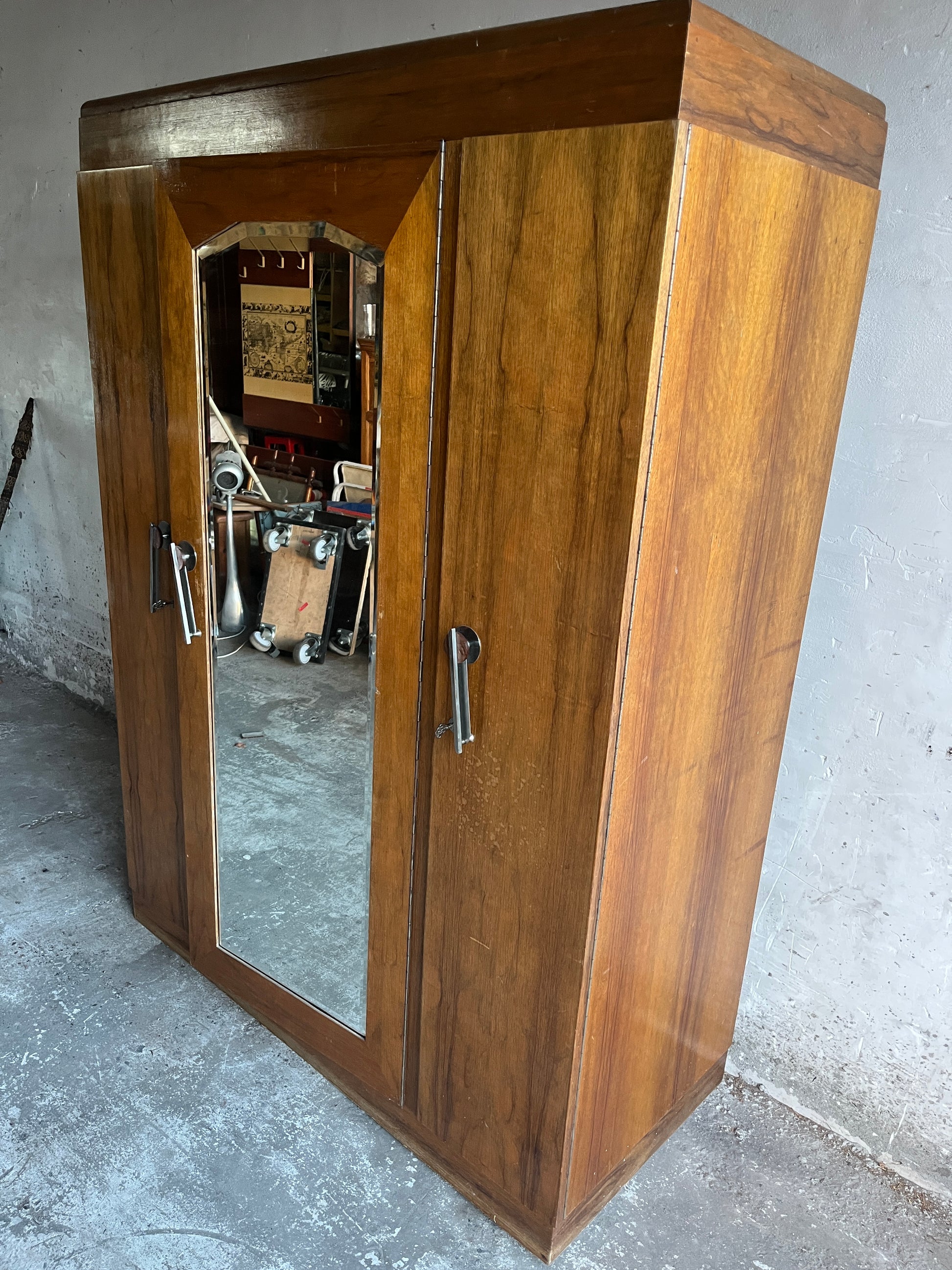 Beautiful Art Deco three-door wardrobe featuring a central bevelled mirror and original chrome handles. A timeless 1930s piece with elegant geometric lines and warm wood veneer.