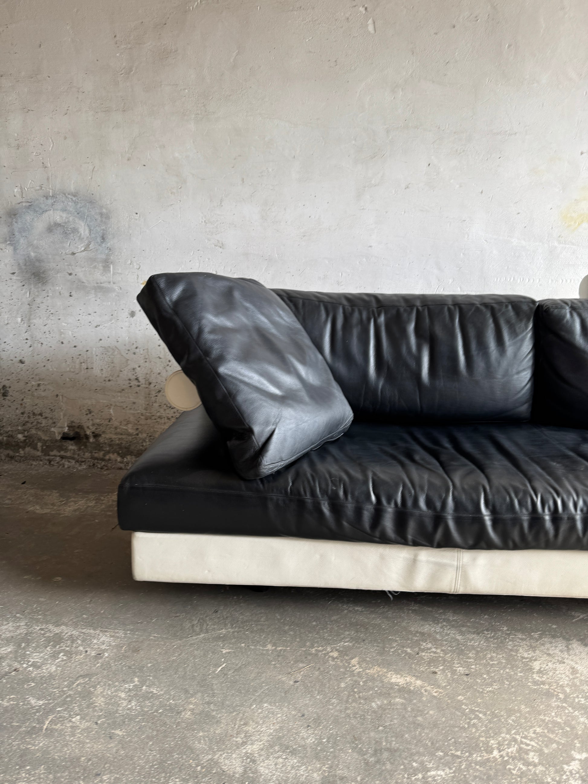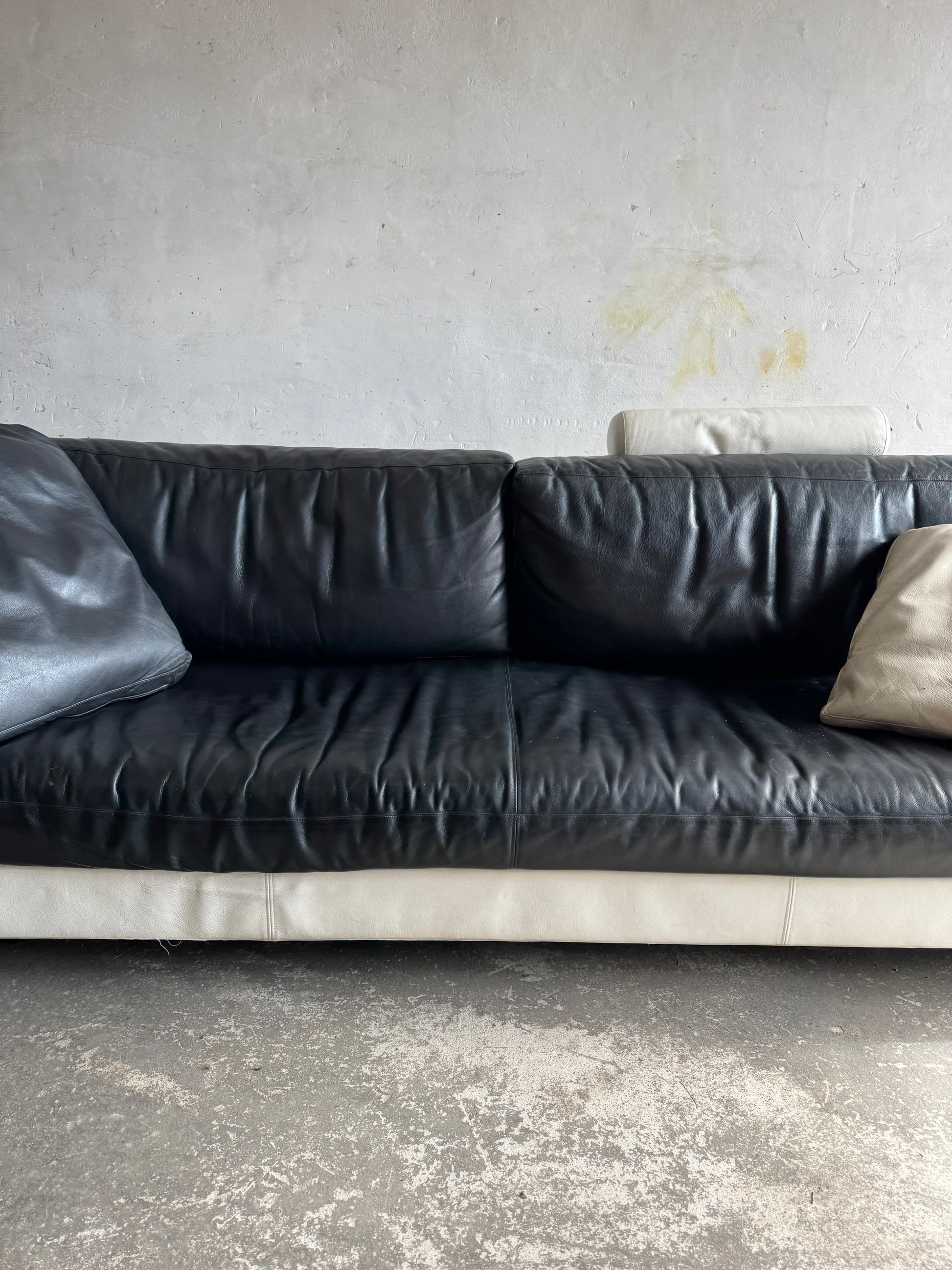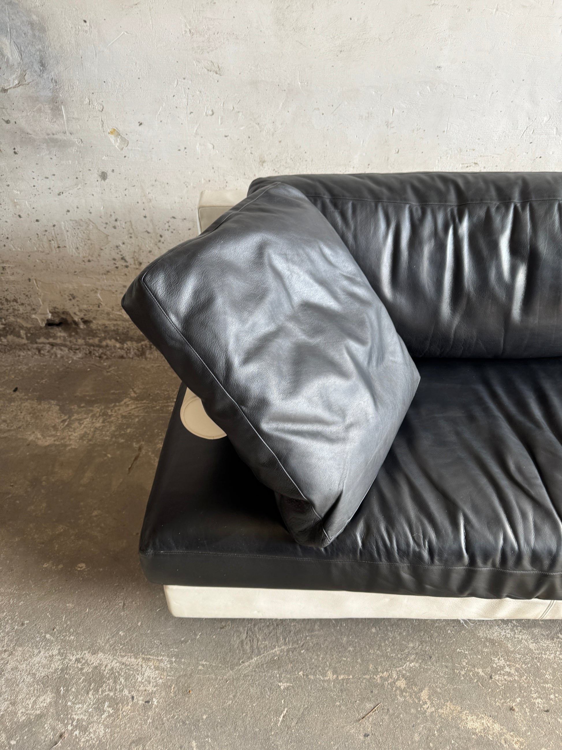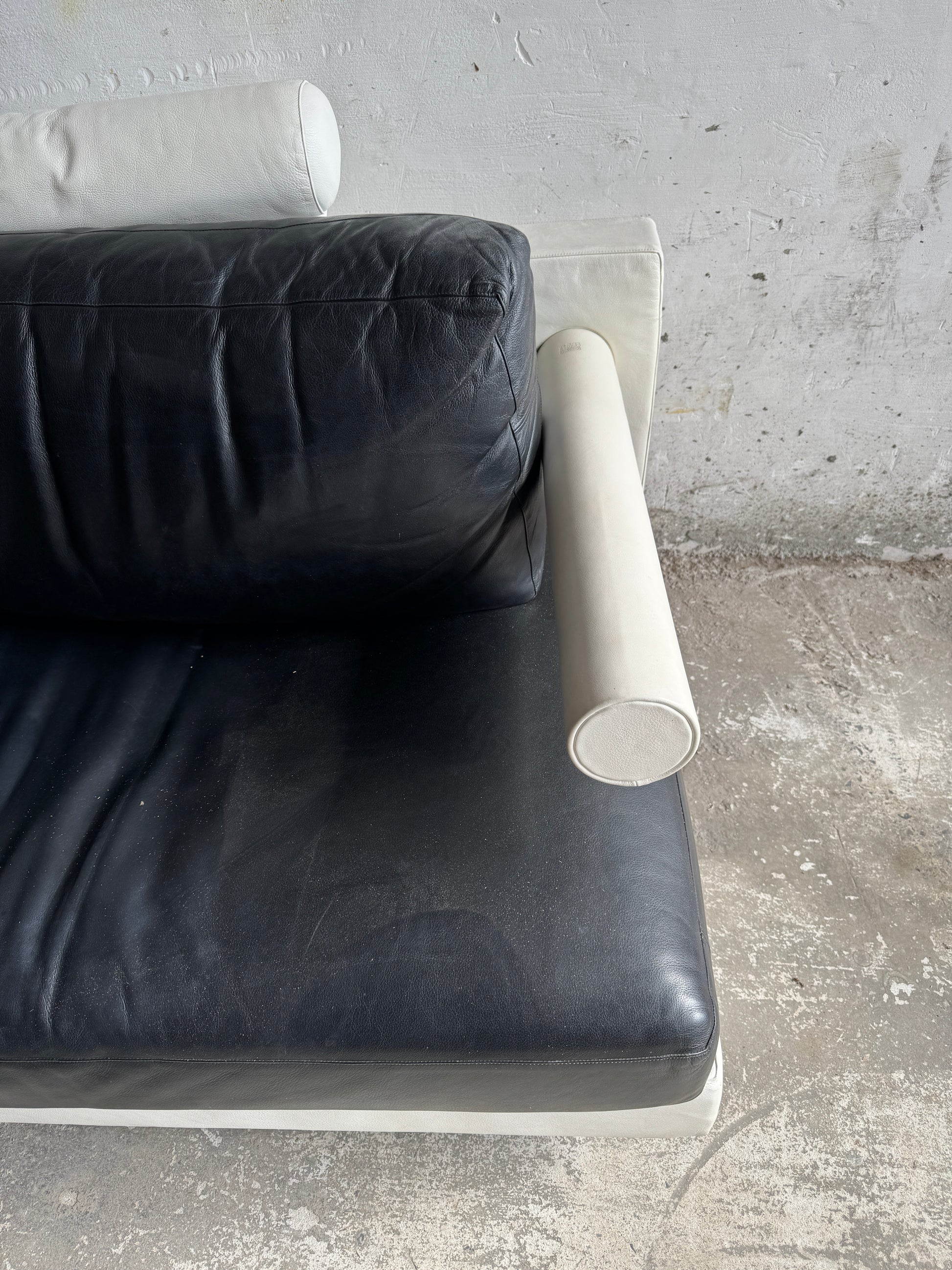 Stijlvolle en comfortabele tweezits designbank van BnB Italia, uitgevoerd in zwart leer met een contrasterend wit onderstel. Een elegant, strak vormgegeven meubelstuk dat perfect past in een eigentijds interieur.