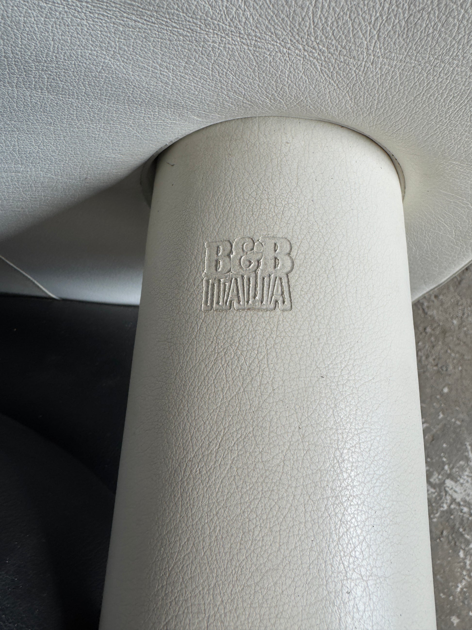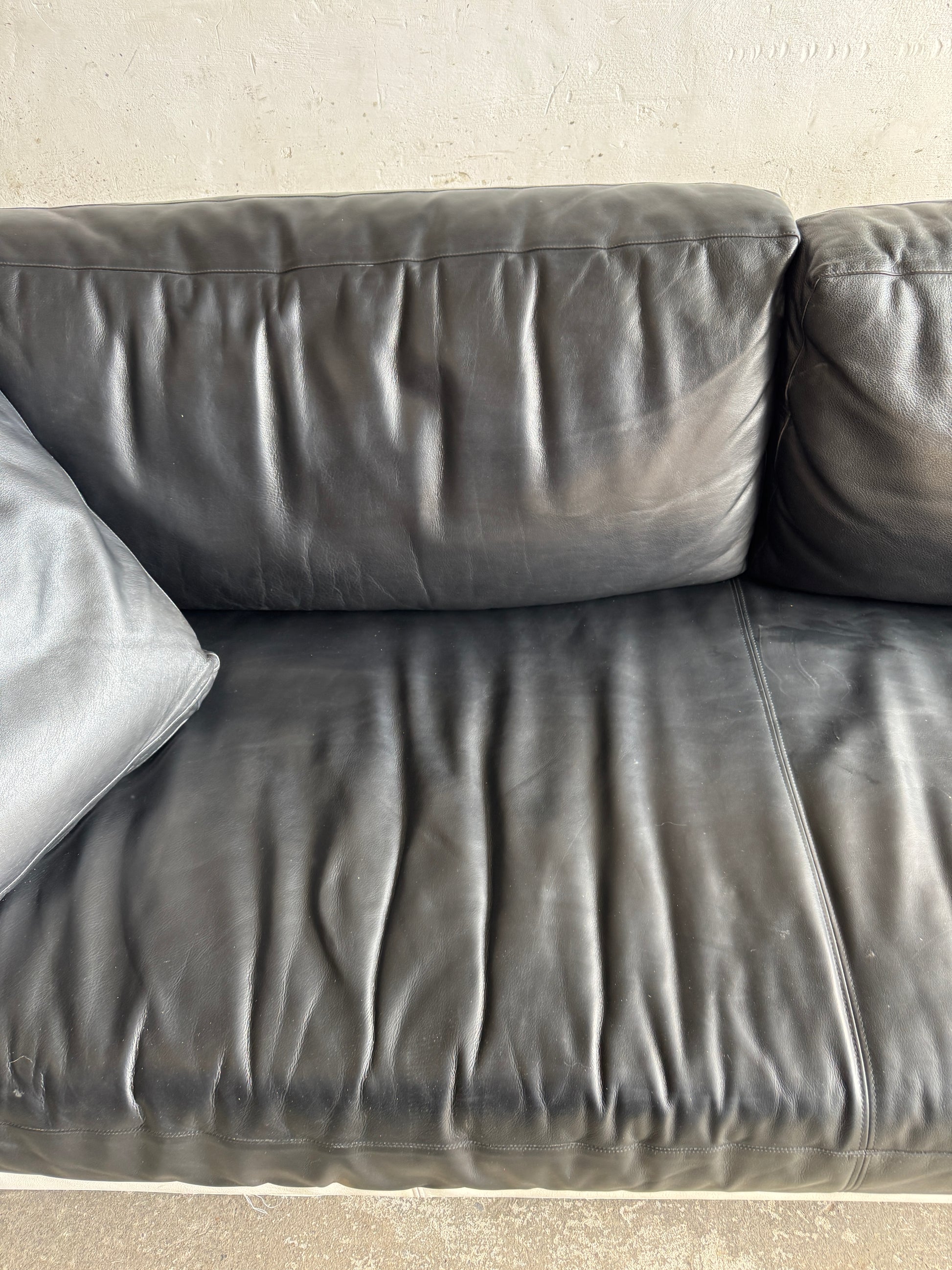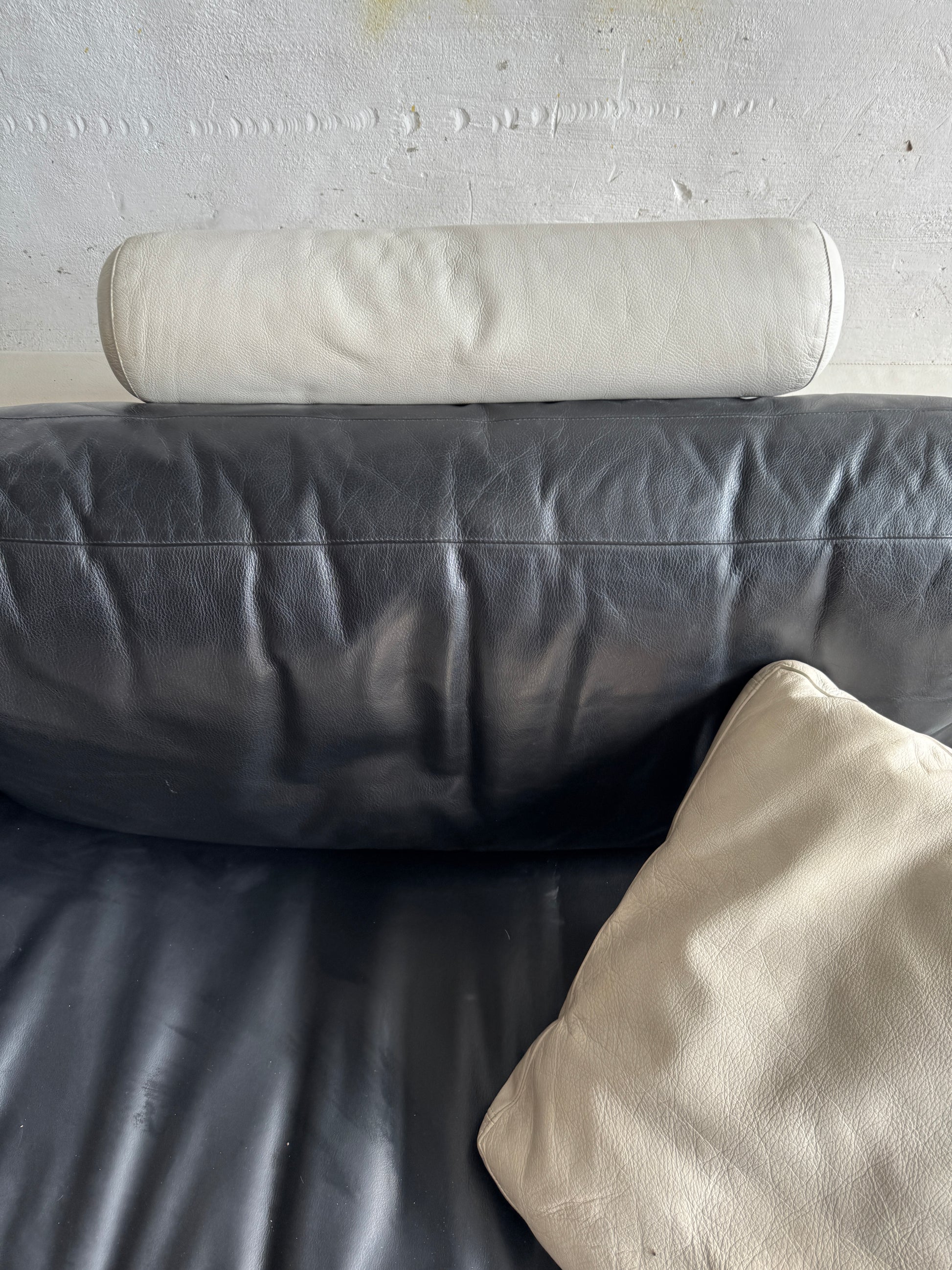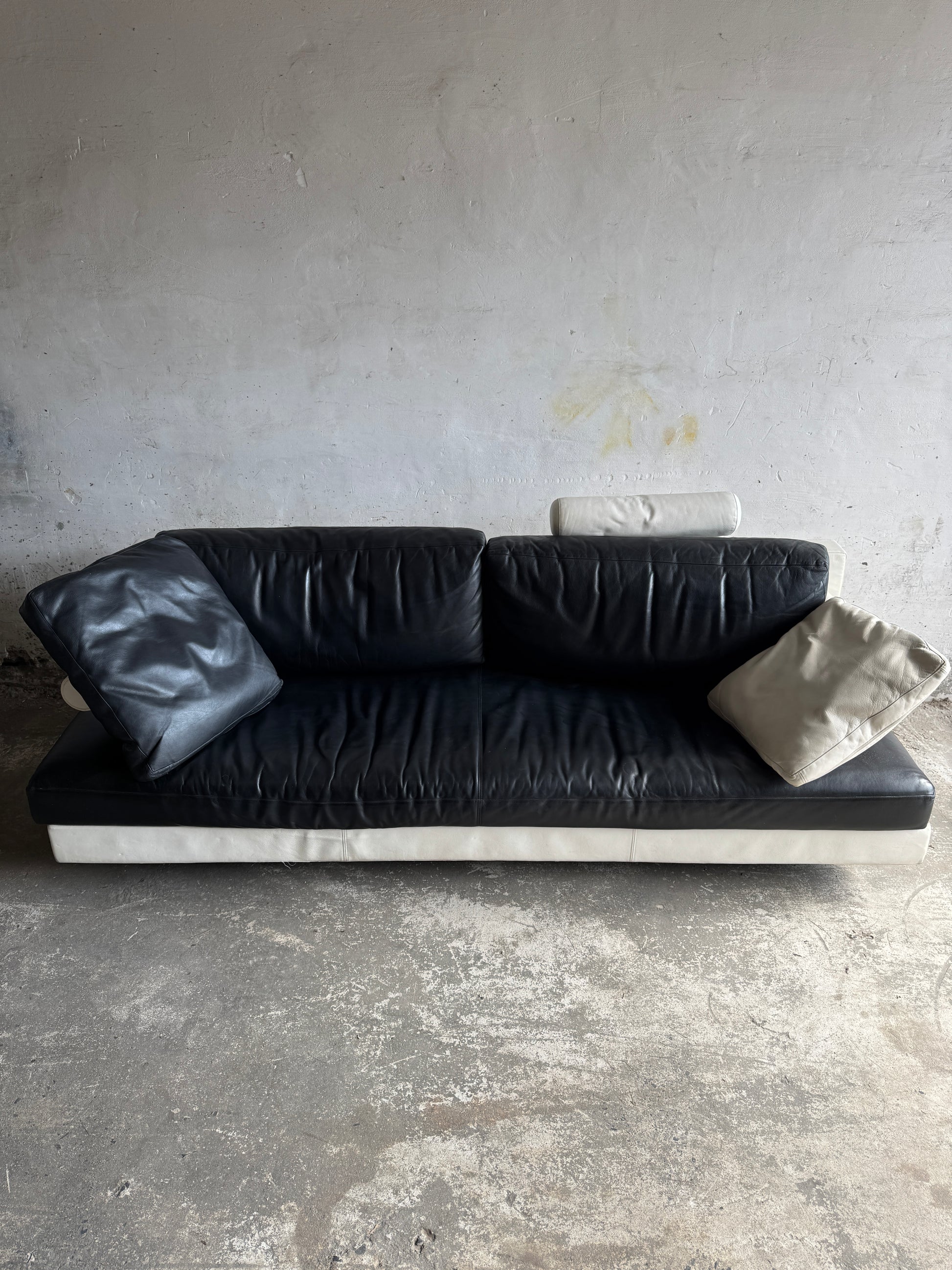 Stijlvolle en comfortabele tweezits designbank van BnB Italia, uitgevoerd in zwart leer met een contrasterend wit onderstel. Een elegant, strak vormgegeven meubelstuk dat perfect past in een eigentijds interieur.