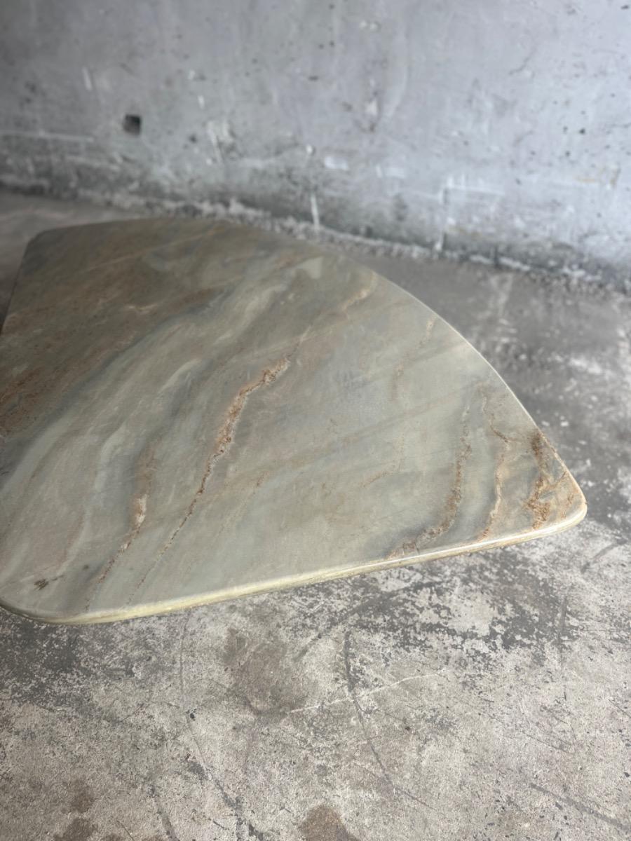 Deze sculpturale salontafel uit de jaren 1980 is uitgevoerd in zwaar stenen met een prachtige natuurlijke tekening. Het afgeronde blad in asymmetrische driehoekvorm roest op een massieve conische voet, wat het geheel een monumentaal en organisch karakter geeft.
