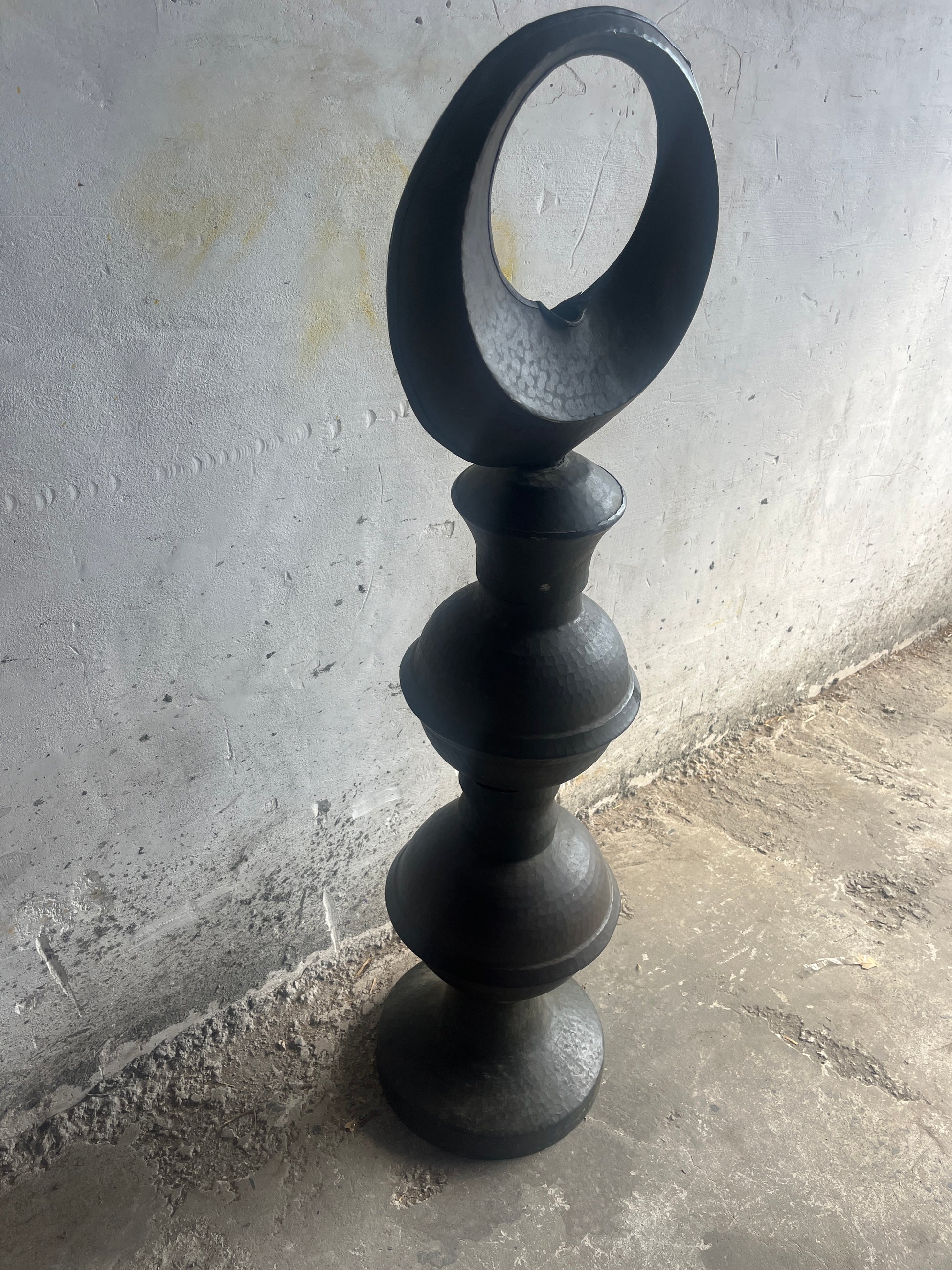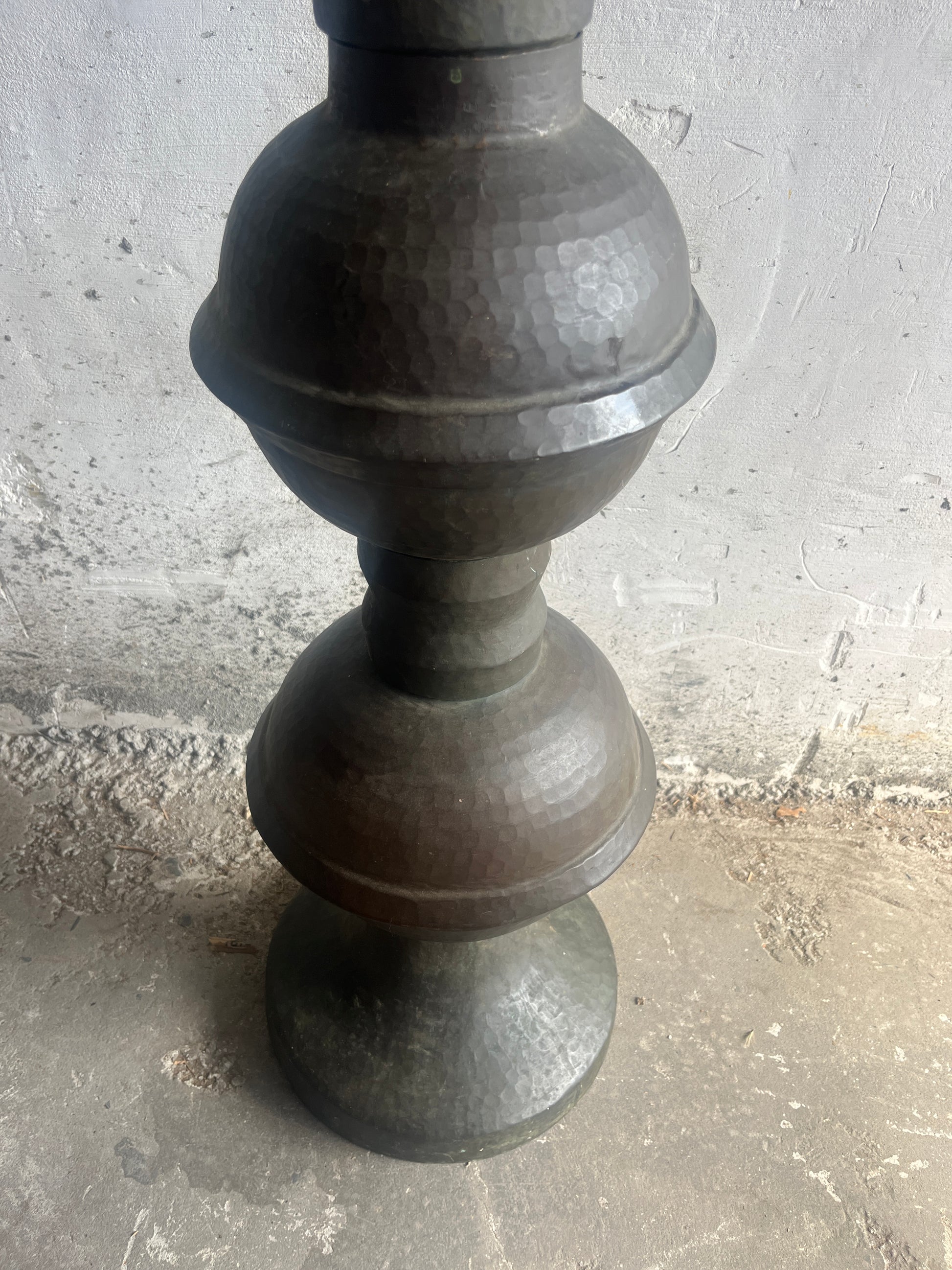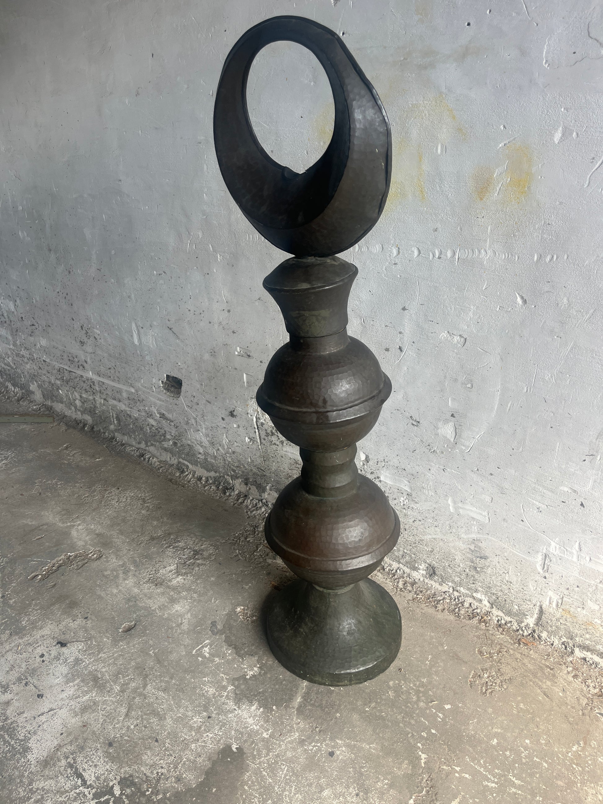 Unique hammered copper totem sculpture with open circular crest and pedestal base. A powerful decorative piece with strong brutalist character.