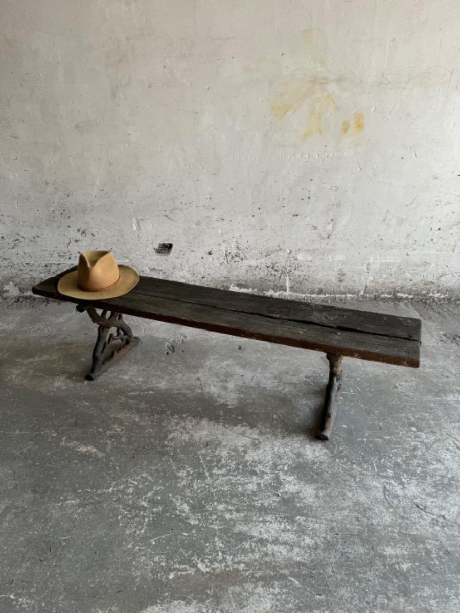 Antieke tuinbank met gietijzeren poten en verweerde houten zitting Deze karaktervolle tuinbank combineert een prachtig verweerde houten zitting met decoratieve gietijzeren poten. Het meubel ademt authenticiteit en is ideaal voor liefhebbers van rustieke tuinelementen met een industriële flair.