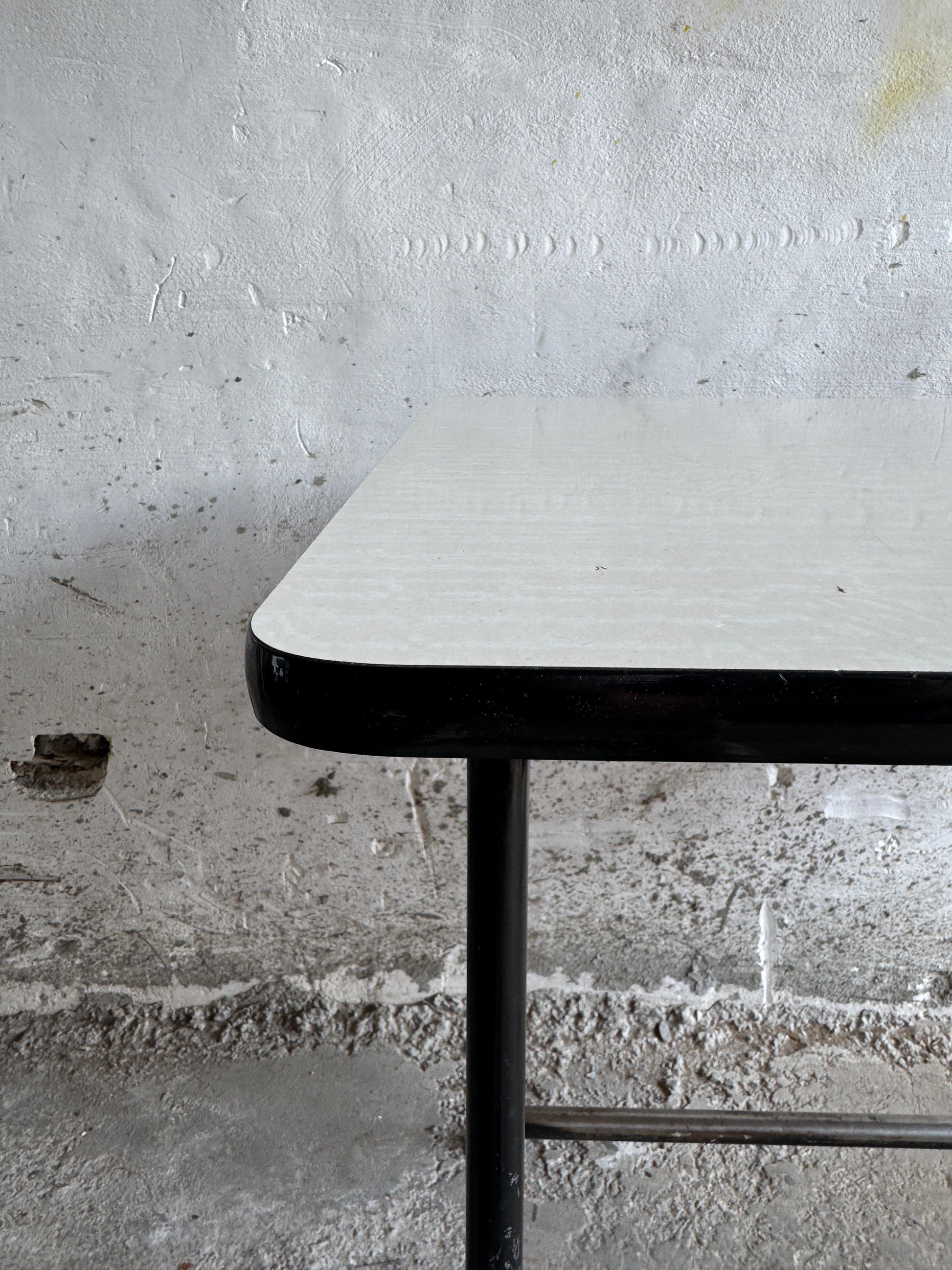 Een minimalistisch mid-century industrieel bureau dat functioneel design combineert met een ingetogen stijl. Het heeft een zwart buisvormig metalen frame en een rechthoekig gelamineerd tafelblad met een strakke zwarte rand. De houten ladekast met twee lades voegt warmte en contrast toe en biedt praktische opbergruimte zonder afbreuk te doen aan het strakke silhouet van het bureau.