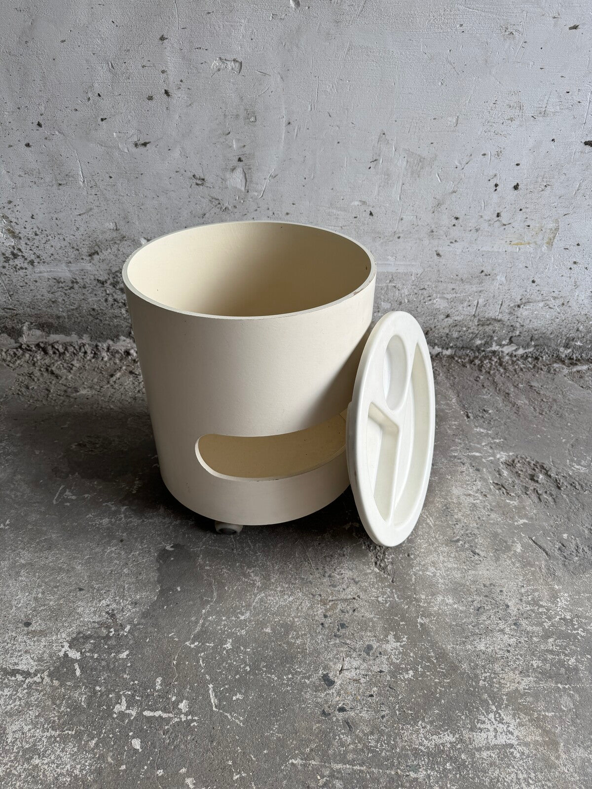 Deze multifunctionele designklassieker van Kartell combineert opberg- en serveerfuncties in één strak, cilindervormig meubelstuk. Het blad met geïntegreerde vakken is afneembaar en dient als dienblad, terwijl de holle behuizing extra opbergruimte biedt.