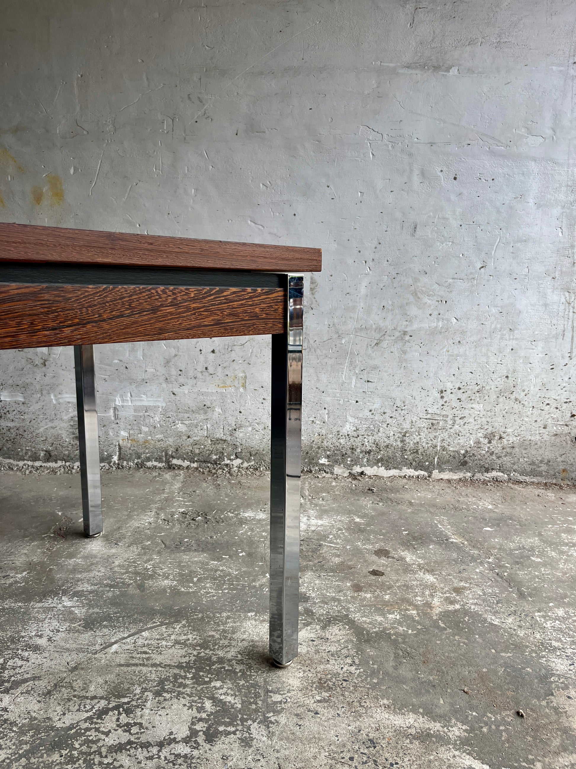 Elegant mid-century dining table featuring a richly grained wooden top and polished chrome legs. Crafted in Belgium during the 1960s–70s, this piece reflects timeless modernist design and fine craftsmanship.