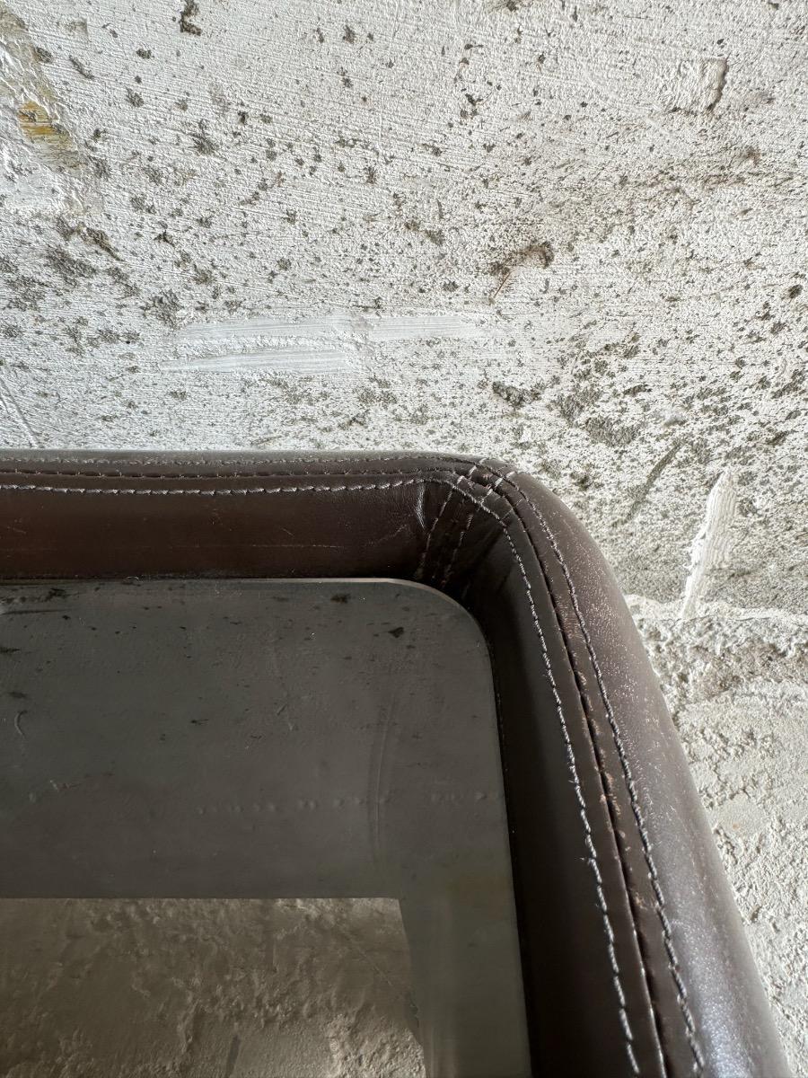 Elegante Mid-Century salontafel met leer en glas Deze elegante salontafel uit het midden van de 20e eeuw combineert luxe materialen met functioneel design. Het meubel is bekleed met hoogwaardig leer en heeft een glazen blad, wat bijdraagt aan een verfijnde en moderne uitstraling. Dankzij de geïntegreerde wielen is de tafel gemakkelijk te verplaatsen, wat zorgt voor flexibiliteit in uw interieur.