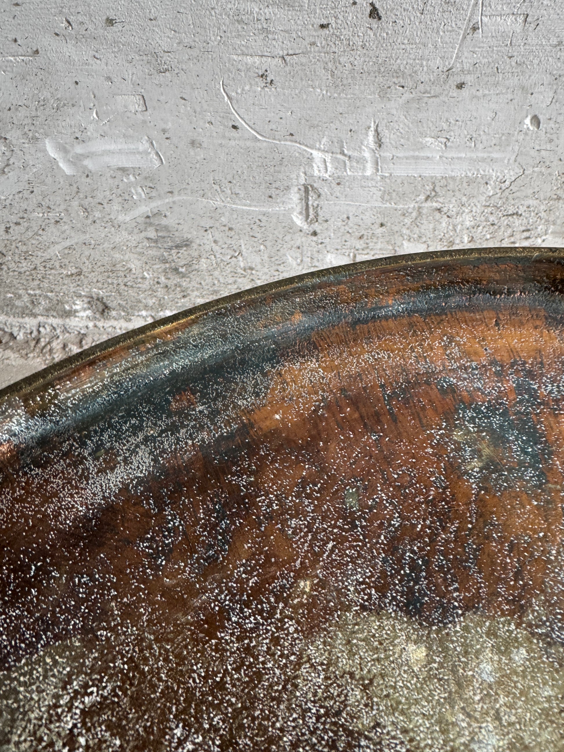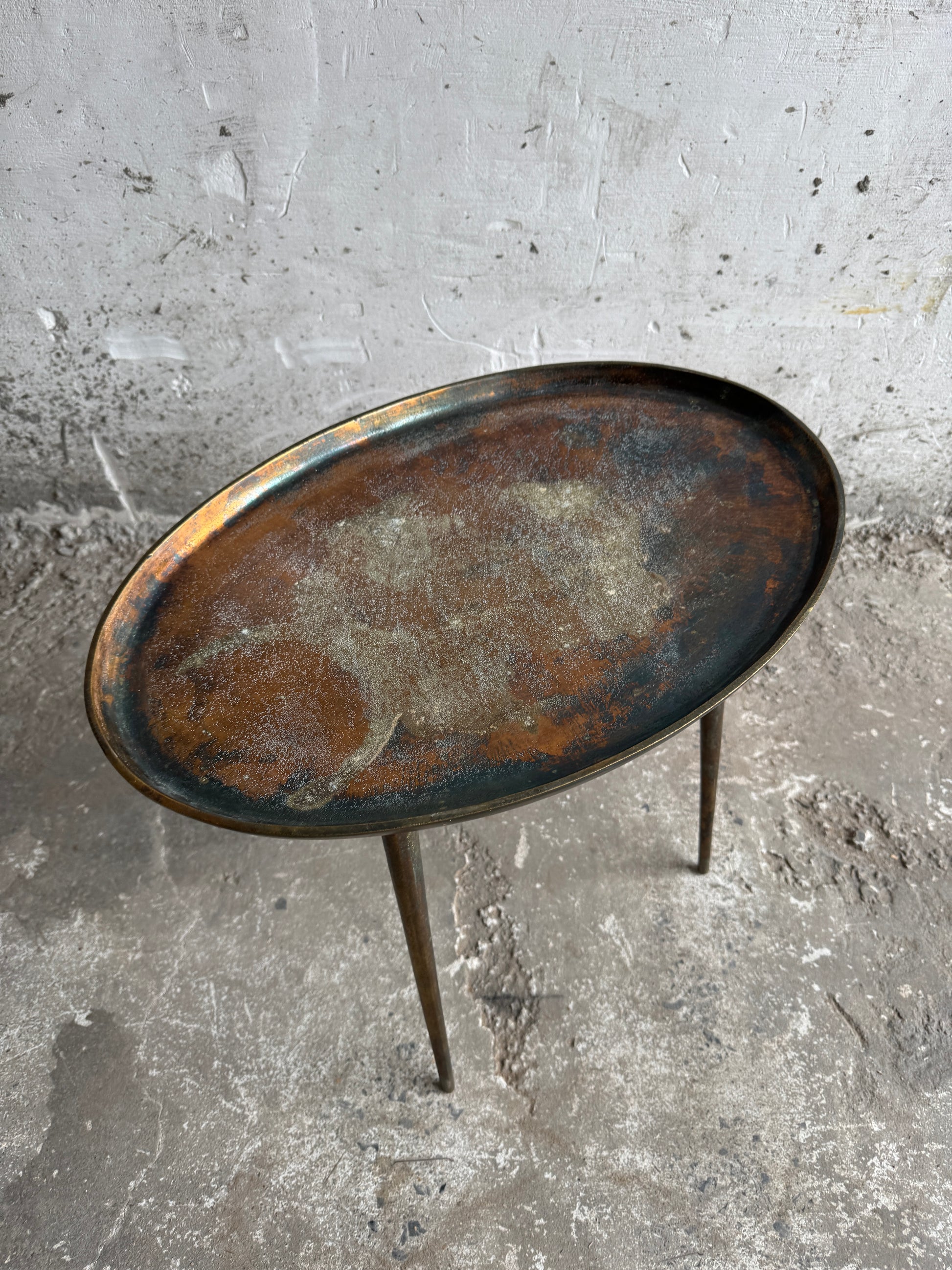 Deze elegante mid-century bijzettafel heeft een ondiep ovaal messing blad met een licht verouderde patina en staat op drie slanke, taps toelopende poten. Het meubelstuk is waarschijnlijk van Italiaanse oorsprong en legt het verfijnde minimalisme van het modernistische design uit de jaren 50 vast, terwijl het een rijke, verweerde textuur toevoegt.
