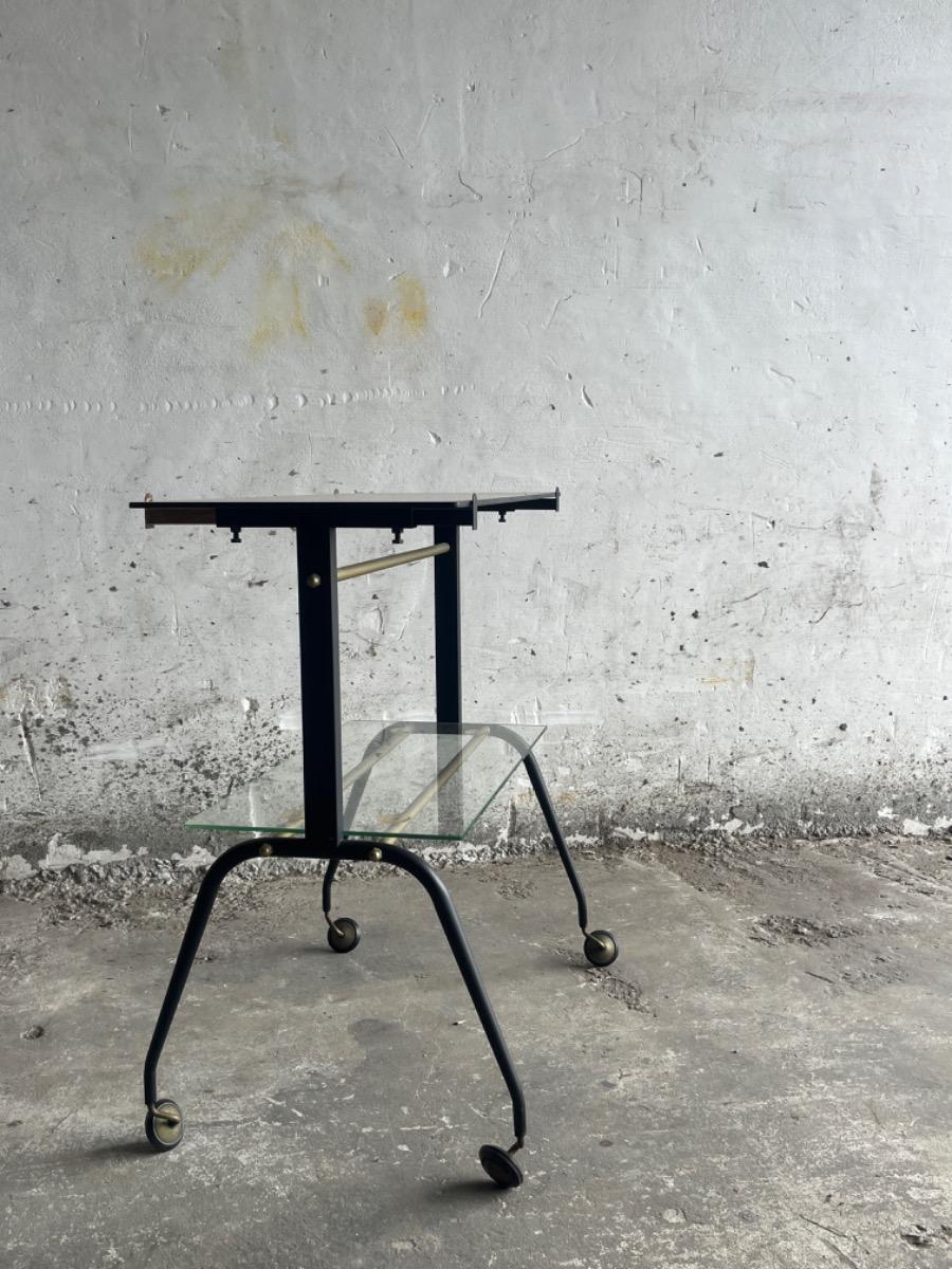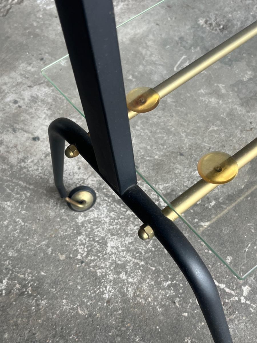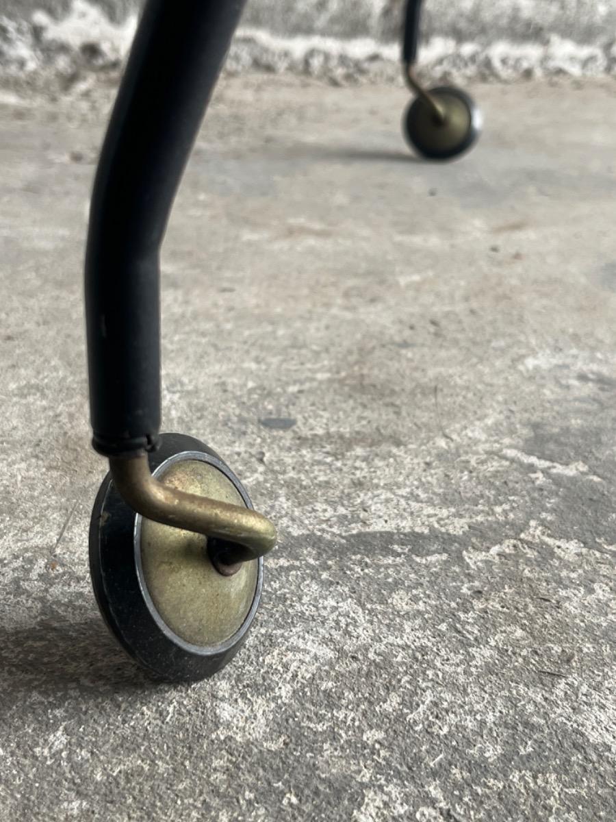 Deze uitzonderlijke trolley uit de jaren 50-60 combineert elegant messing met zwart metaal en glazen planken. Het meest opvallende element is de basis met gebogen poten en kleine wieltjes, die doet denken aan een insectachtig beeldhouwwerk – luchtig maar toch karaktervol.