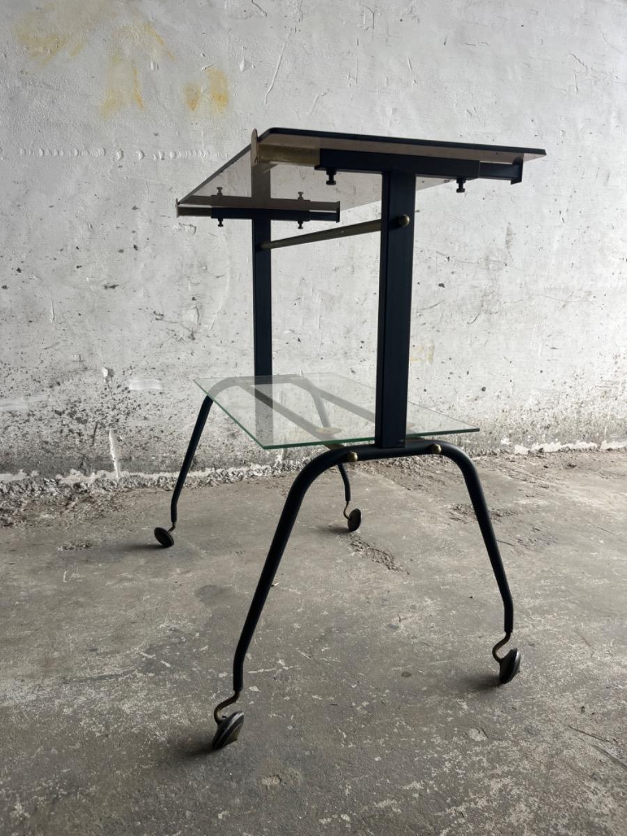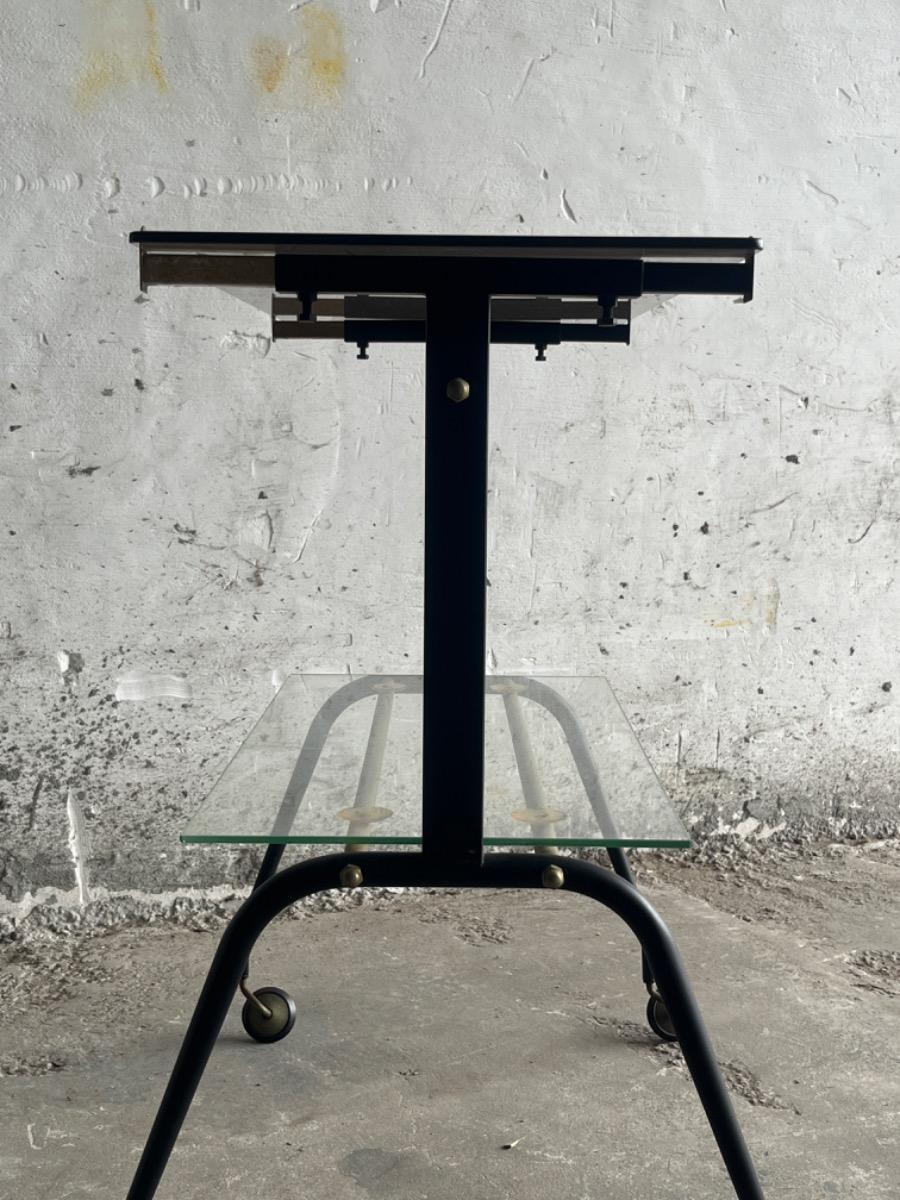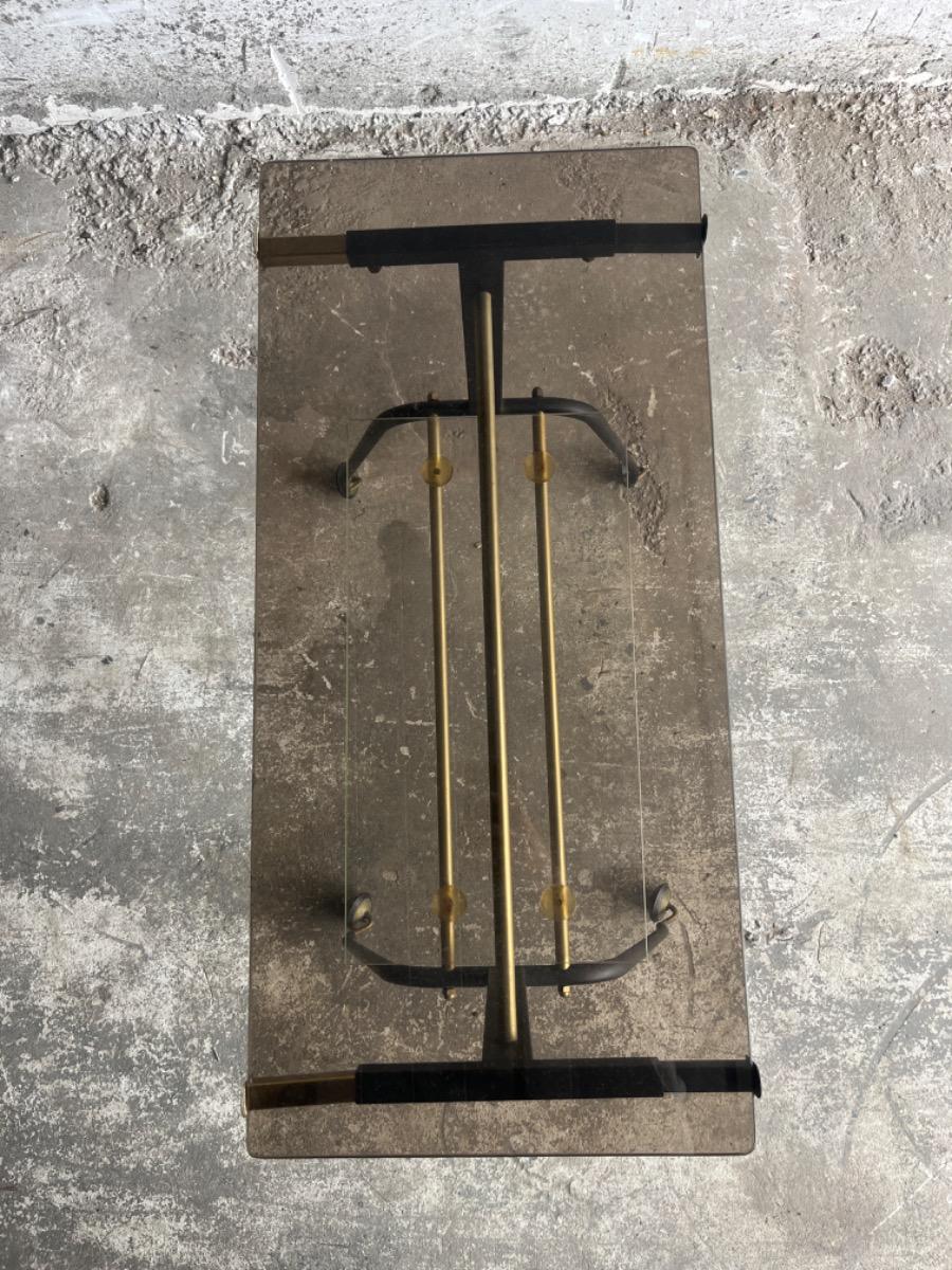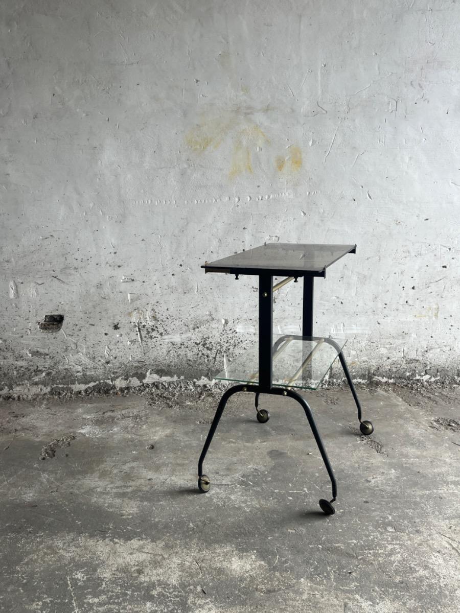 Deze uitzonderlijke trolley uit de jaren 50-60 combineert elegant messing met zwart metaal en glazen planken. Het meest opvallende element is de basis met gebogen poten en kleine wieltjes, die doet denken aan een insectachtig beeldhouwwerk – luchtig maar toch karaktervol.