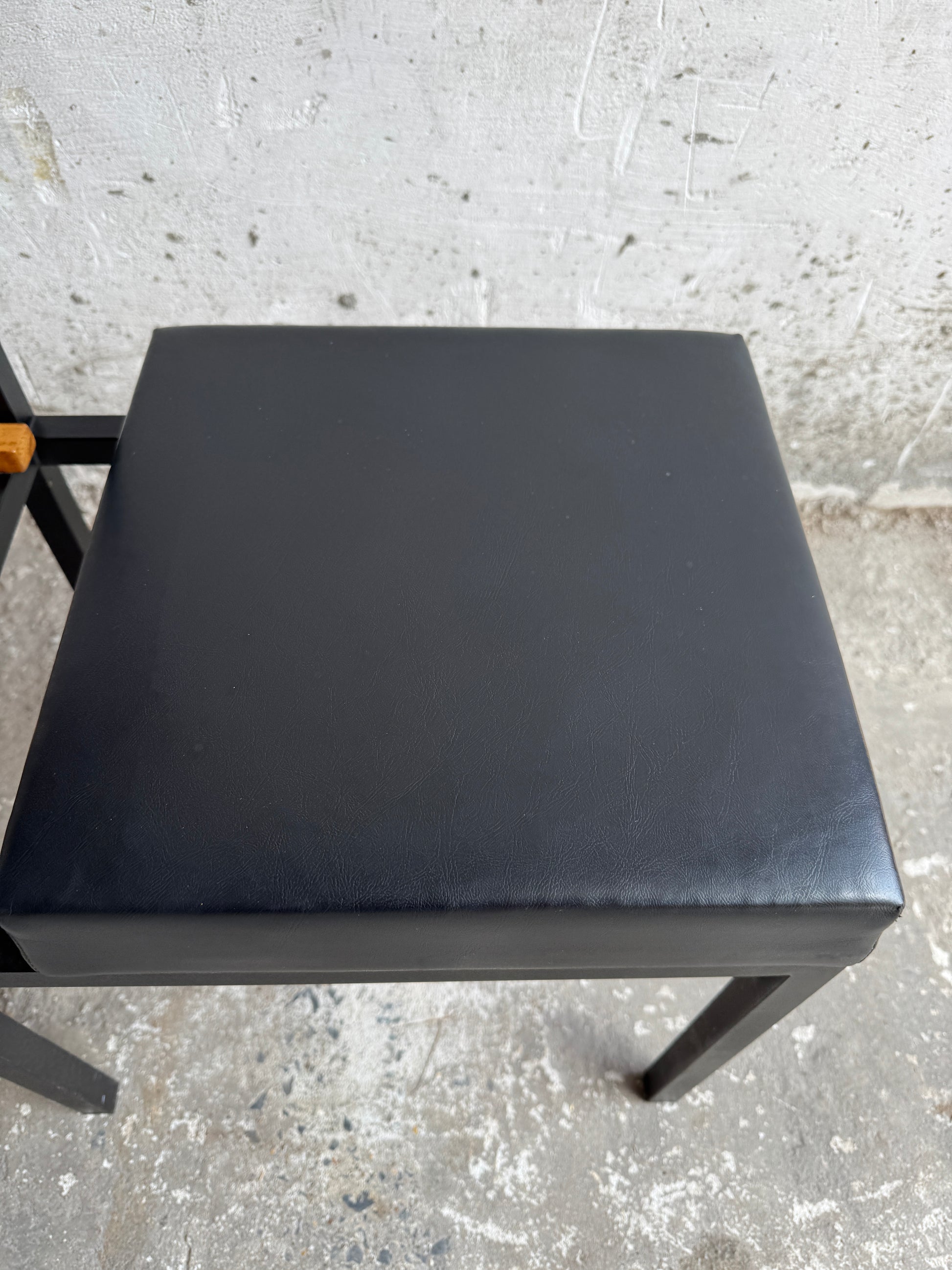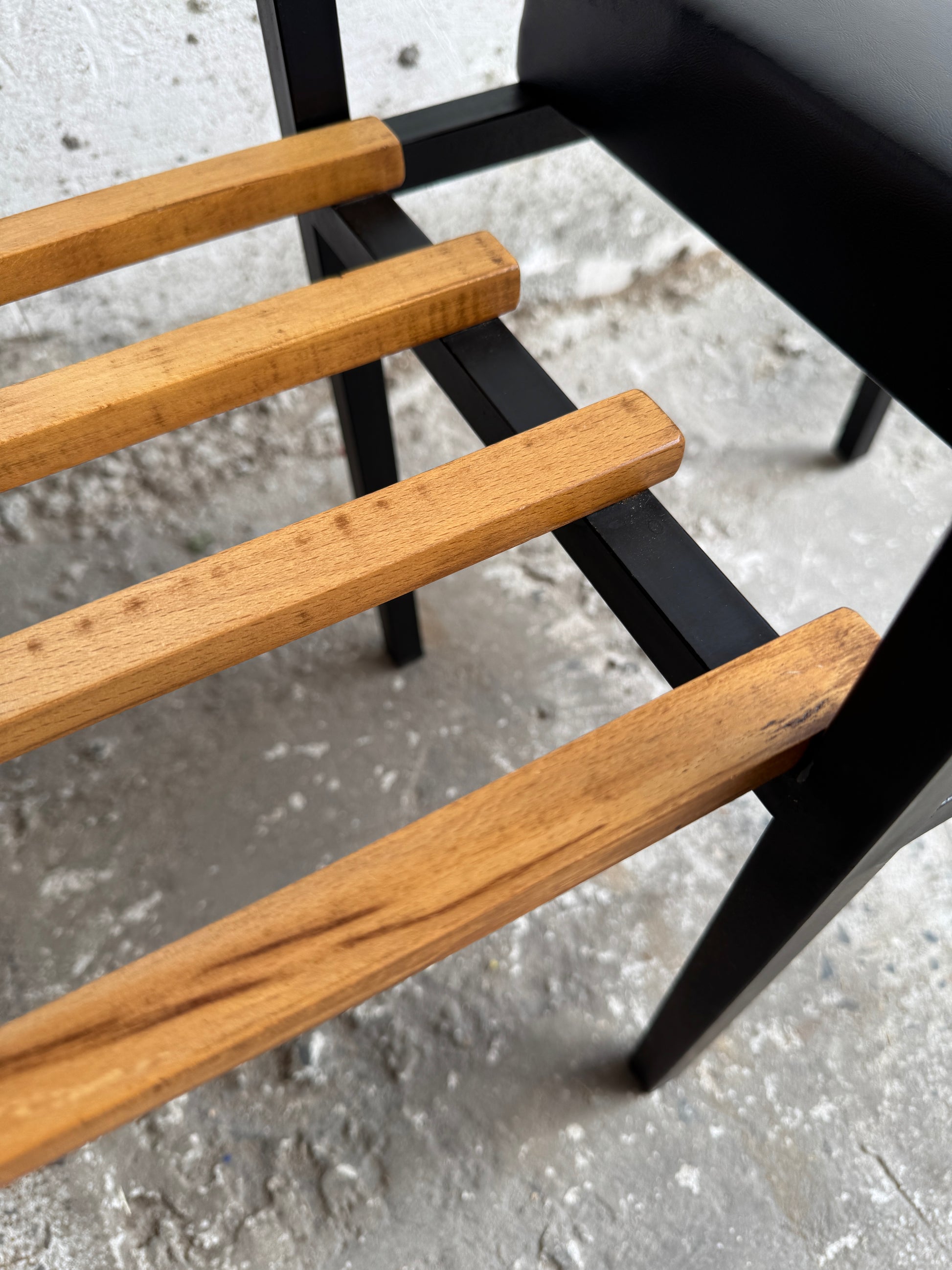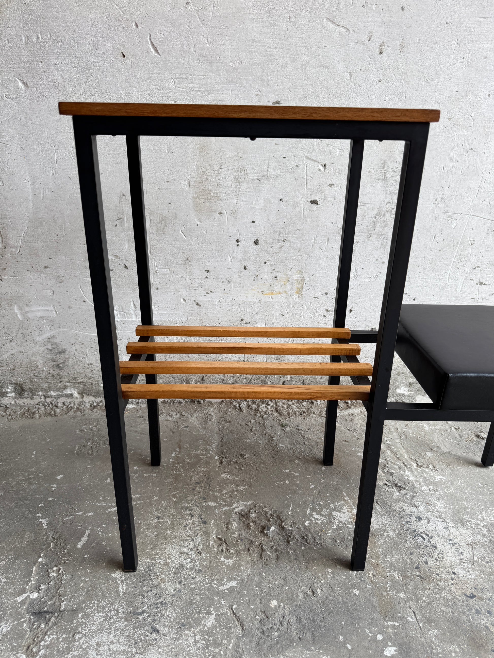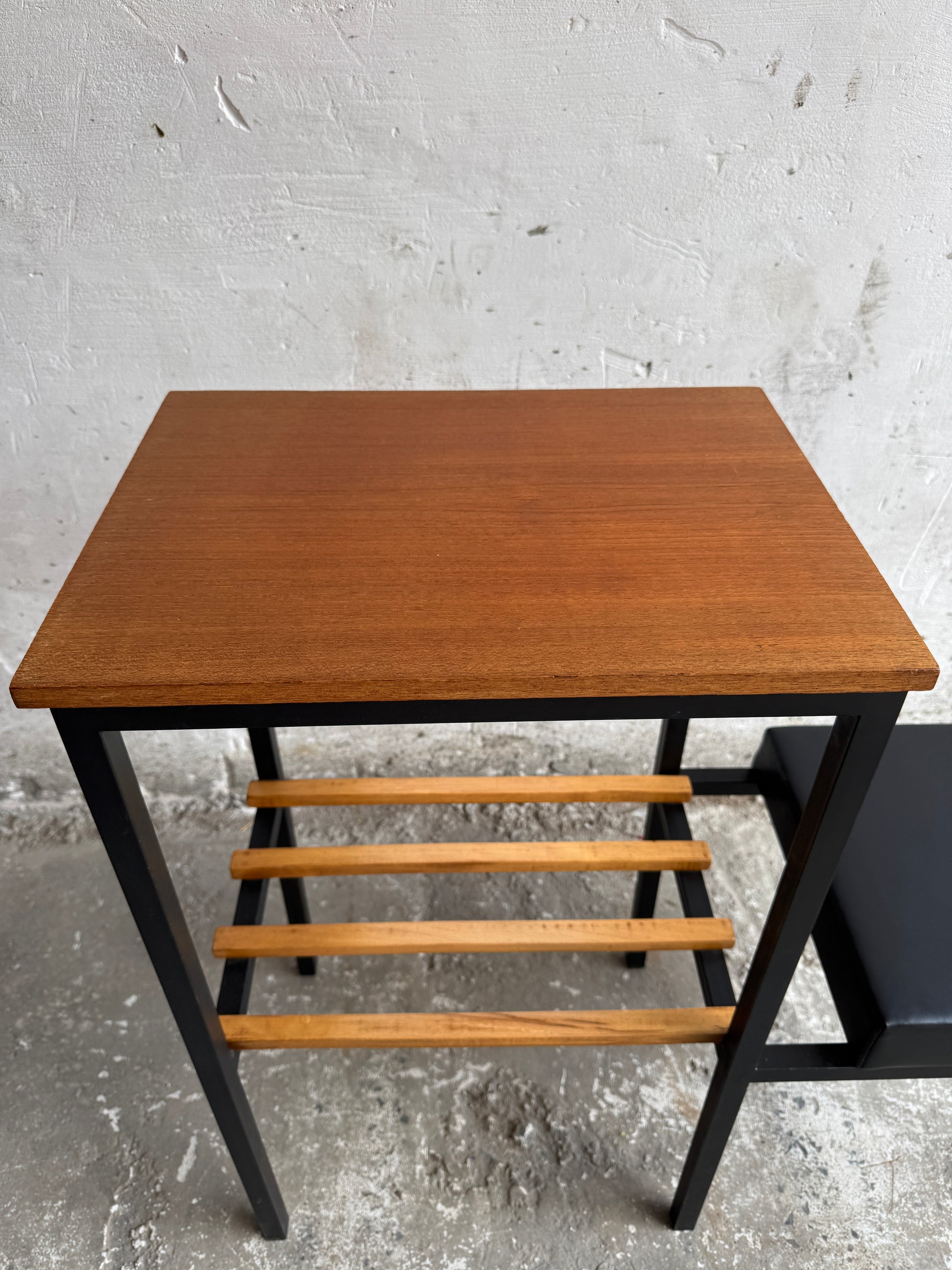 A stylish mid-century modern side table featuring a teak top and an integrated wooden slat magazine rack. The clean black metal frame contrasts beautifully with the warm wood tones, making it a versatile piece for any interior.