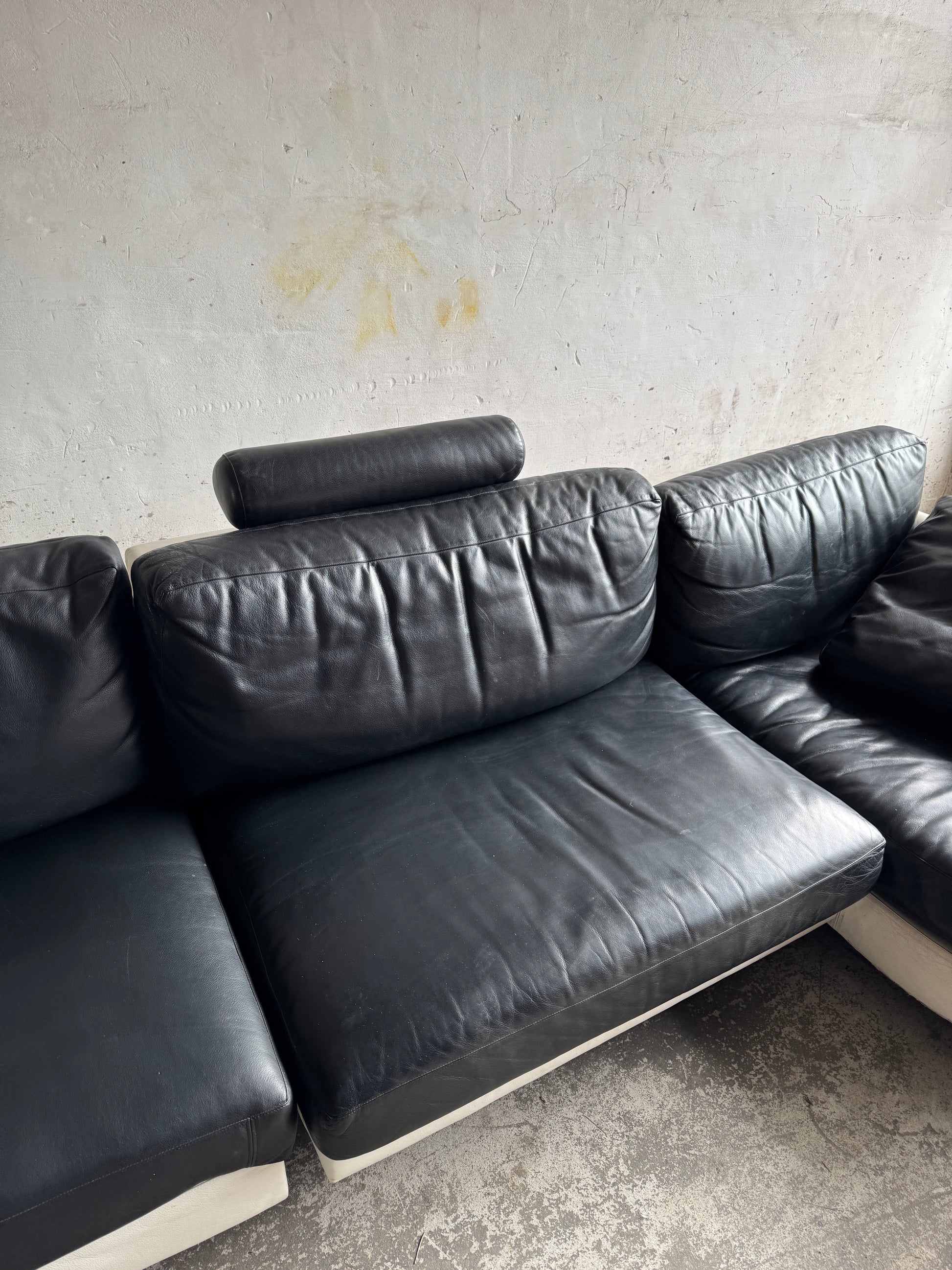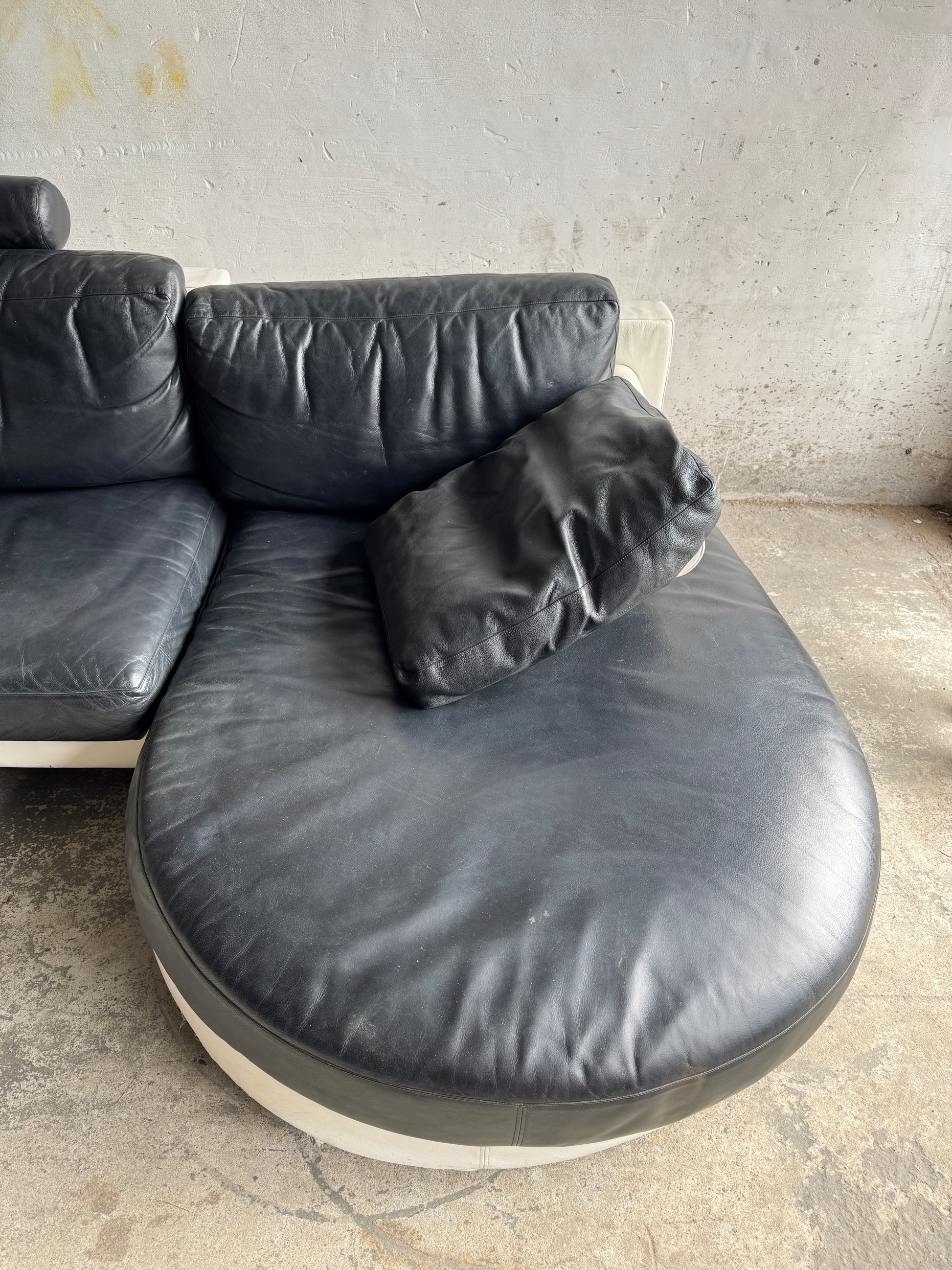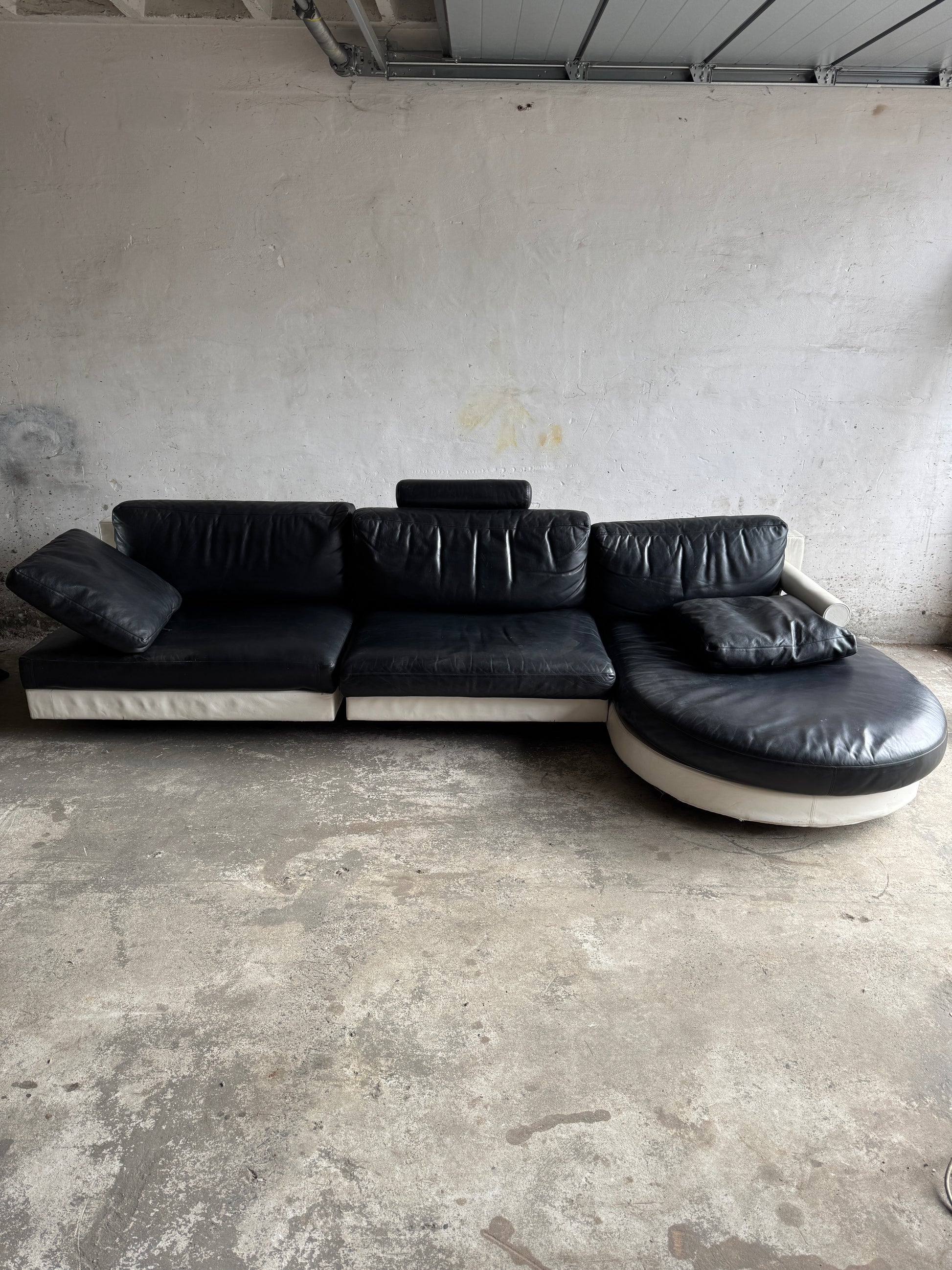 De bank is vervaardigd uit twee rechte modules en een royale chaise longue, allen bedekt met zwart leder en rusted op een wit onderstel. Het contrast tussen materialen en kleuren geeft het geheel een moderne, grafische uitstraling. Een sculpturaal statement voor elke hedendaagse woonruimte.