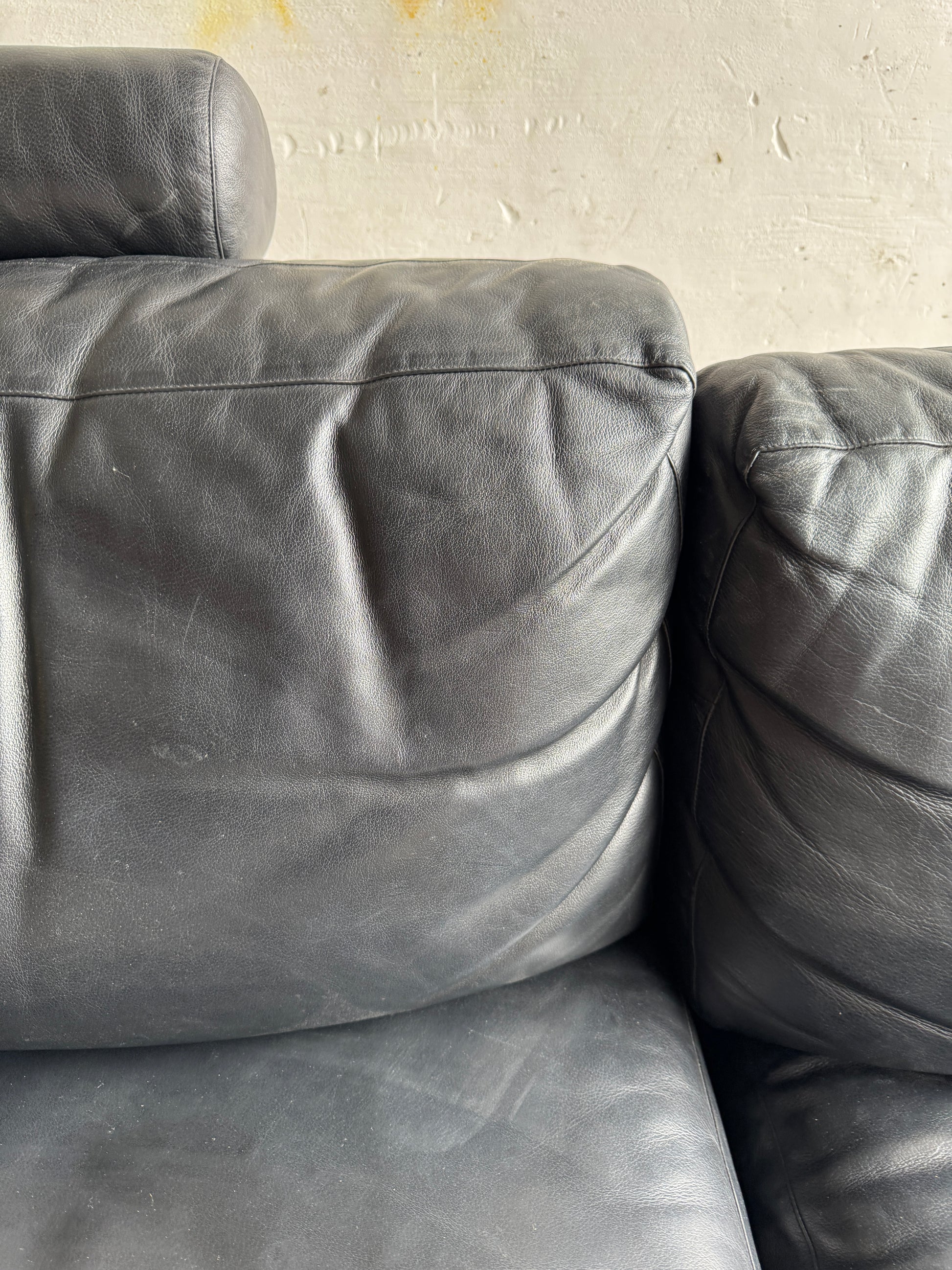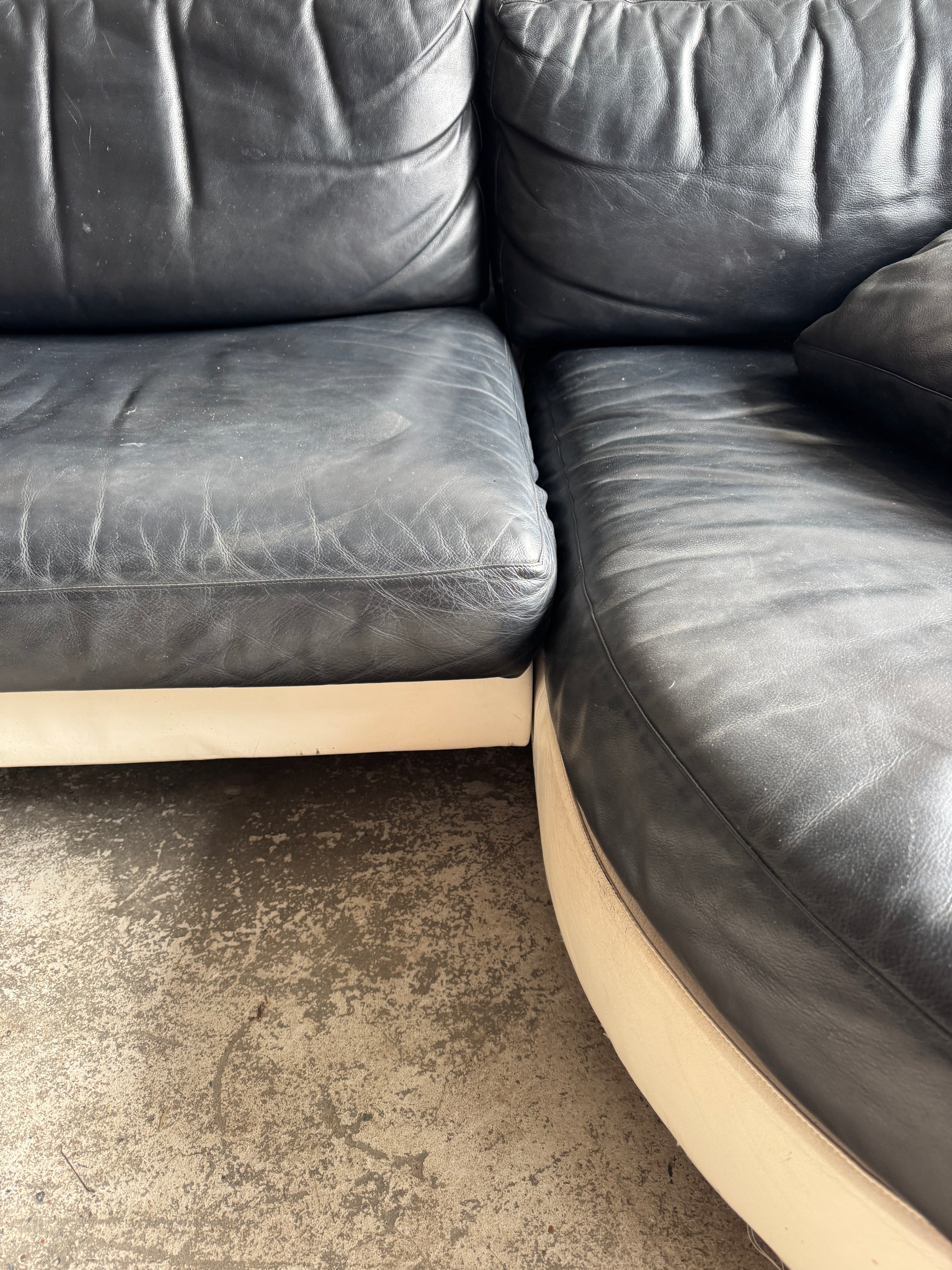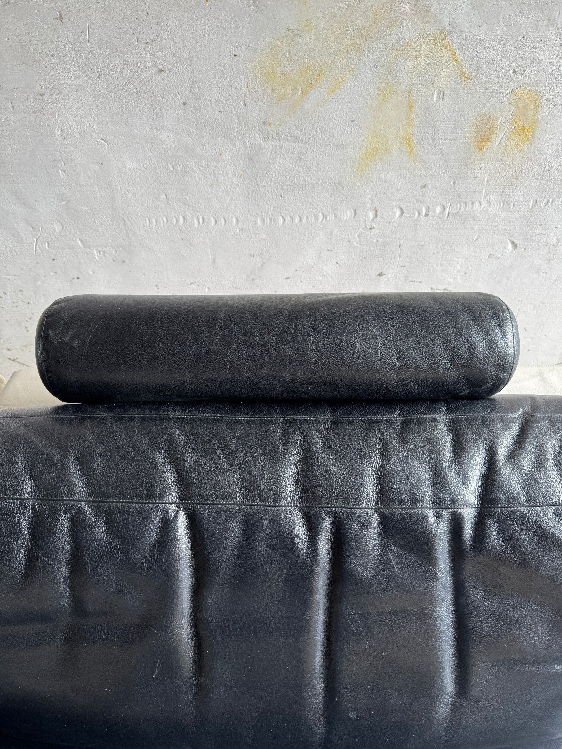 De bank is vervaardigd uit twee rechte modules en een royale chaise longue, allen bedekt met zwart leder en rusted op een wit onderstel. Het contrast tussen materialen en kleuren geeft het geheel een moderne, grafische uitstraling. Een sculpturaal statement voor elke hedendaagse woonruimte.