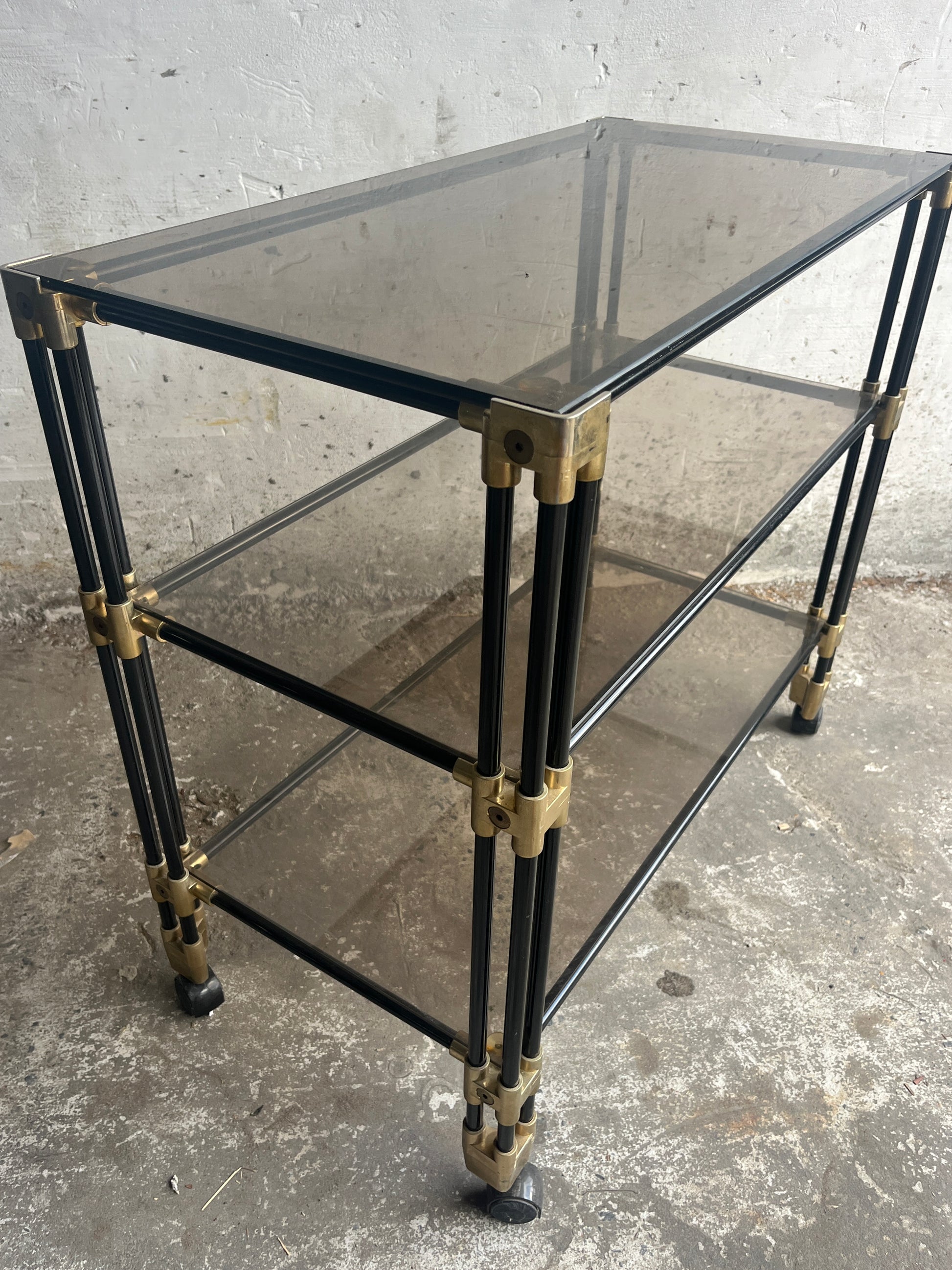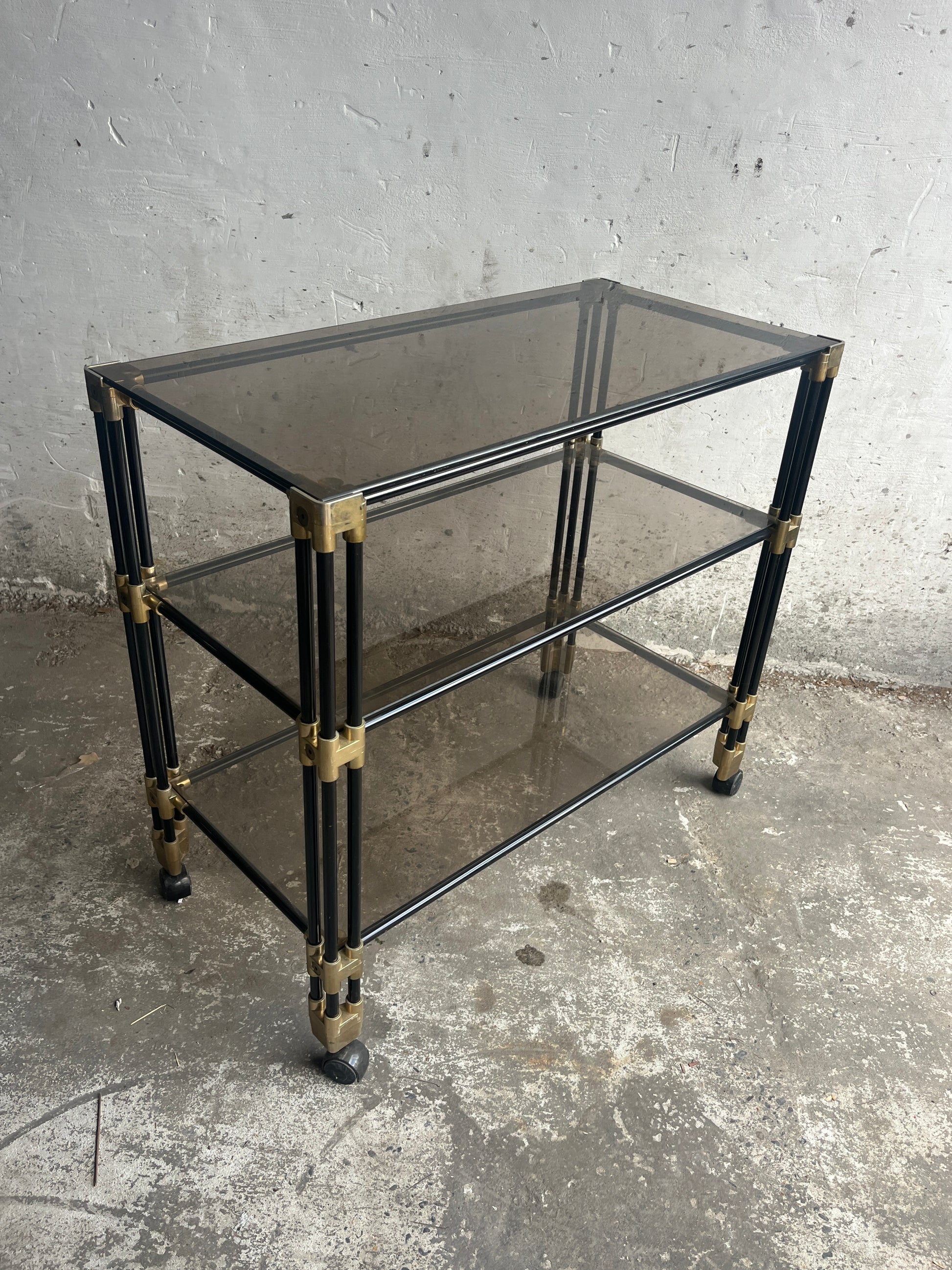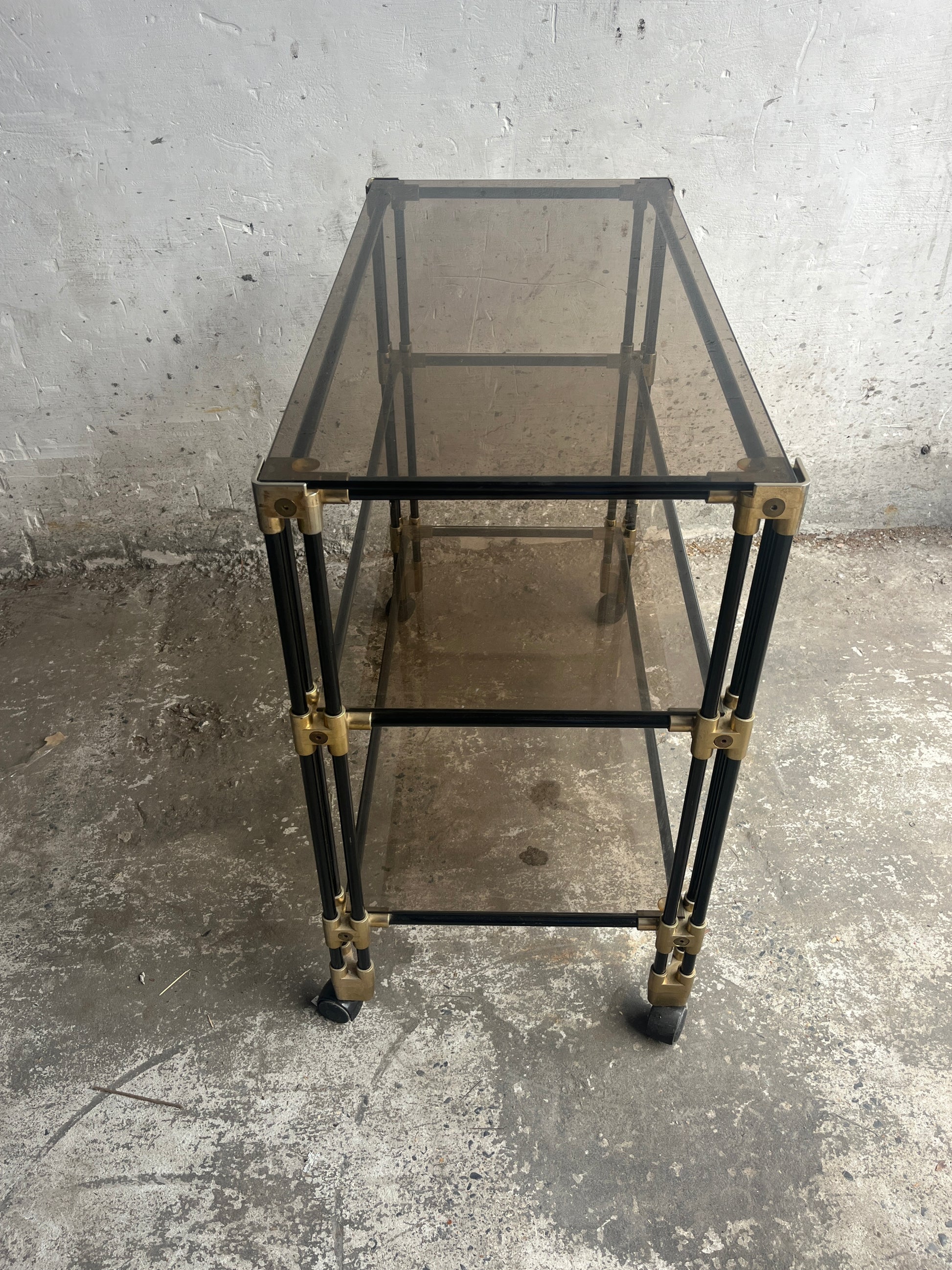 A striking vintage piece from the 1980s. This versatile side table / bar cart trolley features smoked glass shelves combined with a tubular frame in a light-toned finish. The clean lines and subtle detailing give it a timeless retro look that is both functional and decorative.