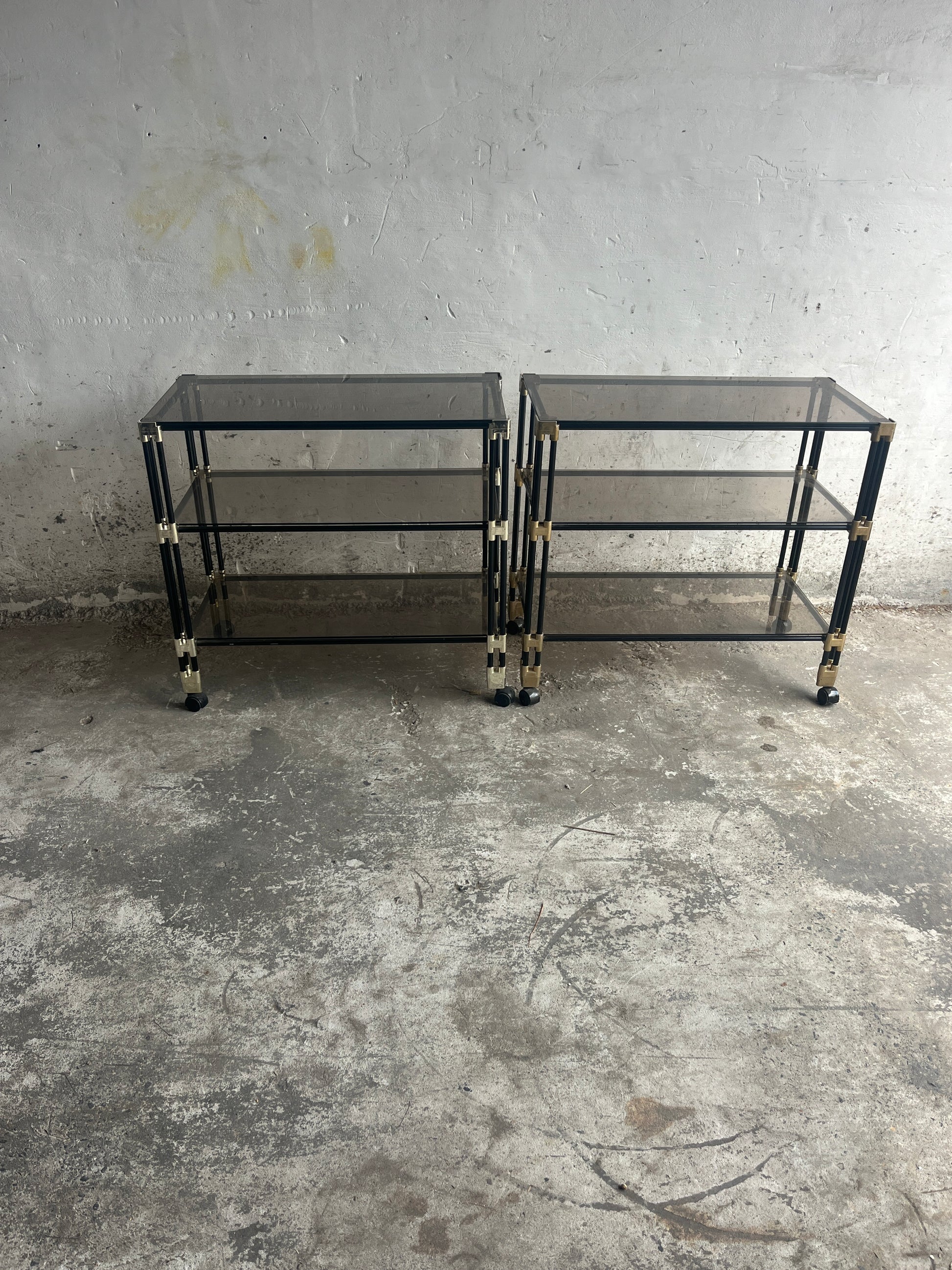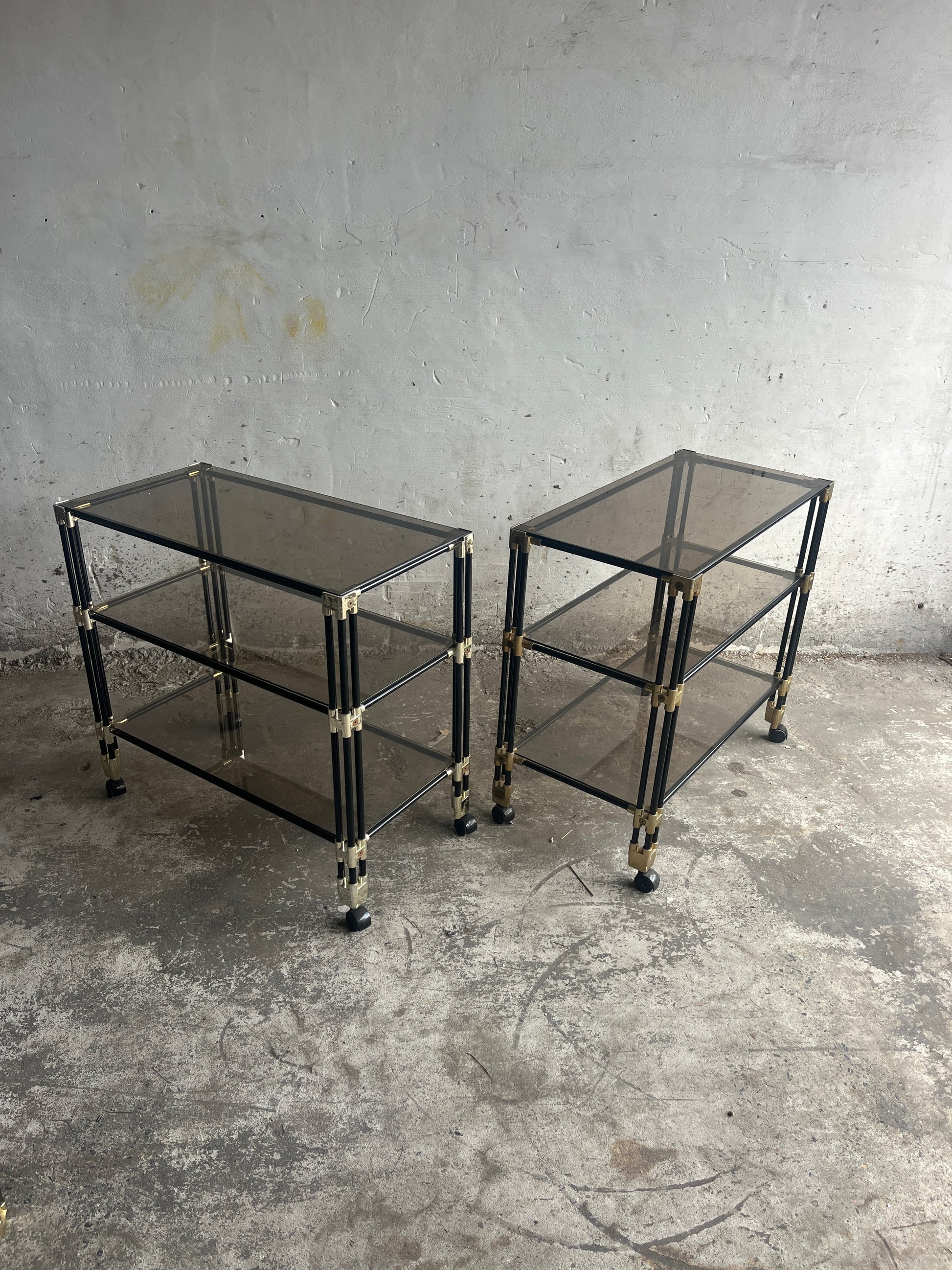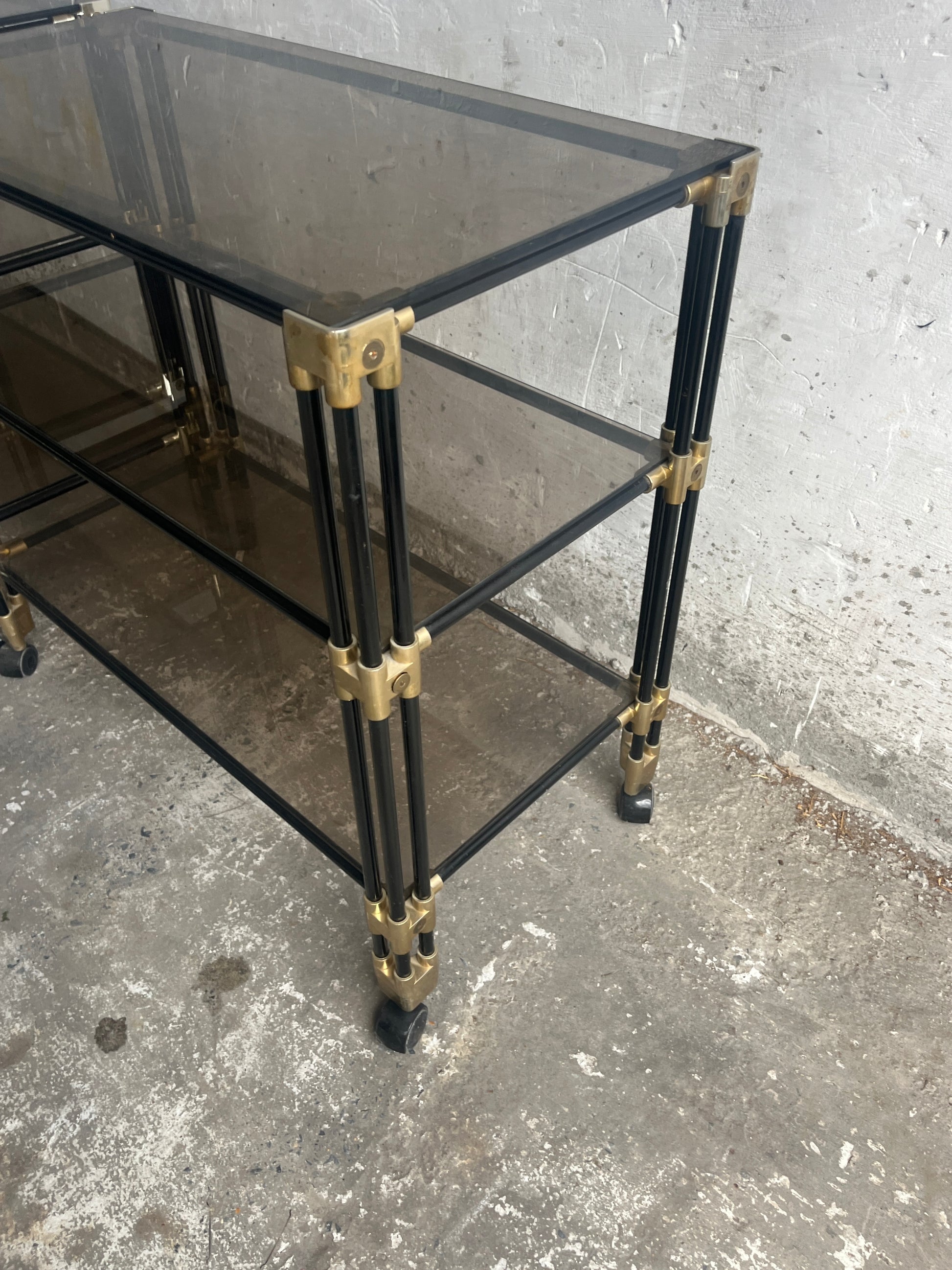 A striking vintage piece from the 1980s. This versatile side table / bar cart trolley features smoked glass shelves combined with a tubular frame in a light-toned finish. The clean lines and subtle detailing give it a timeless retro look that is both functional and decorative.