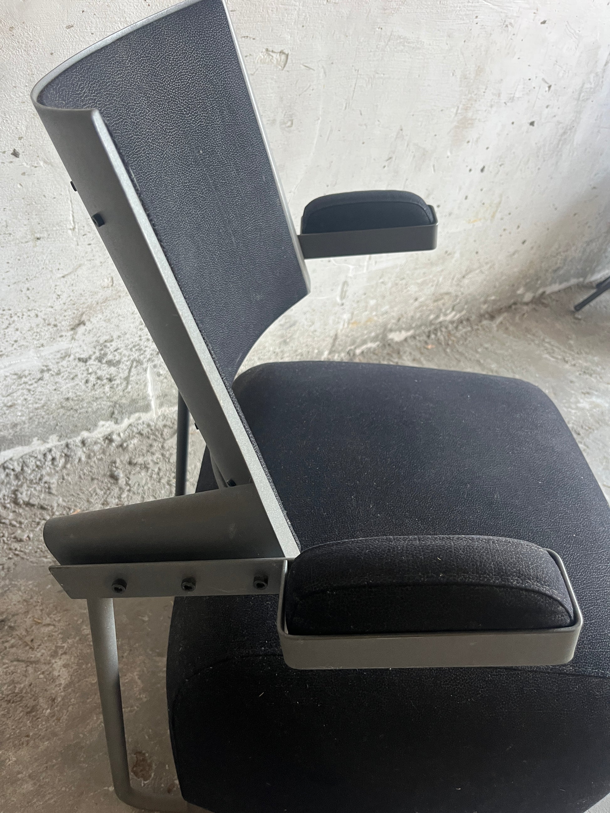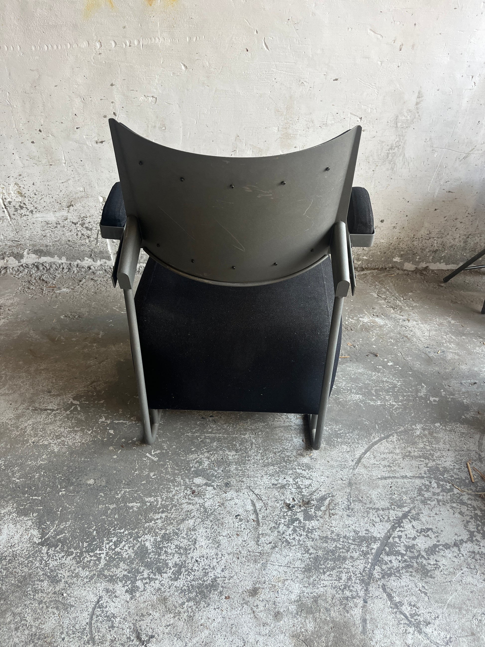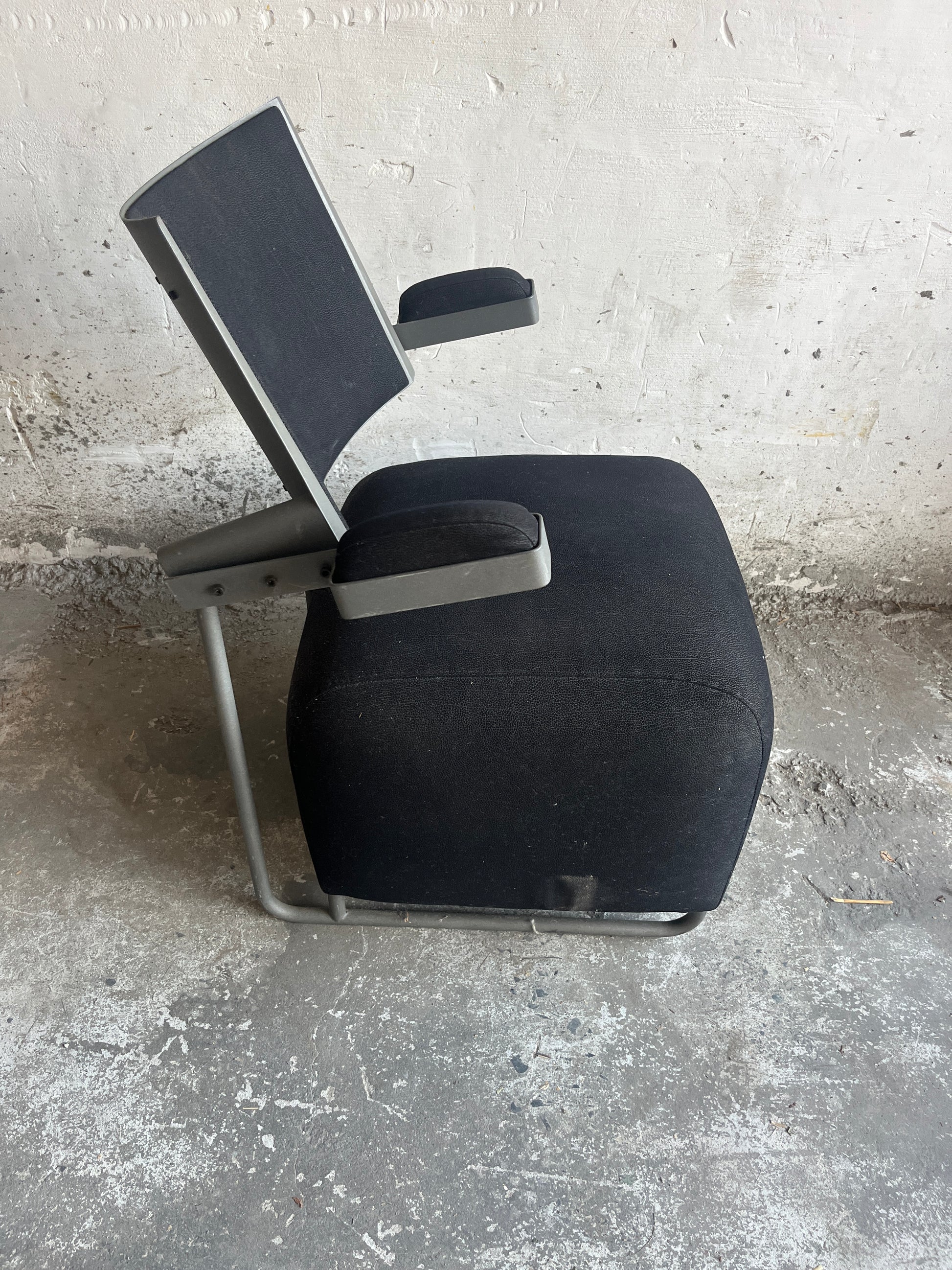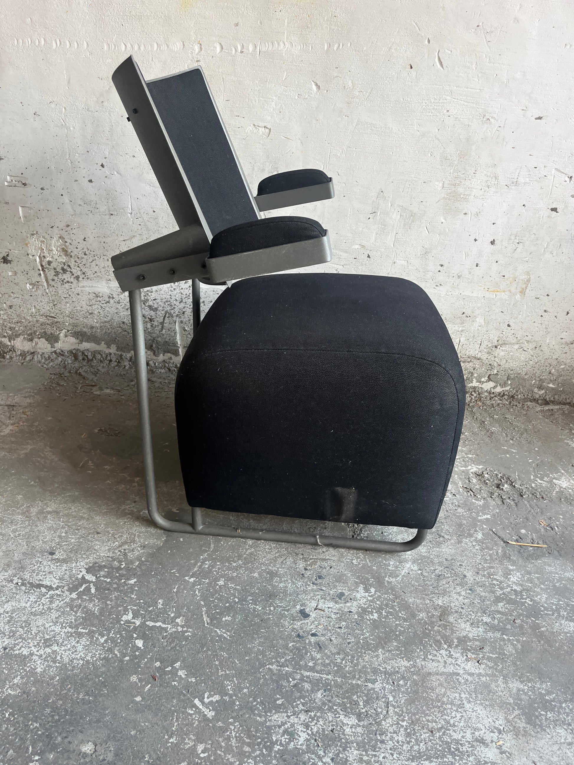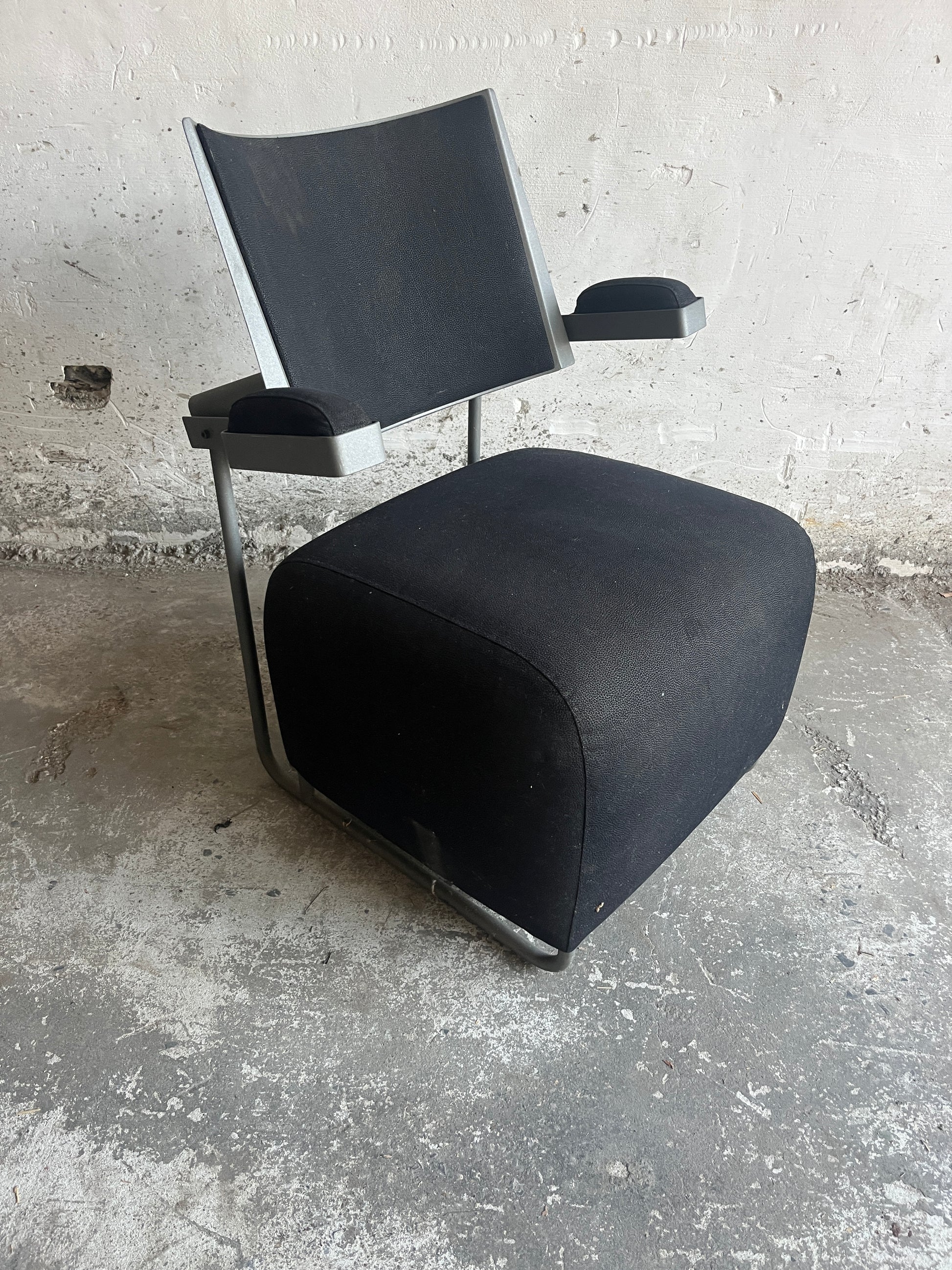 The chair features an epoxy-coated aluminium frame with a curved backrest and thick upholstered seat in structured black fabric. The combination of strong geometric lines and surprising comfort makes it one of Inno’s most iconic designs.
