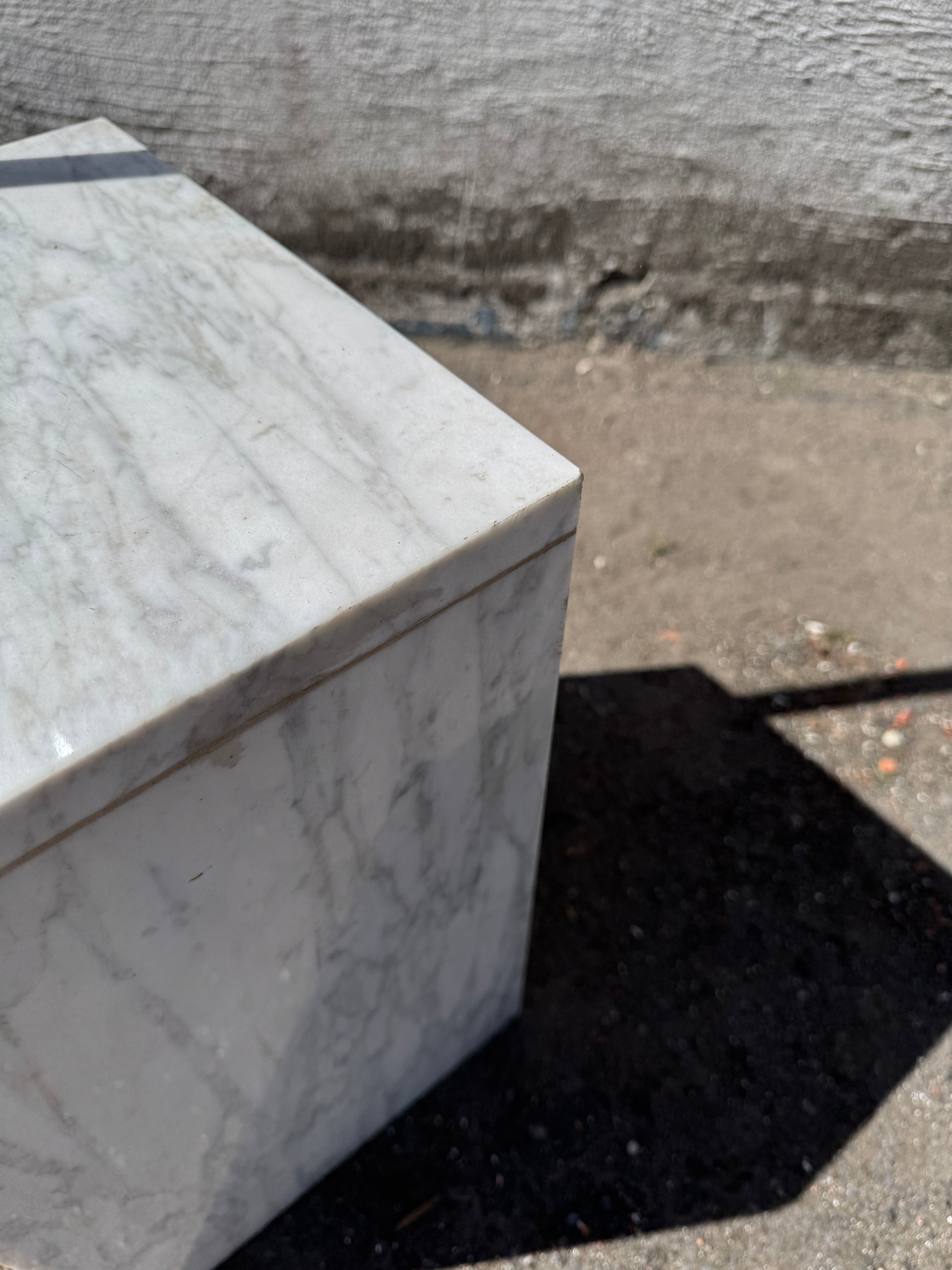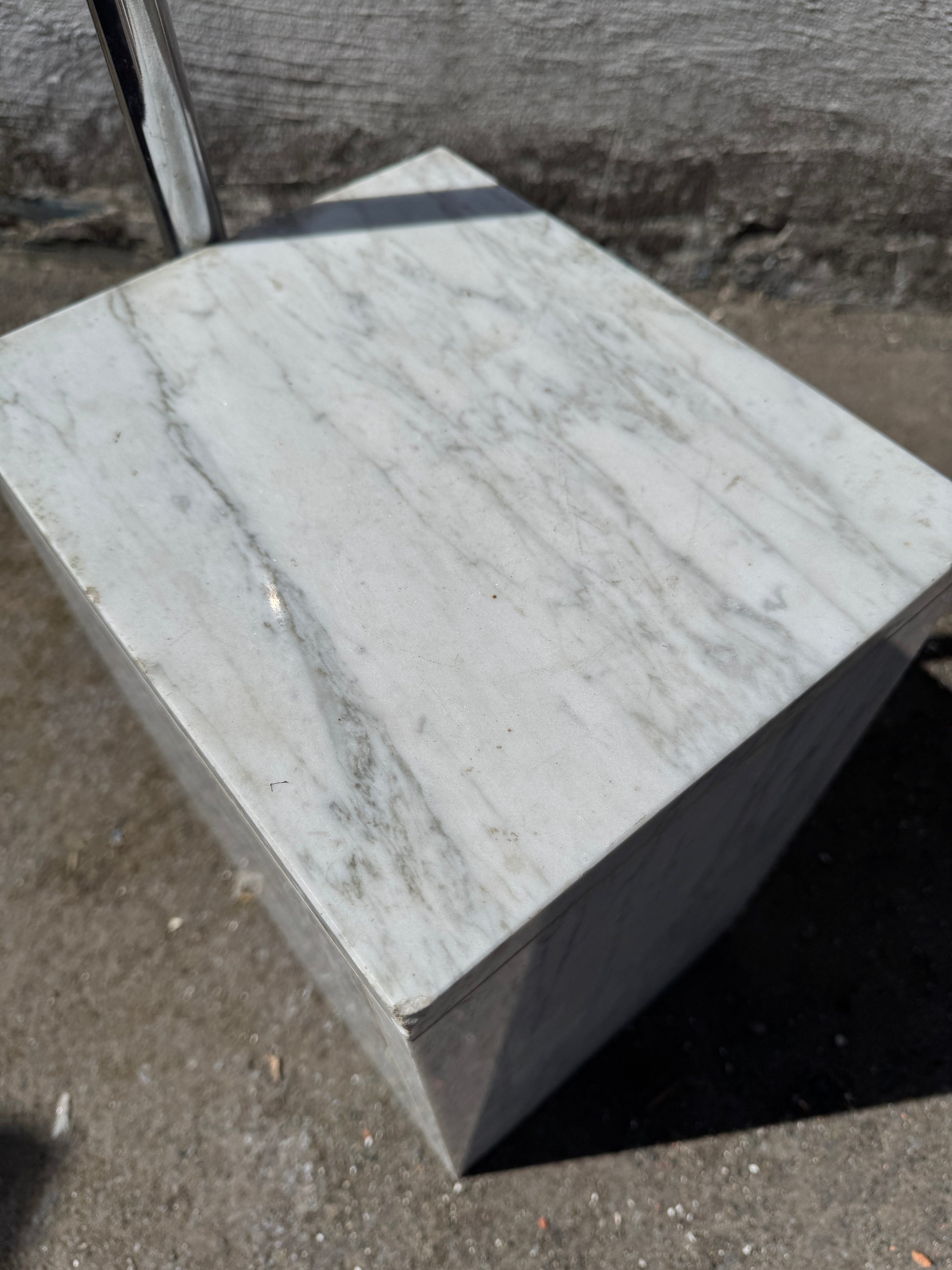 Een gedurfde en iconische Italiaanse boogvormige vloerlamp met een lange chromen arm die dramatisch buigt vanuit een zware witte marmeren kubusvoet, die een brede metalen koepelvormige kap draagt. Met zijn elegante proporties en sculpturale vorm is deze lamp zowel functioneel als architectonisch – perfect voor het verlichten van eetkamers, leeshoeken of galerieën.