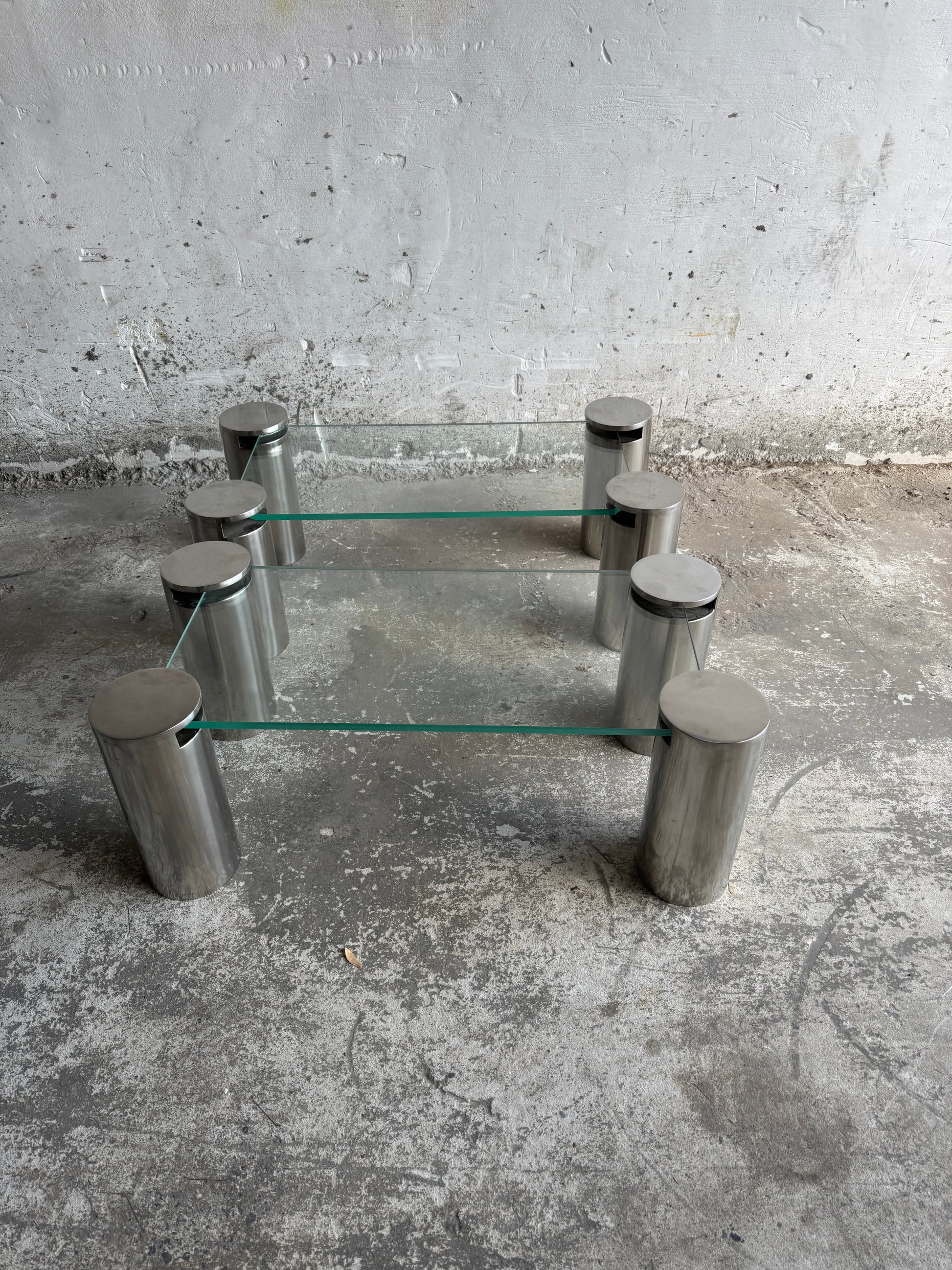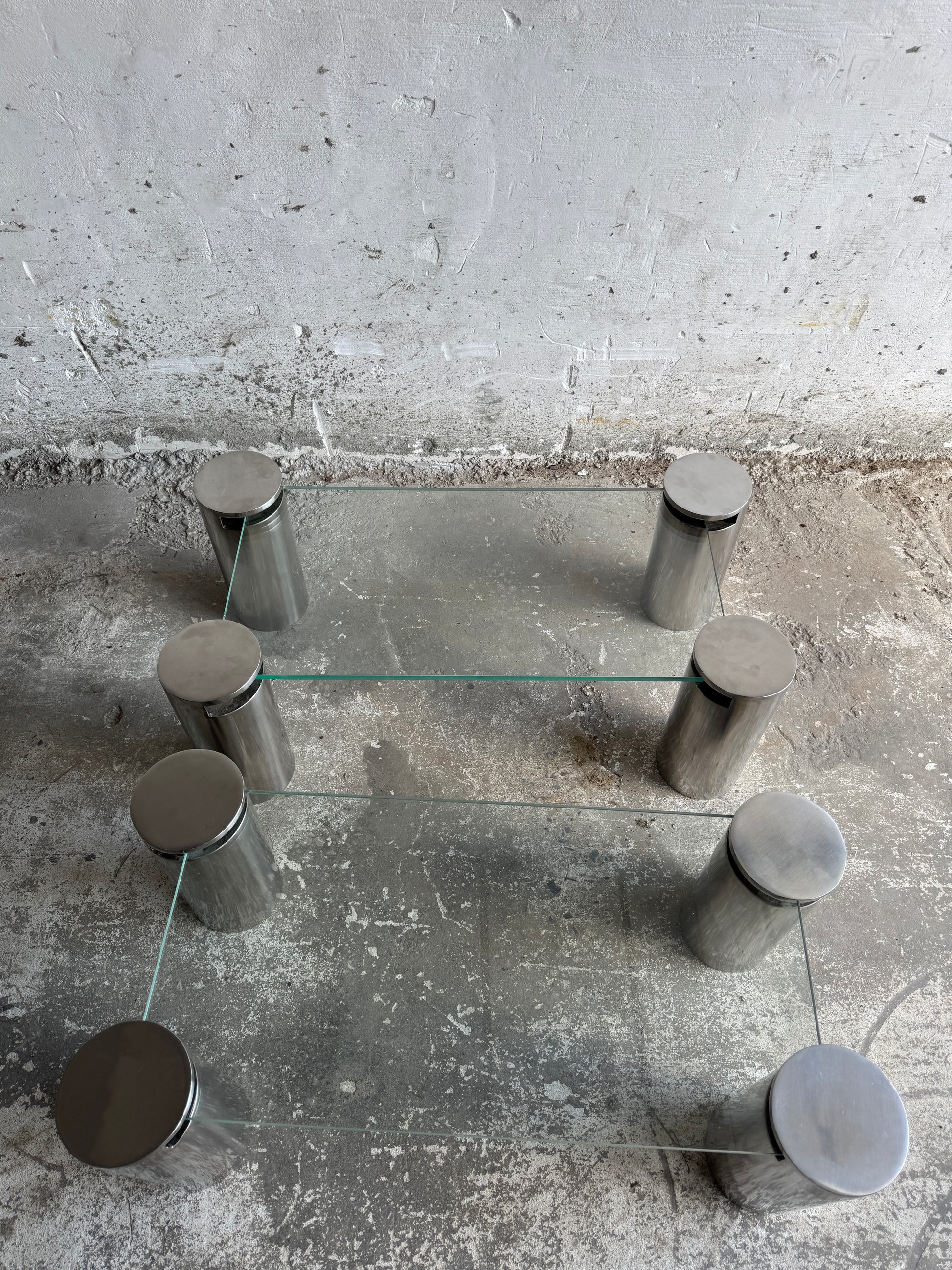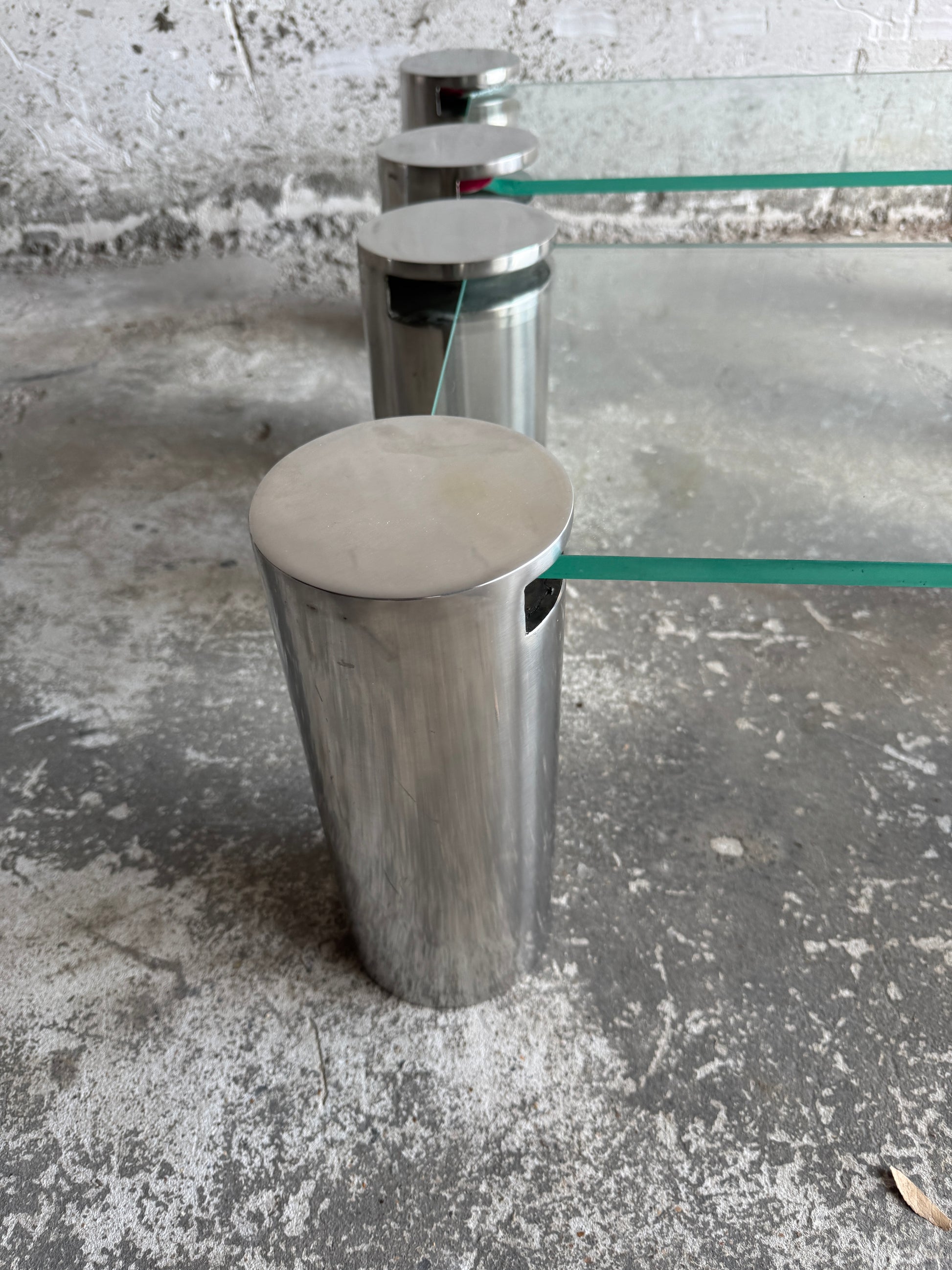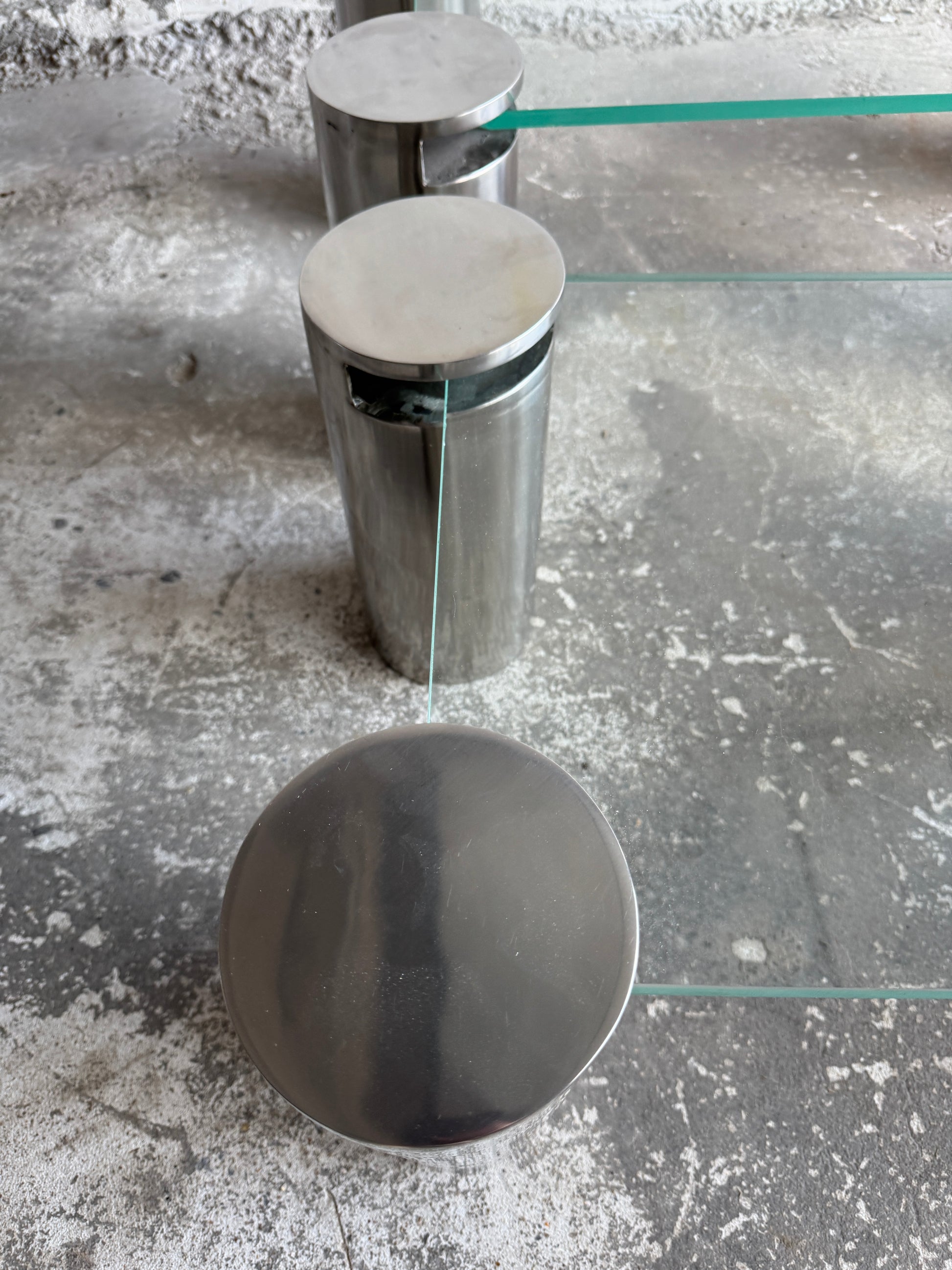 Deze opvallende set modernistische salon- of bijzettafels heeft een helder glazen blad en zes cilindrische roestvrijstalen poten per tafel. De strakke, architectonische structuur benadrukt een gedurfde industriële esthetiek en combineert transparantie met sculpturale aanwezigheid. Een zeldzame set die zowel minimalistische als moderne interieurs verfraait.