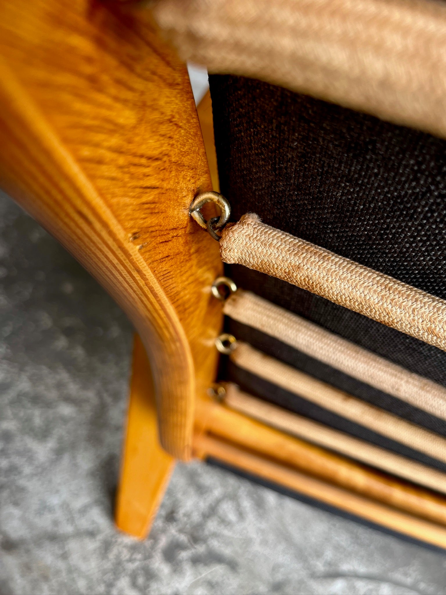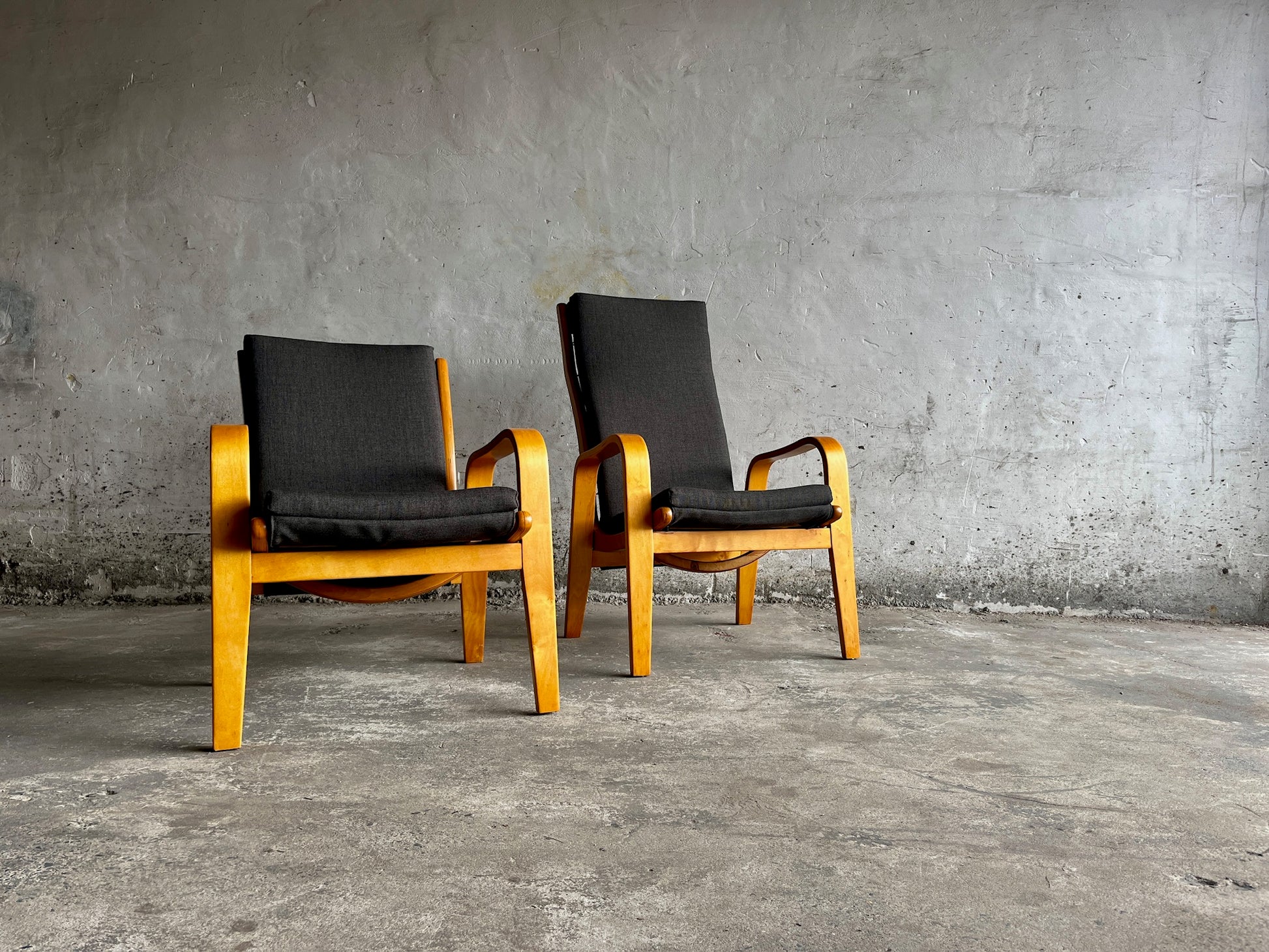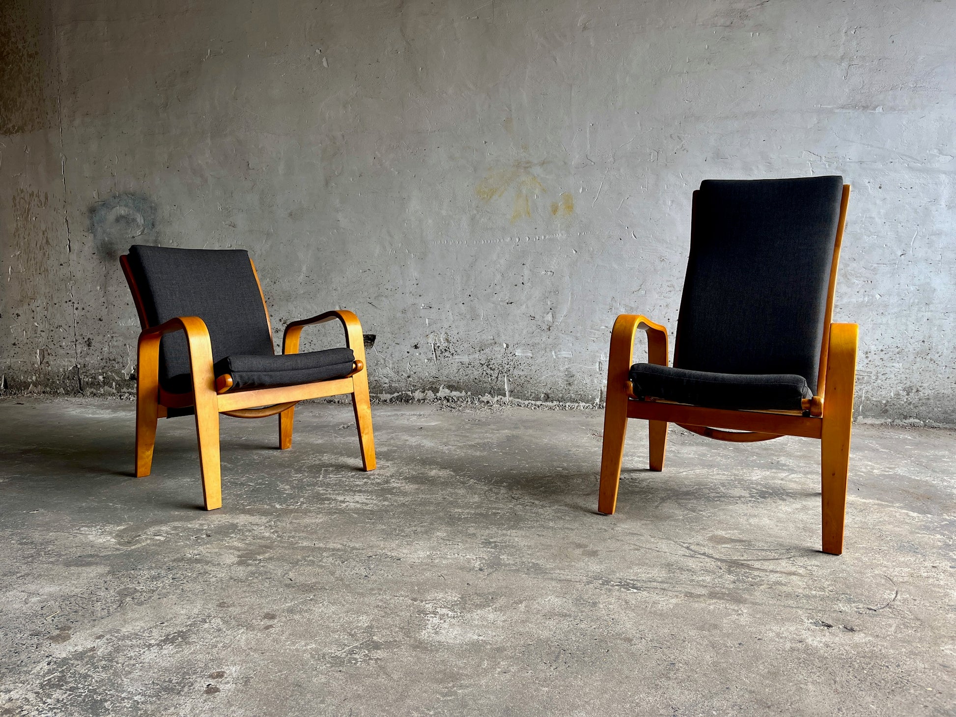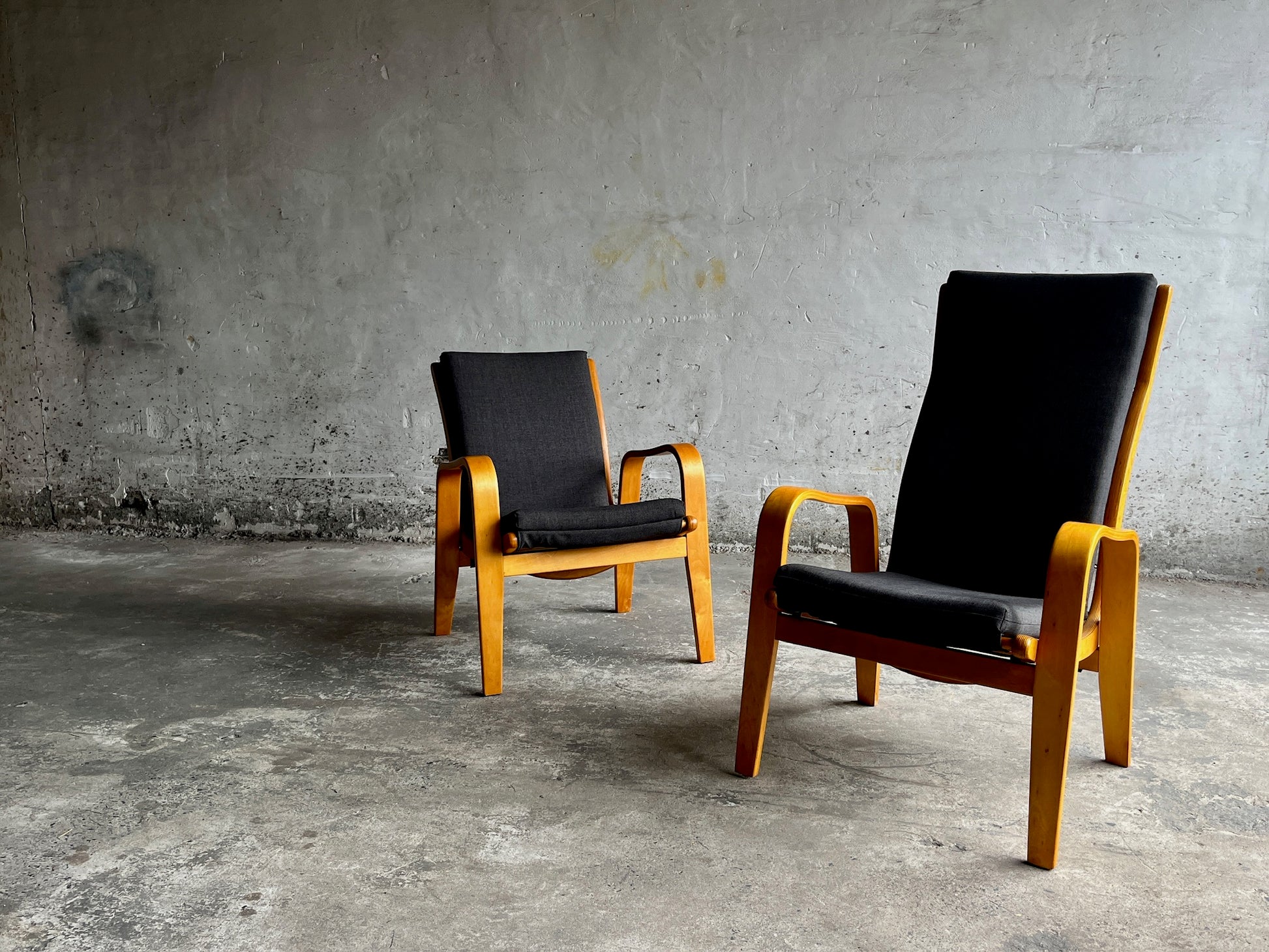 Both chairs feature beautifully curved bentwood armrests and legs in warm birch wood, combined with deep dark upholstery that enhances their elegant contrast. The FB-05 comes with a slightly higher backrest, while the FB-06 has a lower, more compact profile — together creating a harmonious and balanced duo. Perfect for a reading corner, living room, or gallery space.