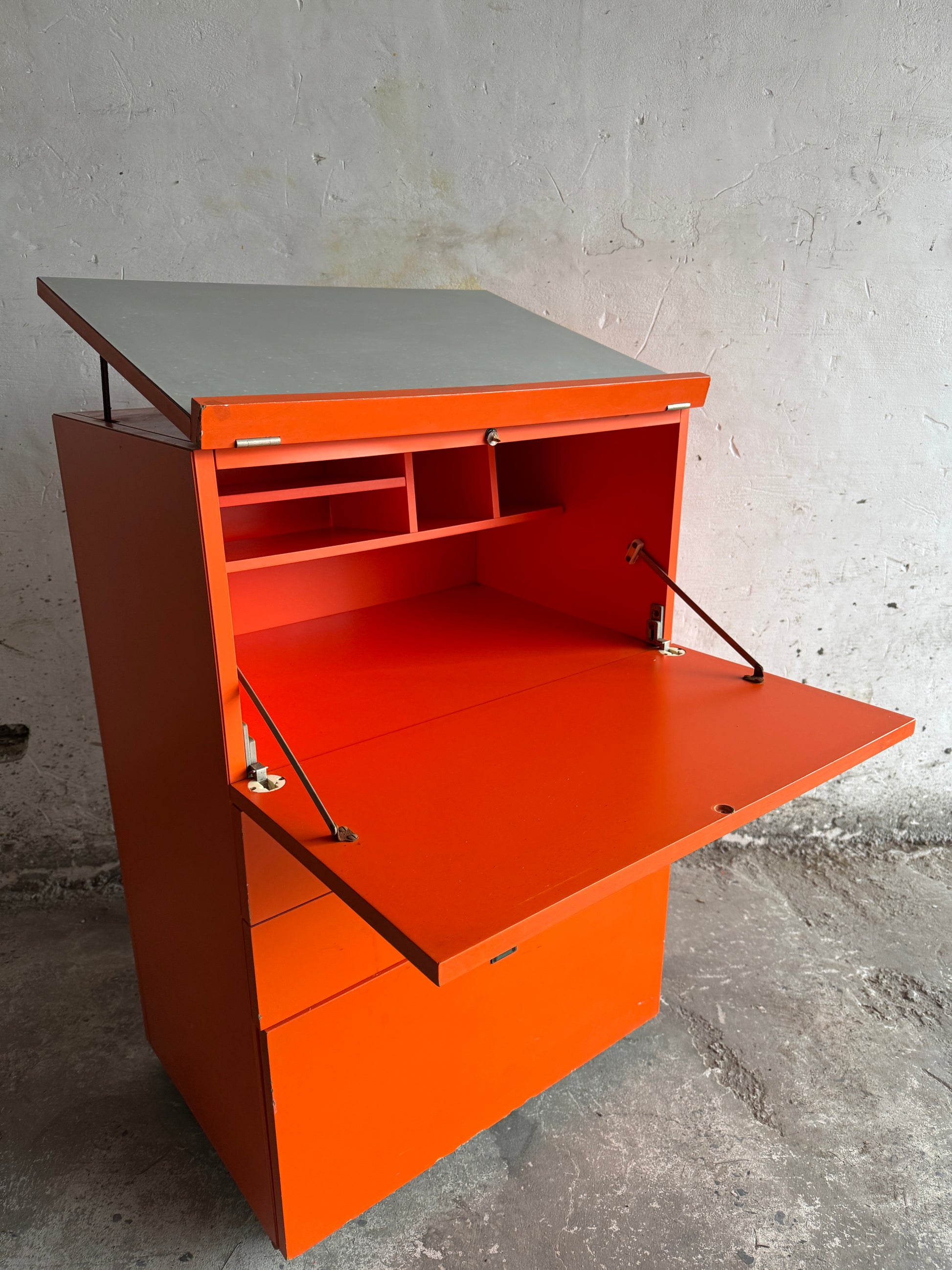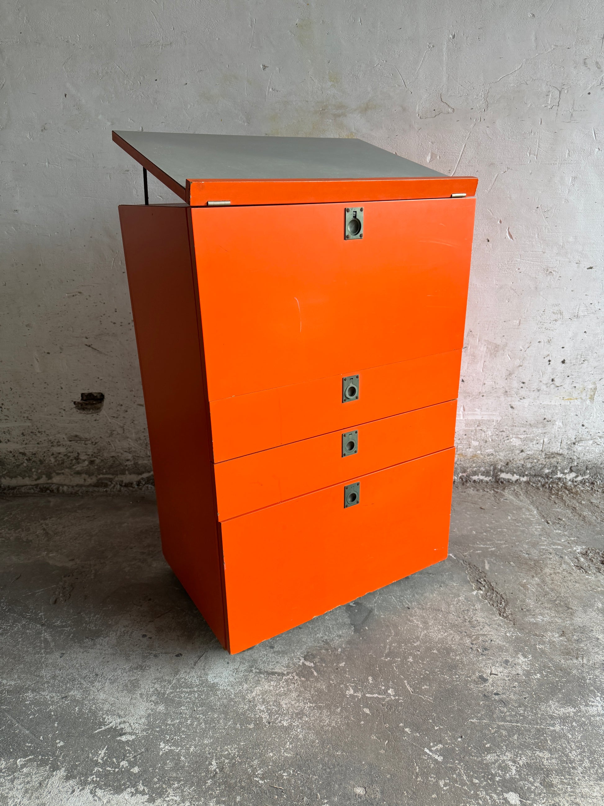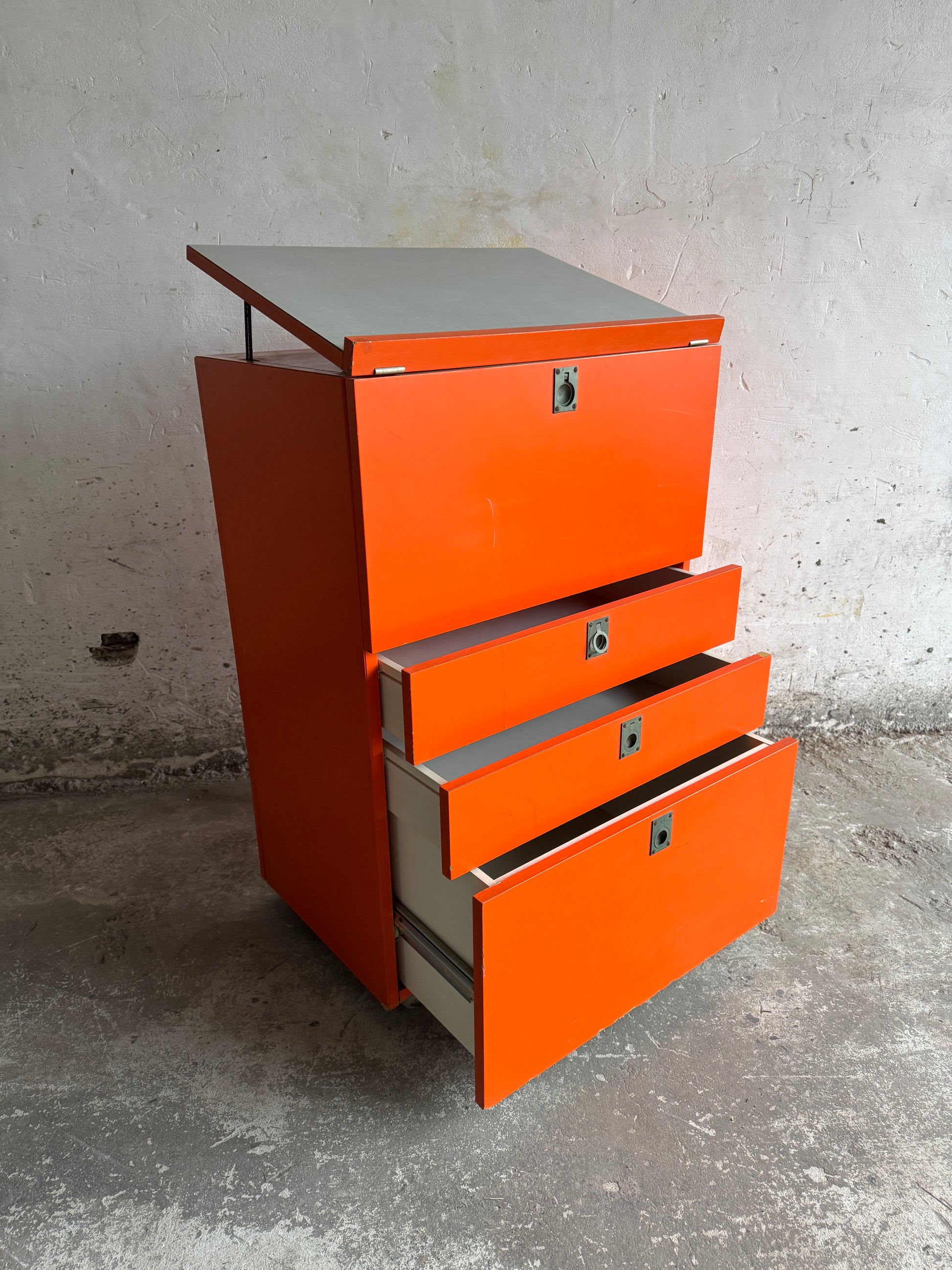 Deze unieke ladekast uit 1980 combineert functionaliteit met een stijlvol ontwerp. Het meubel is voorzien van een uitvouwbaar werkoppervlak en een schuin werkblad, wat het ideaal maakt voor diverse toepassingen in zowel woon- als werkomgevingen.