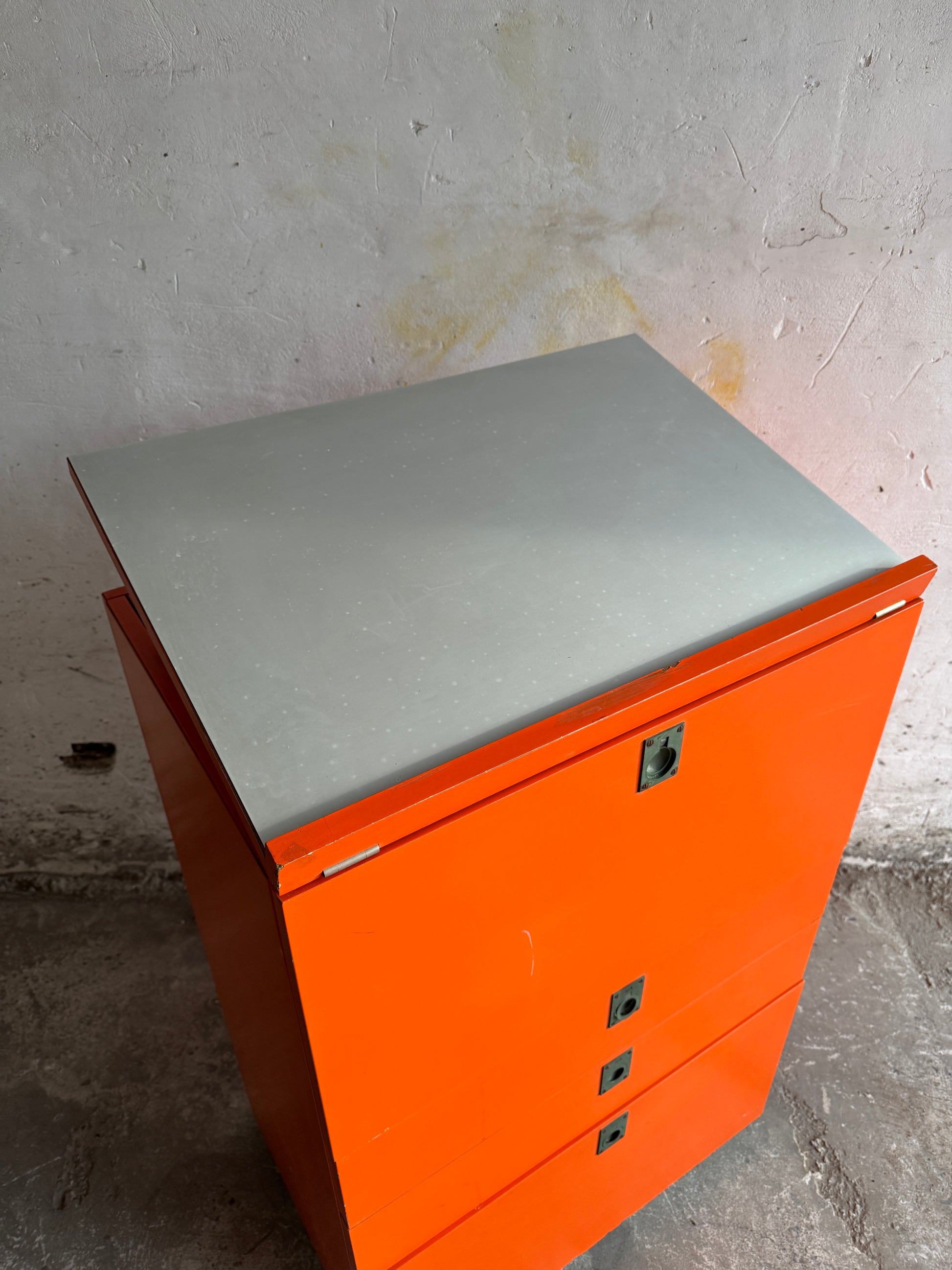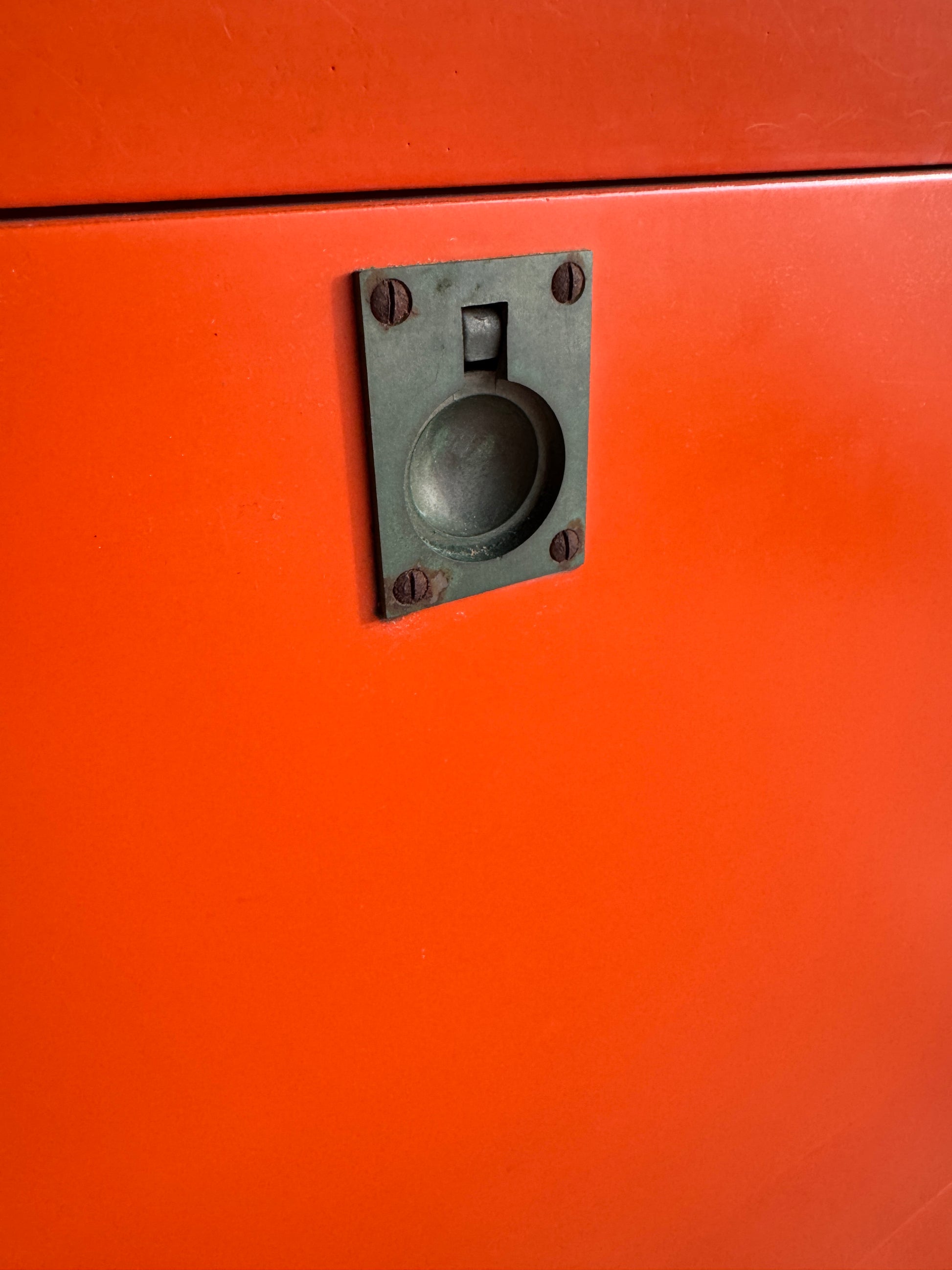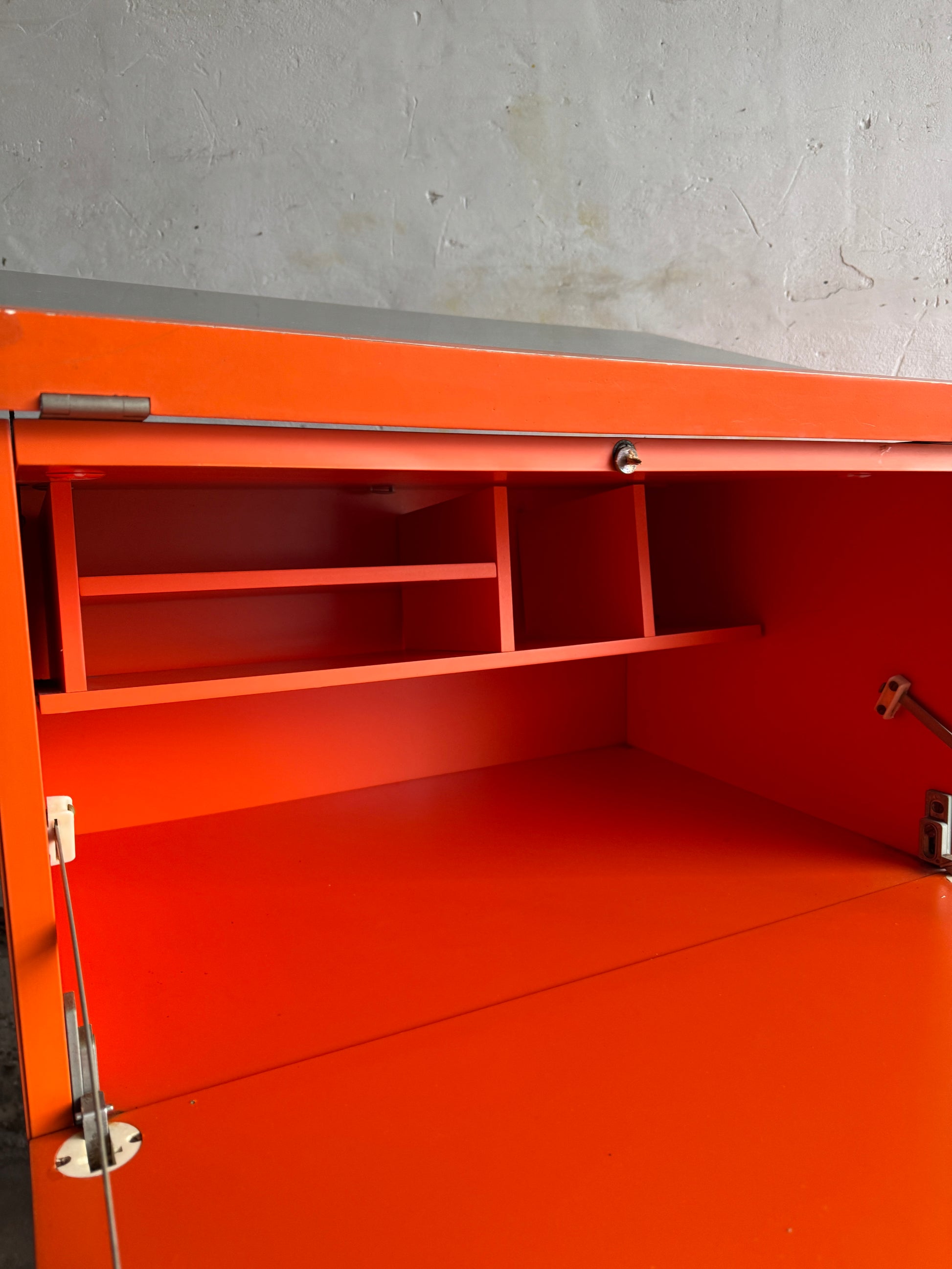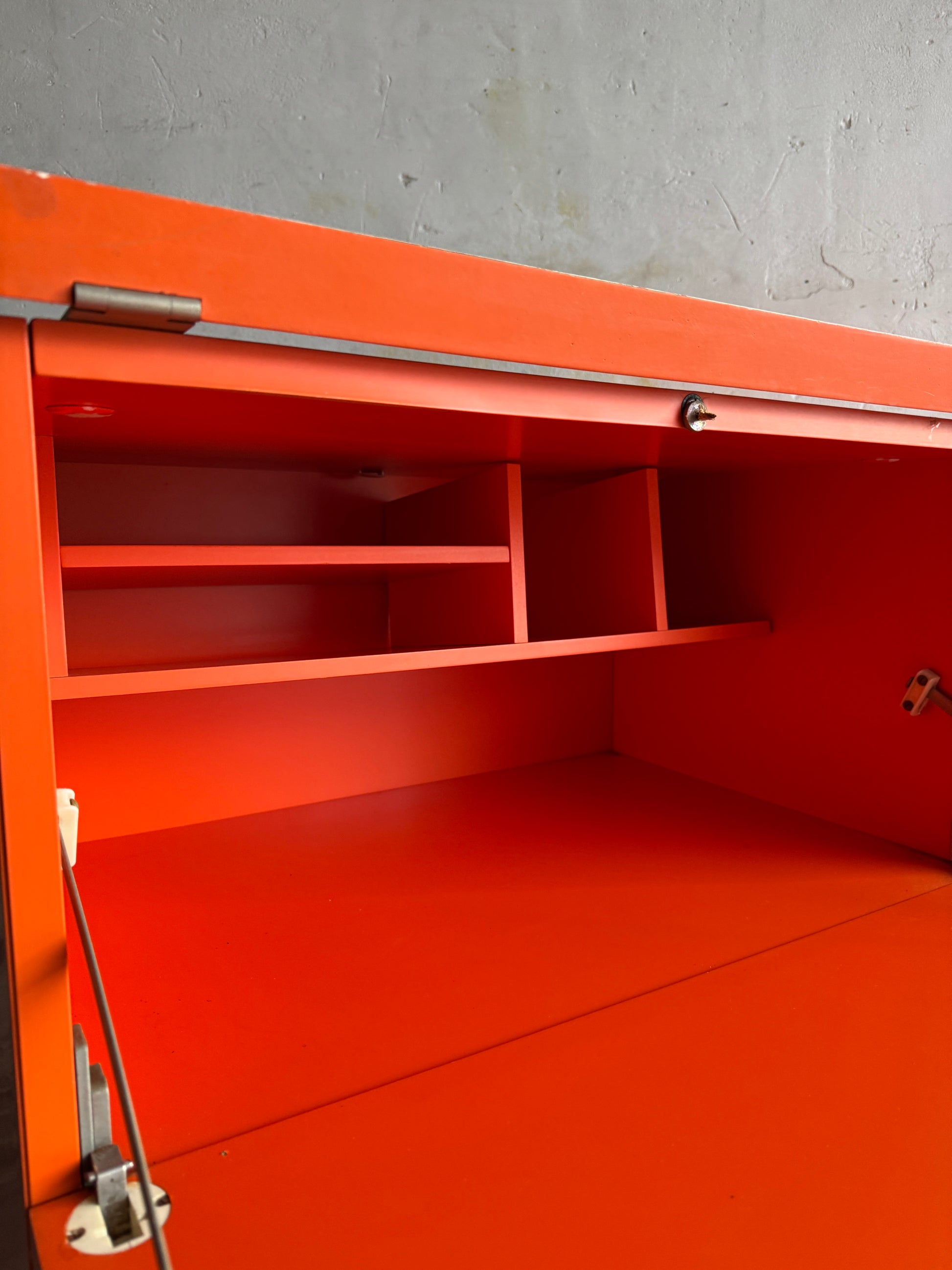 Deze unieke ladekast uit 1980 combineert functionaliteit met een stijlvol ontwerp. Het meubel is voorzien van een uitvouwbaar werkoppervlak en een schuin werkblad, wat het ideaal maakt voor diverse toepassingen in zowel woon- als werkomgevingen.