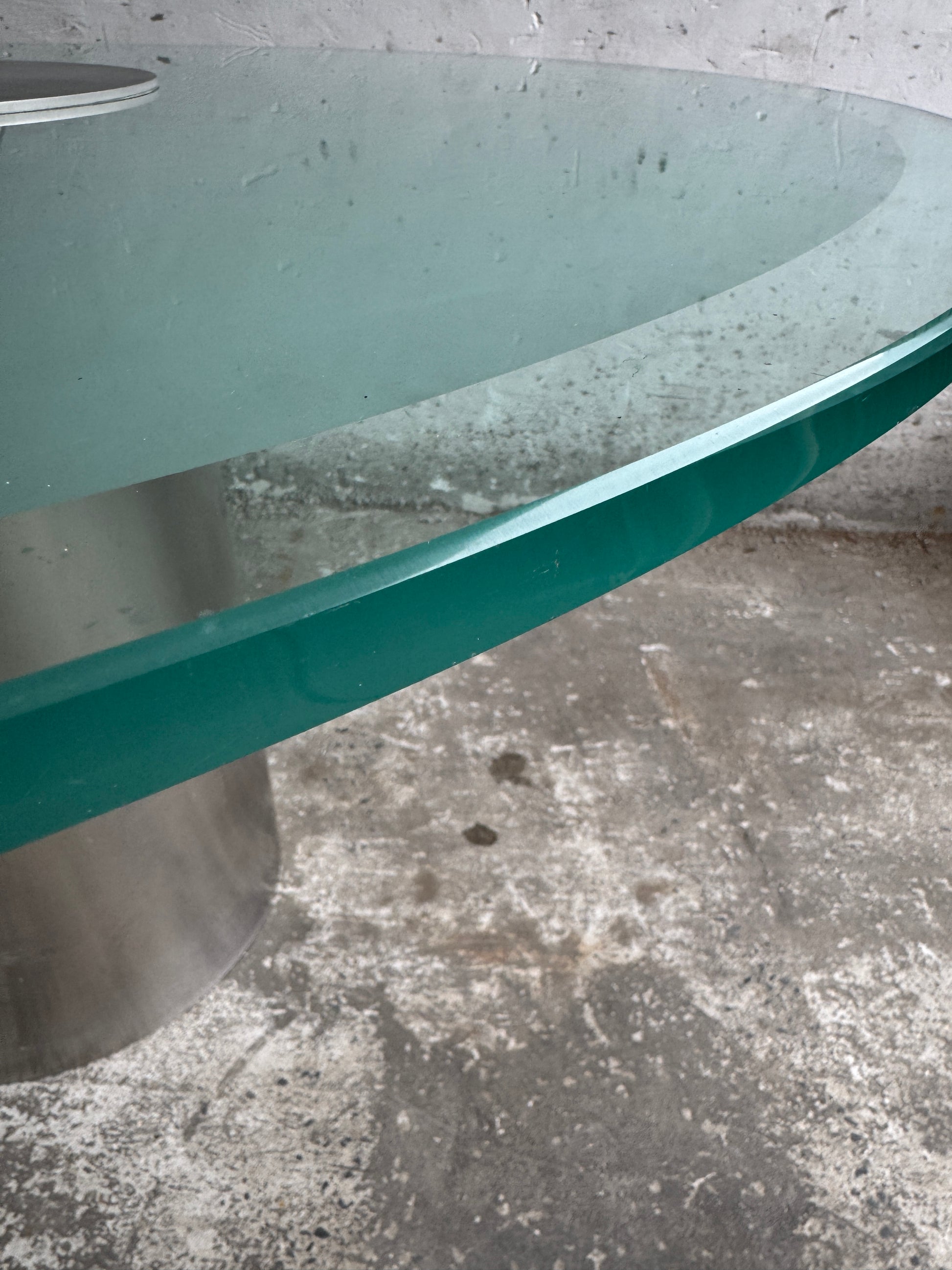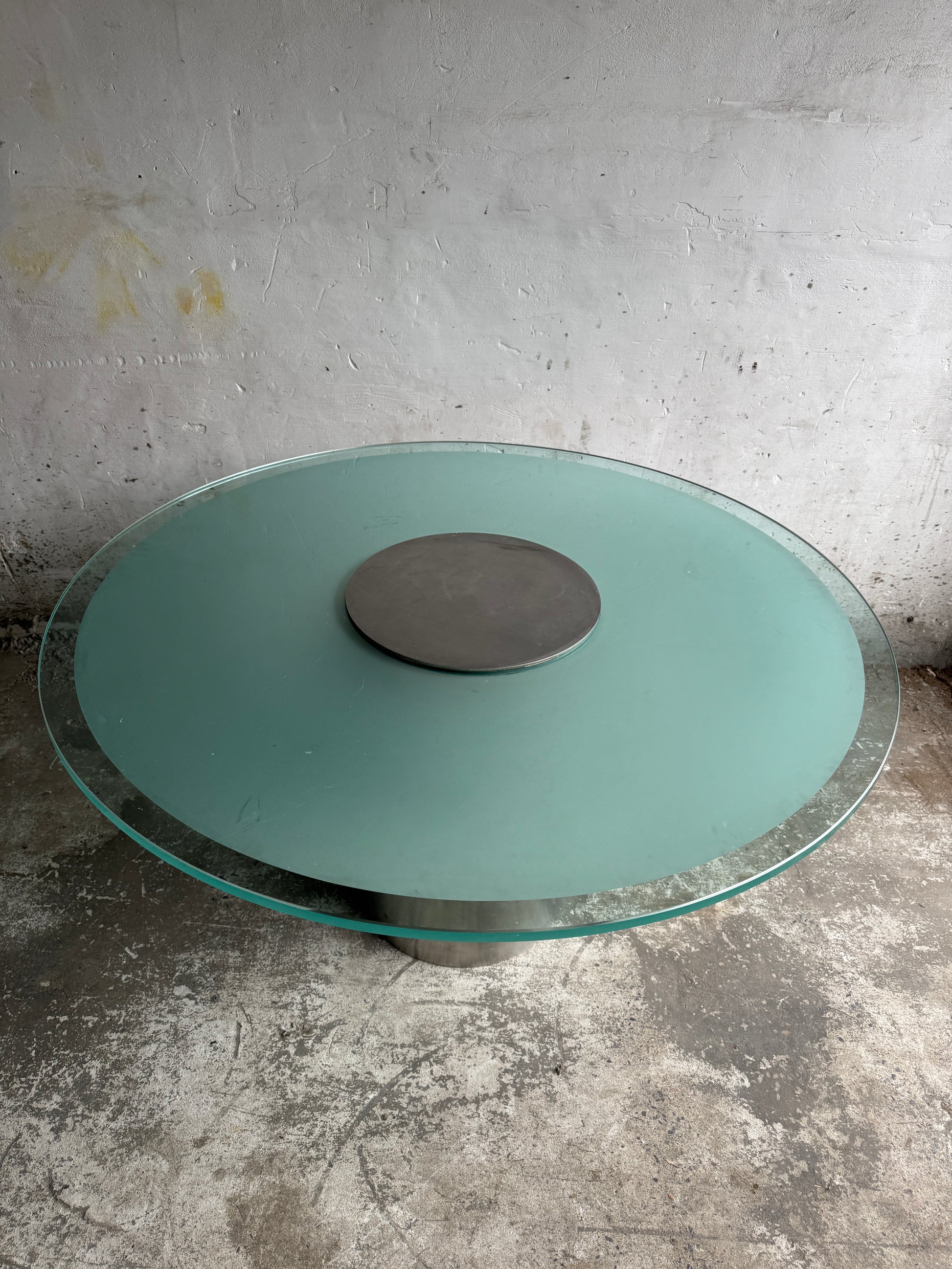 Ronde glazen eettafel met vast centraal blad – Industrieel modern, jaren 90