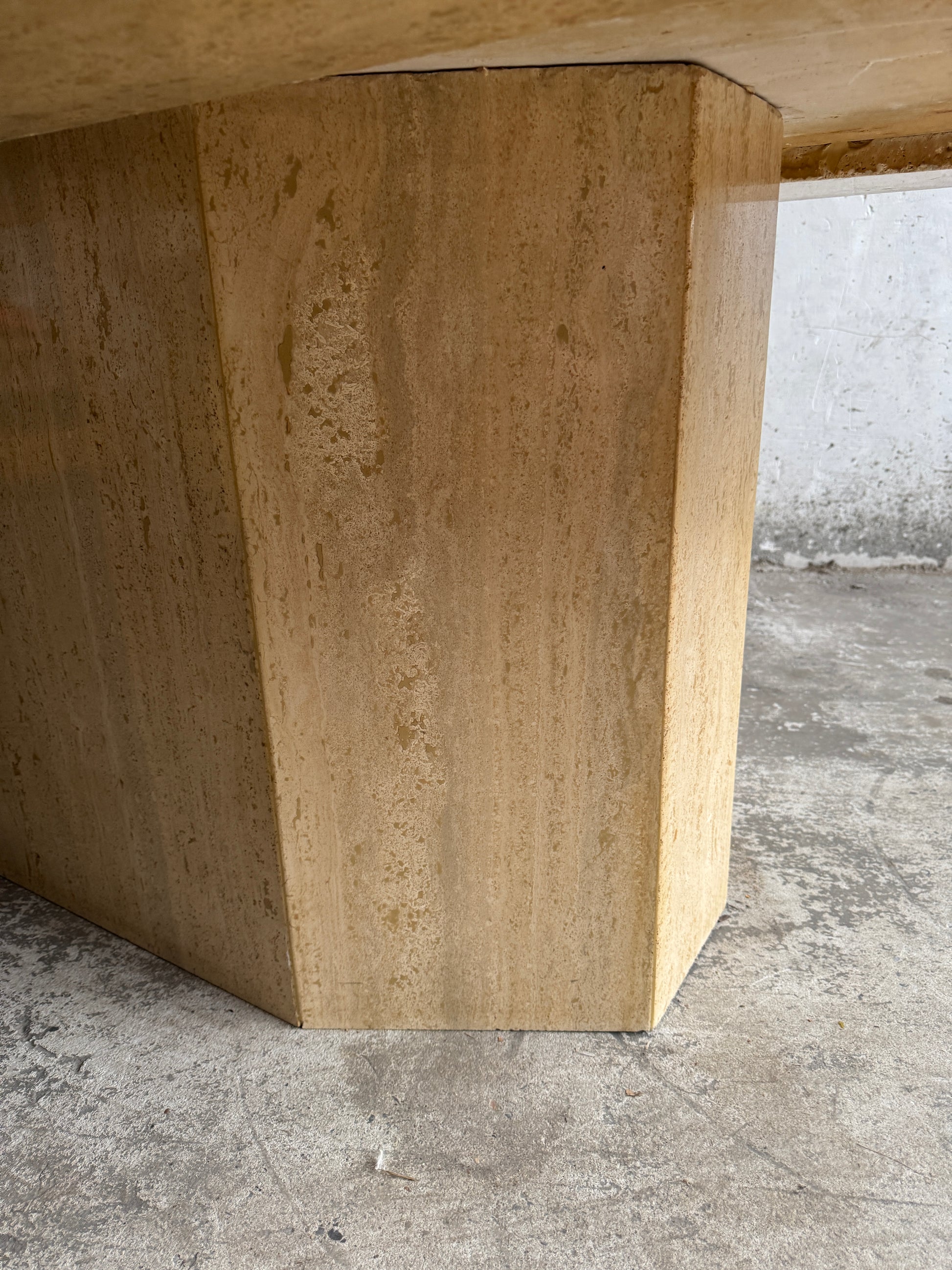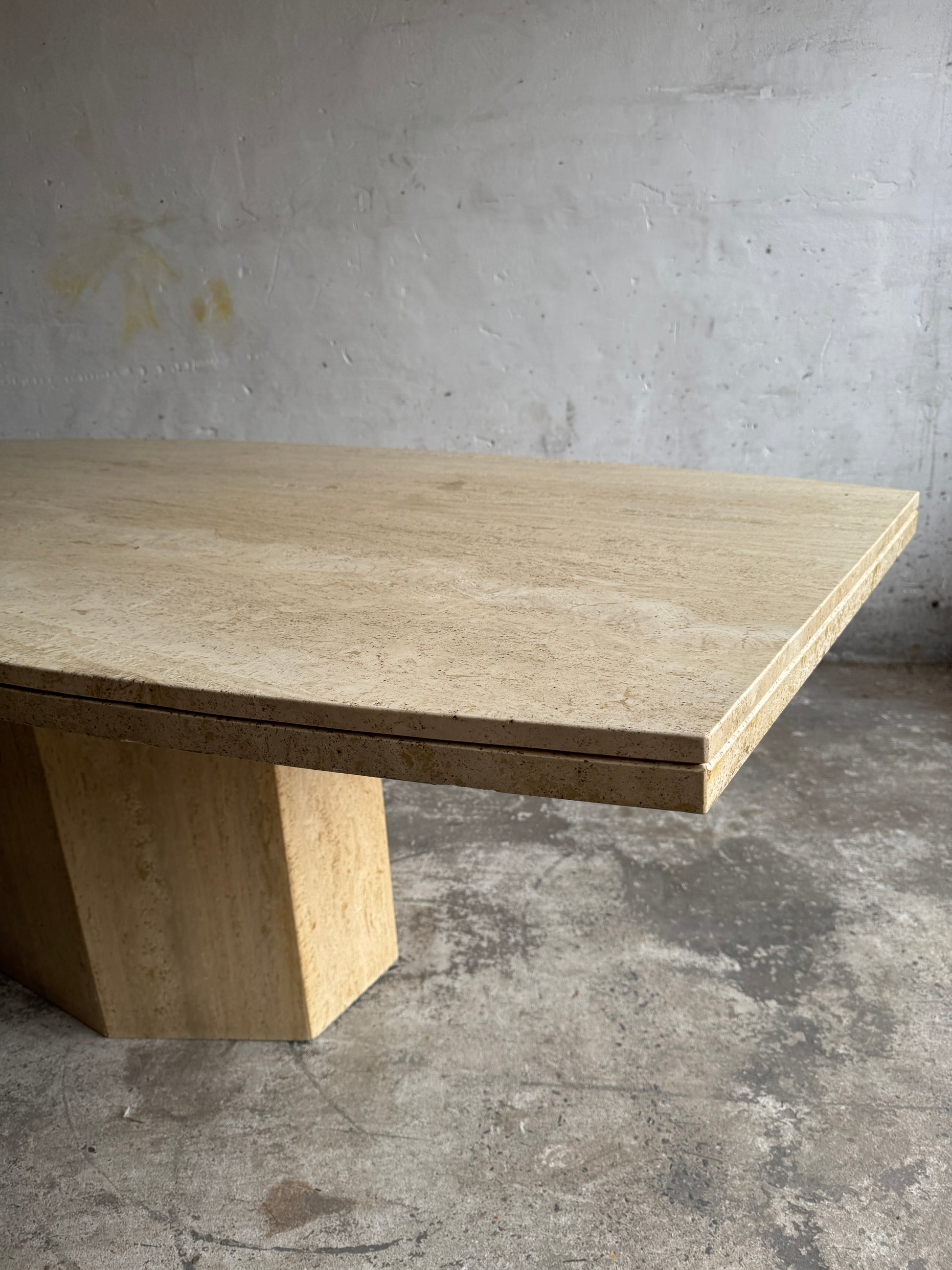 Deze opvallende vintage eettafel is volledig vervaardigd uit massief travertijn. Het dikke, bootvormige blad rust op een gefacetteerd geometrisch onderstel, wat een sculpturale en monolithische uitstraling creëert. De zachte beige tinten en natuurlijke adering benadrukken de rauwe elegantie van de steen, waardoor het een verfijnd statement piece is.