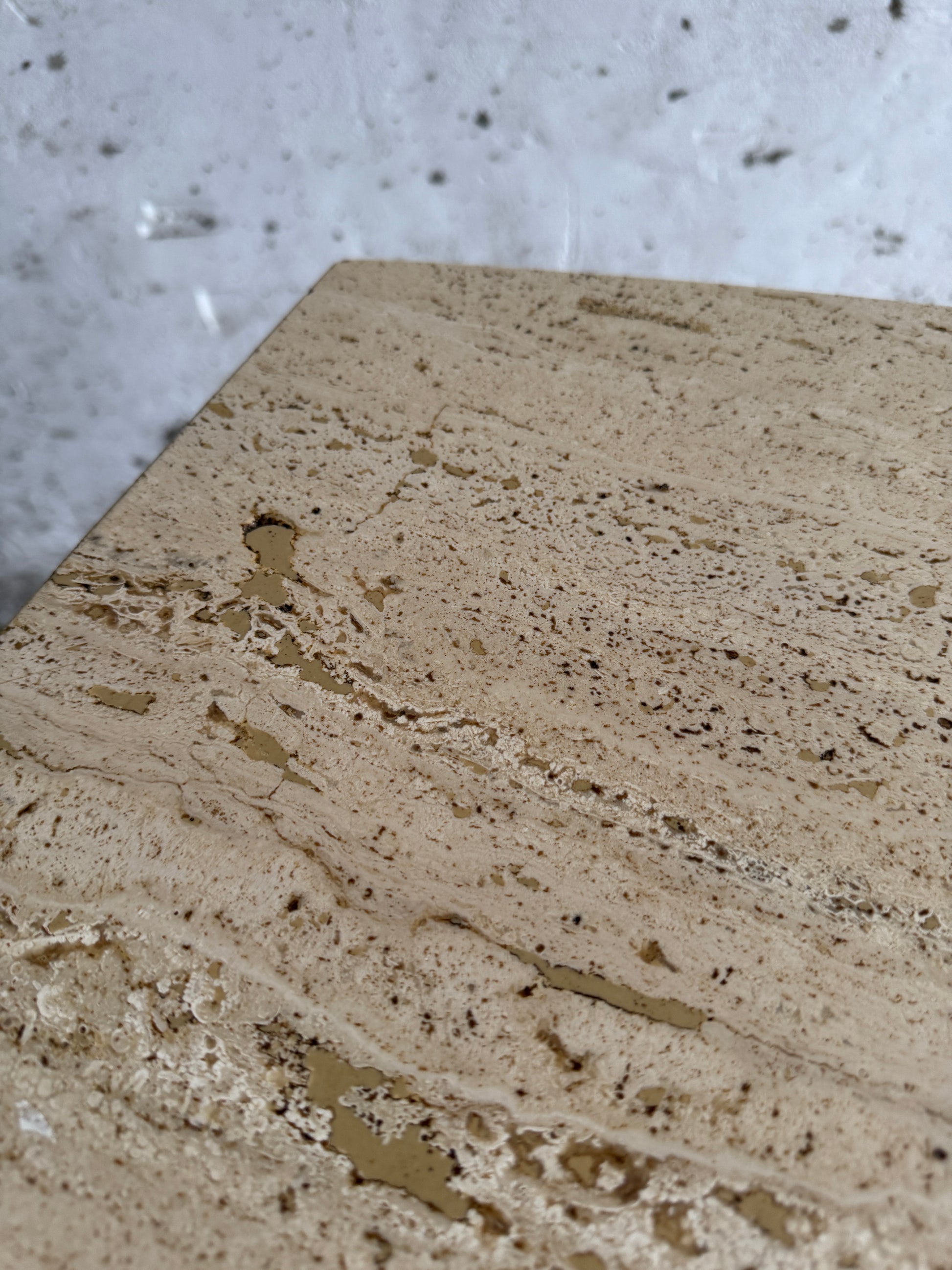 Met zijn gedurfde proporties en architectonische lijnen is deze tafel prachtig als eettafel of vergadertafel. De massieve travertijn basis zorgt voor stabiliteit, terwijl de afgeschuinde rand van het bovenblad een subtiele verfijning toevoegt aan het algehele brutalistische silhouet.