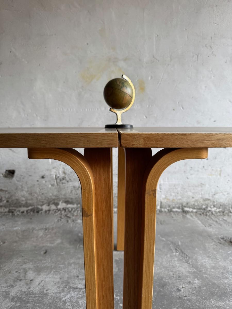 Deze modulaire tafels uit de jaren 70 zijn ontworpen door het Deense duo Rud Thygesen & Johnny Sørensen voor Magnus Olesen. De halvemaanvormige bladen van lichtgrijs laminaat rusten op elegant gebogen poten van beukenhout, wat zorgt voor een zachte, harmonieuze uitstraling.