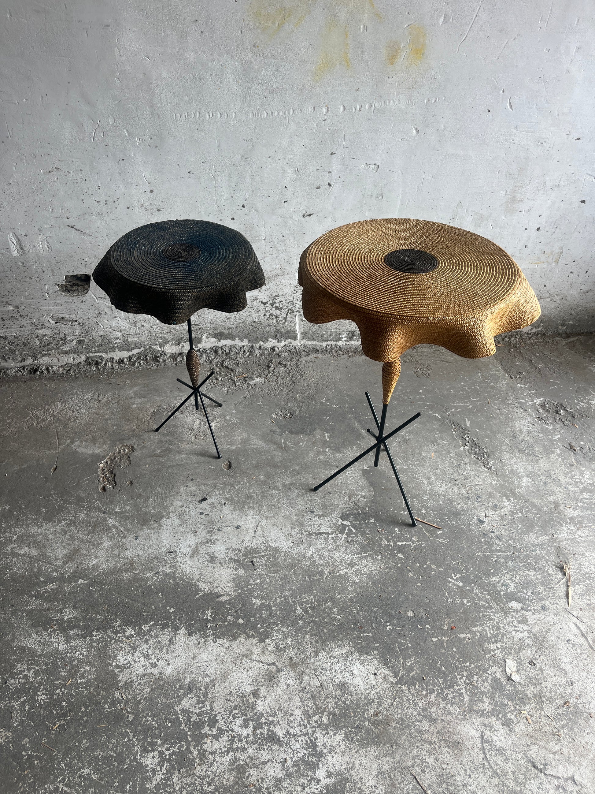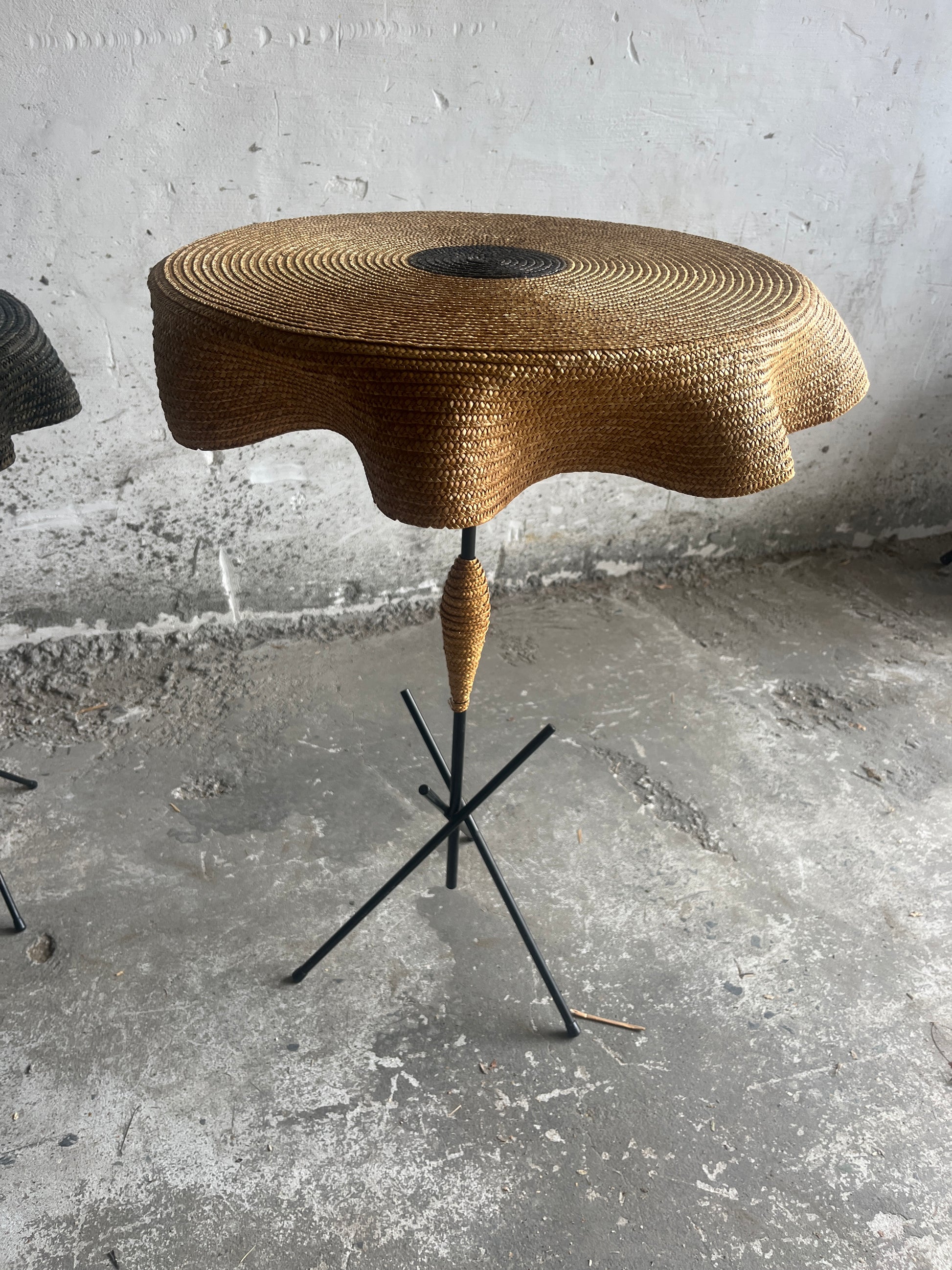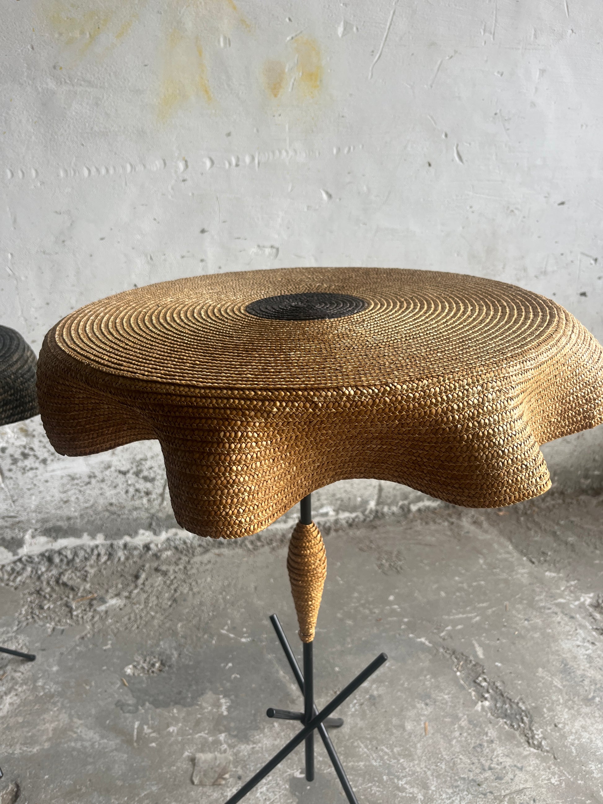 The softly draped raffia tabletops create a dynamic, textural look, perfectly balanced by slender dark blue metal tripod bases. Whether placed together as a set or separately in different corners, these tables add warmth and character to any space.