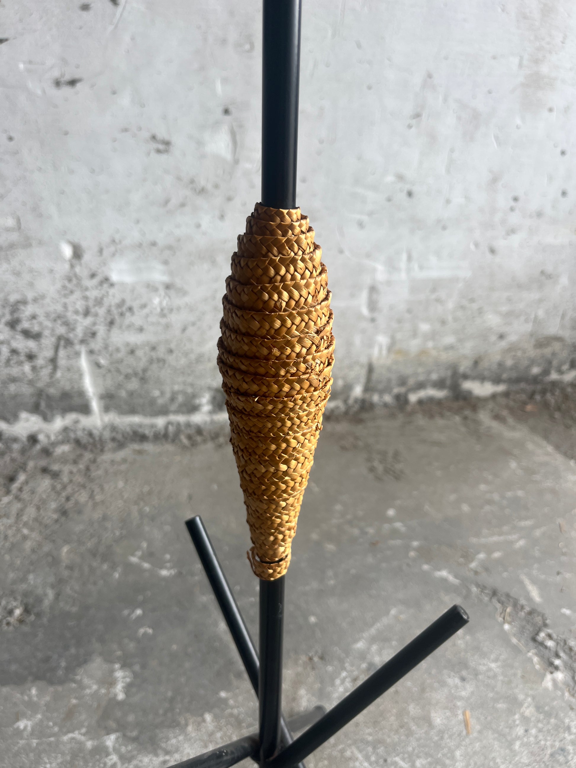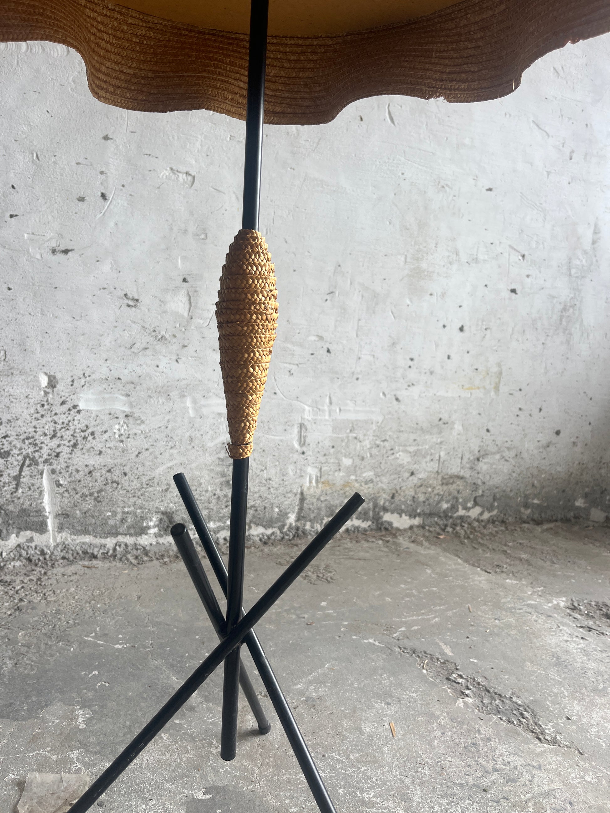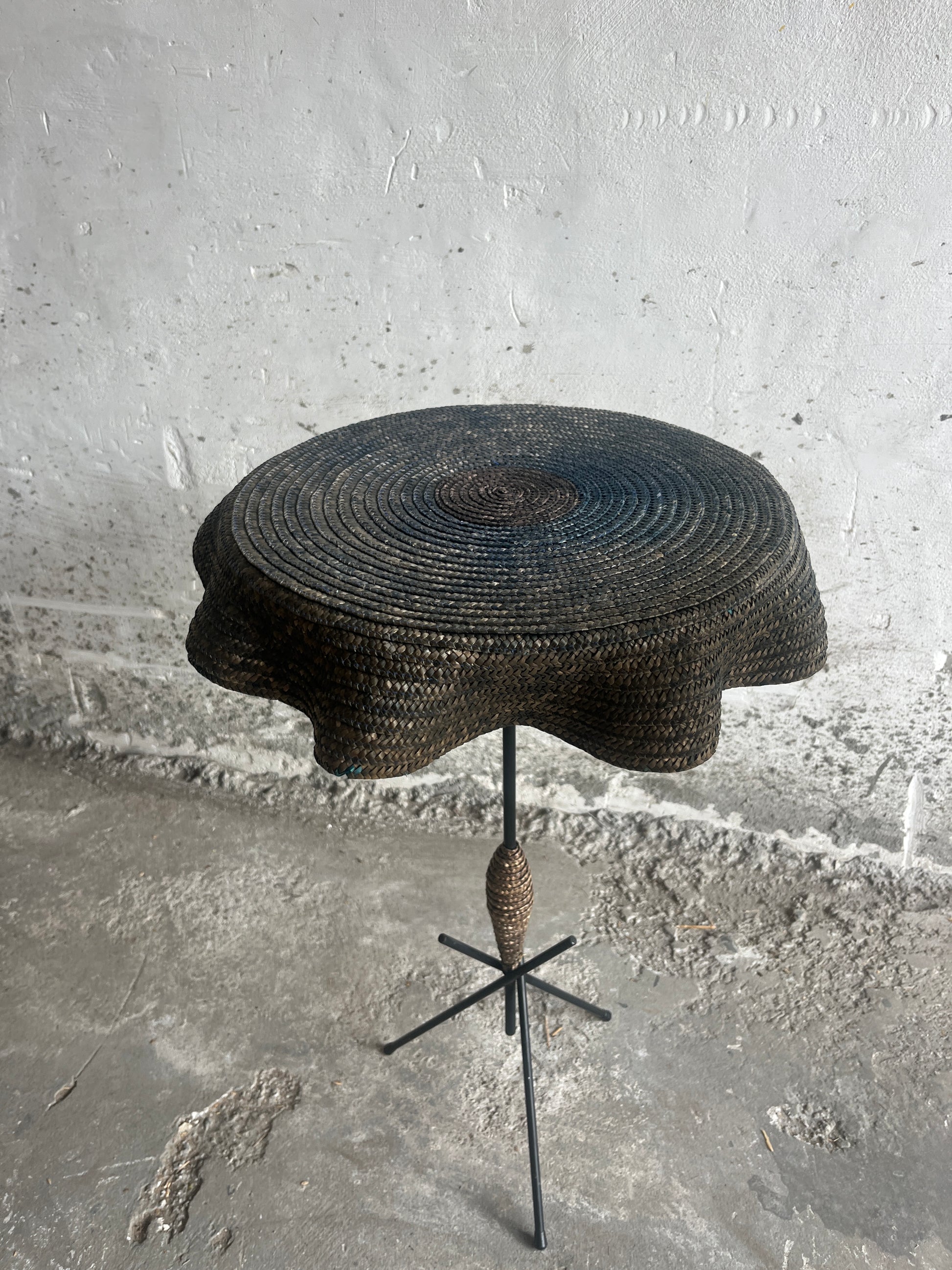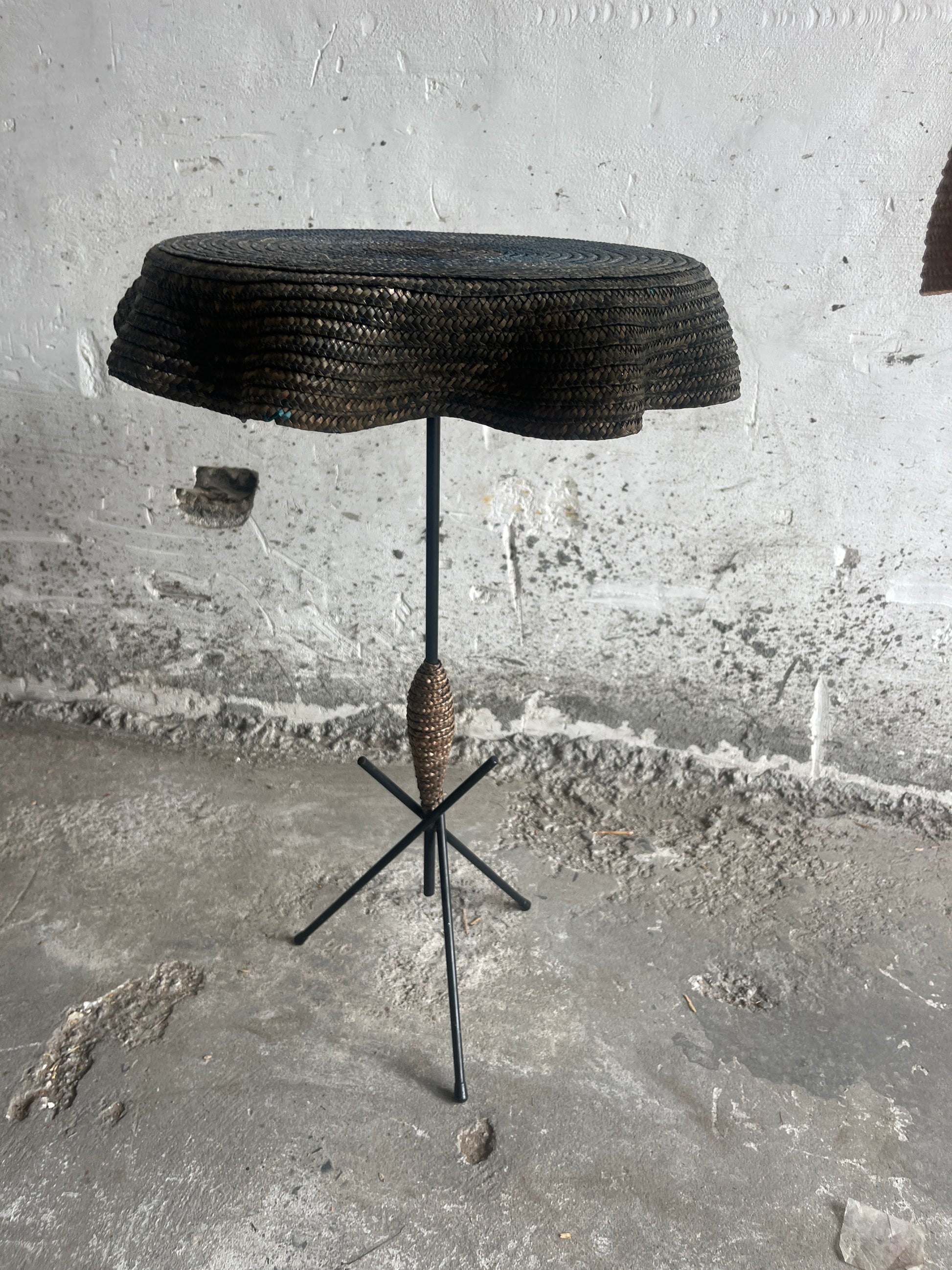 The softly draped raffia tabletops create a dynamic, textural look, perfectly balanced by slender dark blue metal tripod bases. Whether placed together as a set or separately in different corners, these tables add warmth and character to any space.