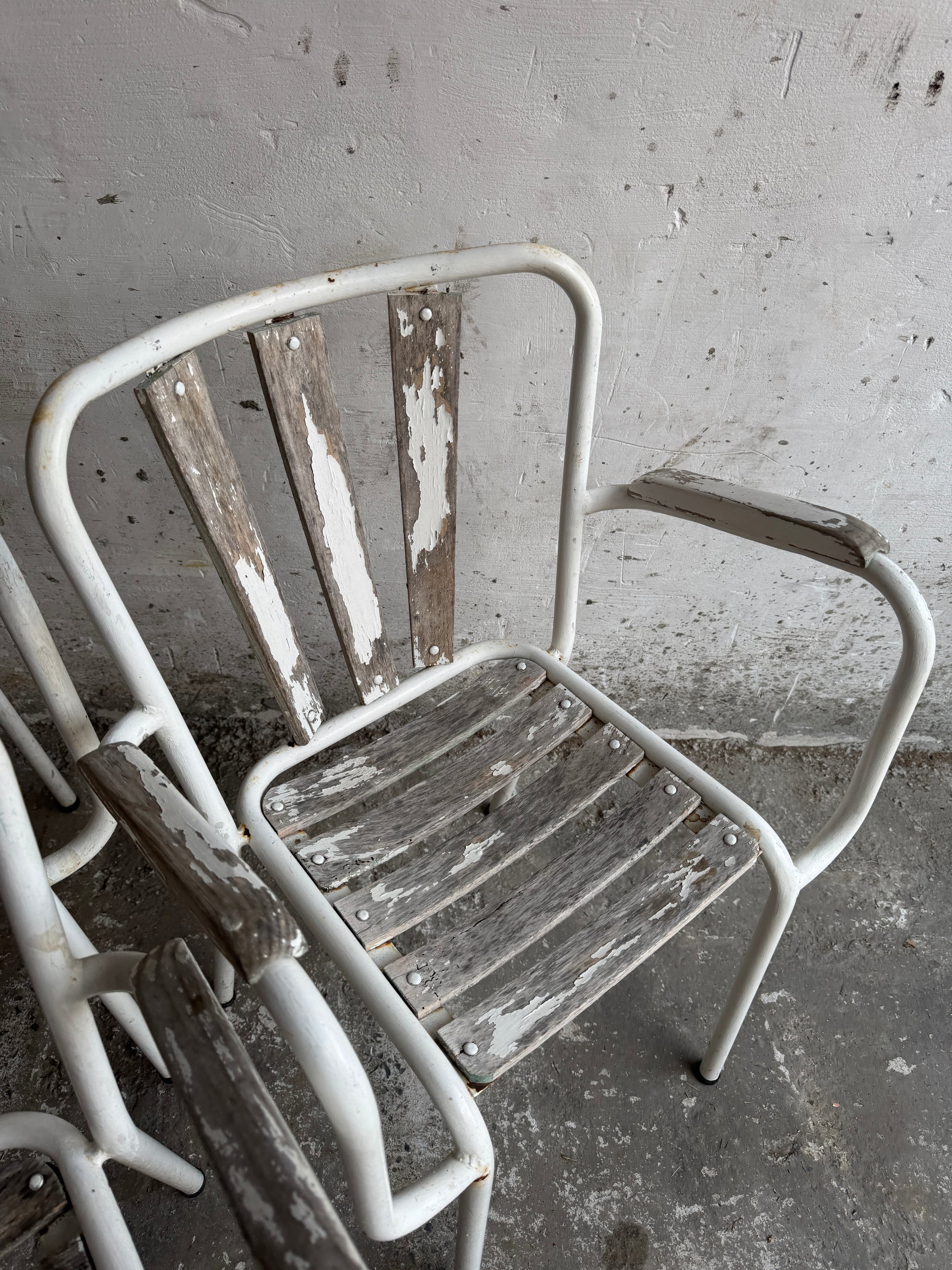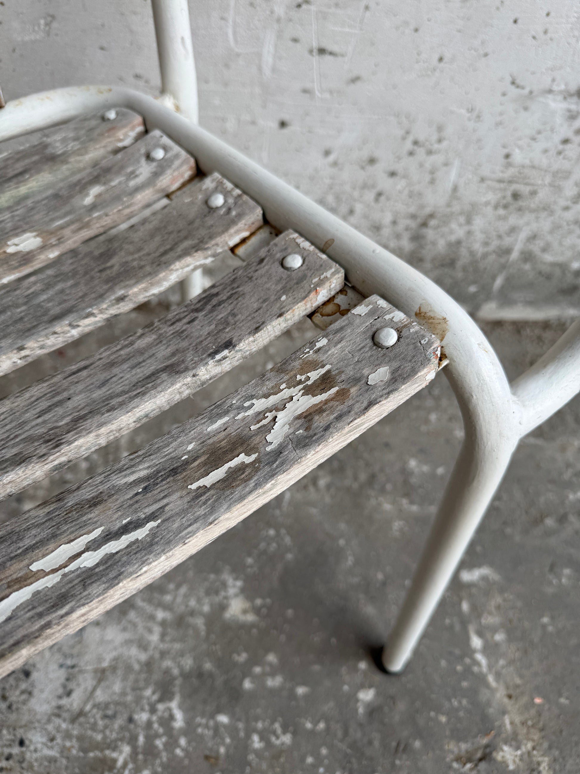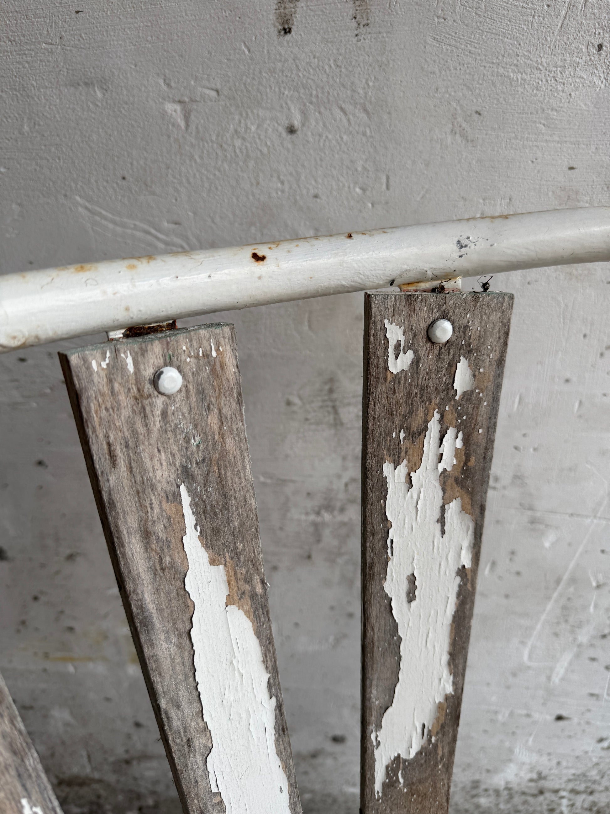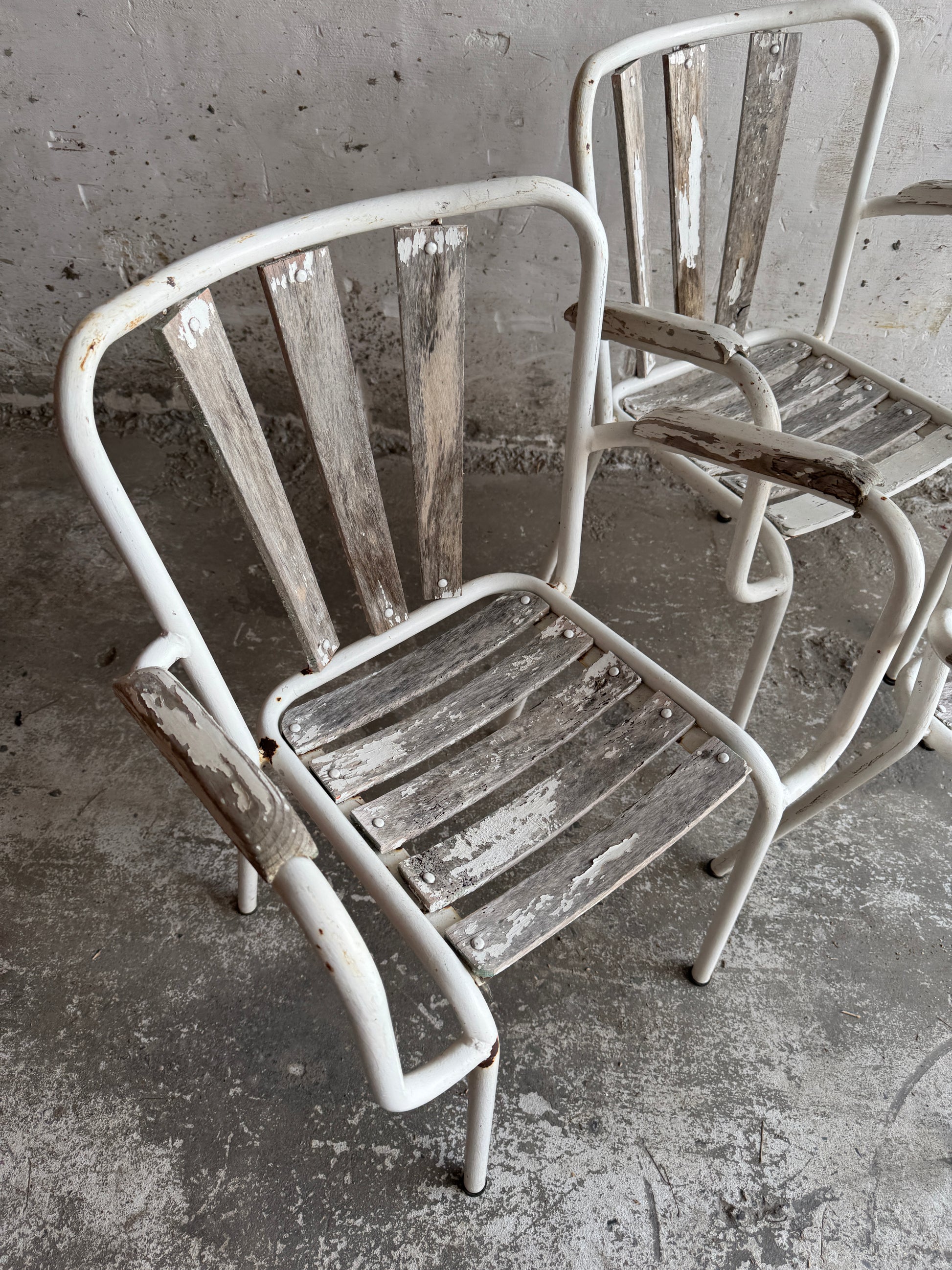 Charming vintage metal garden chairs with a flared slat-back design and timeworn white finish—solid, comfortable, and full of character.