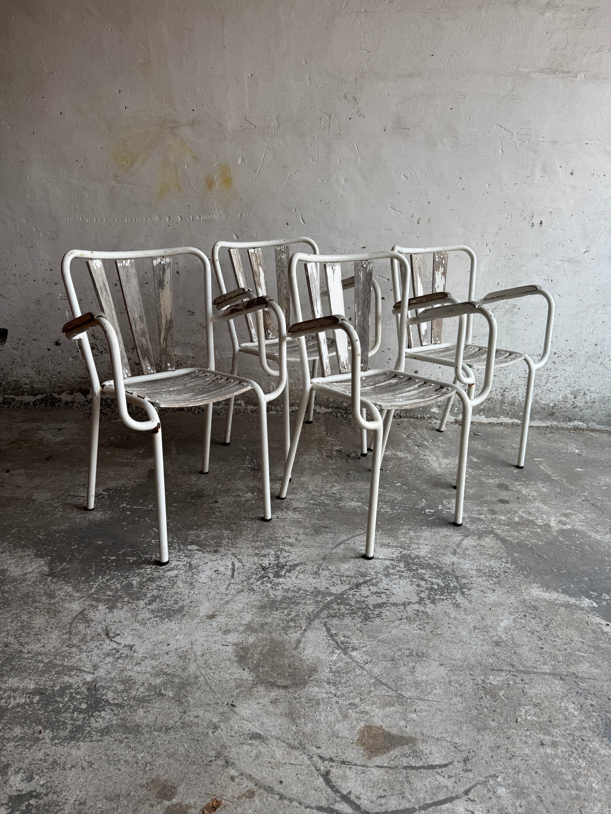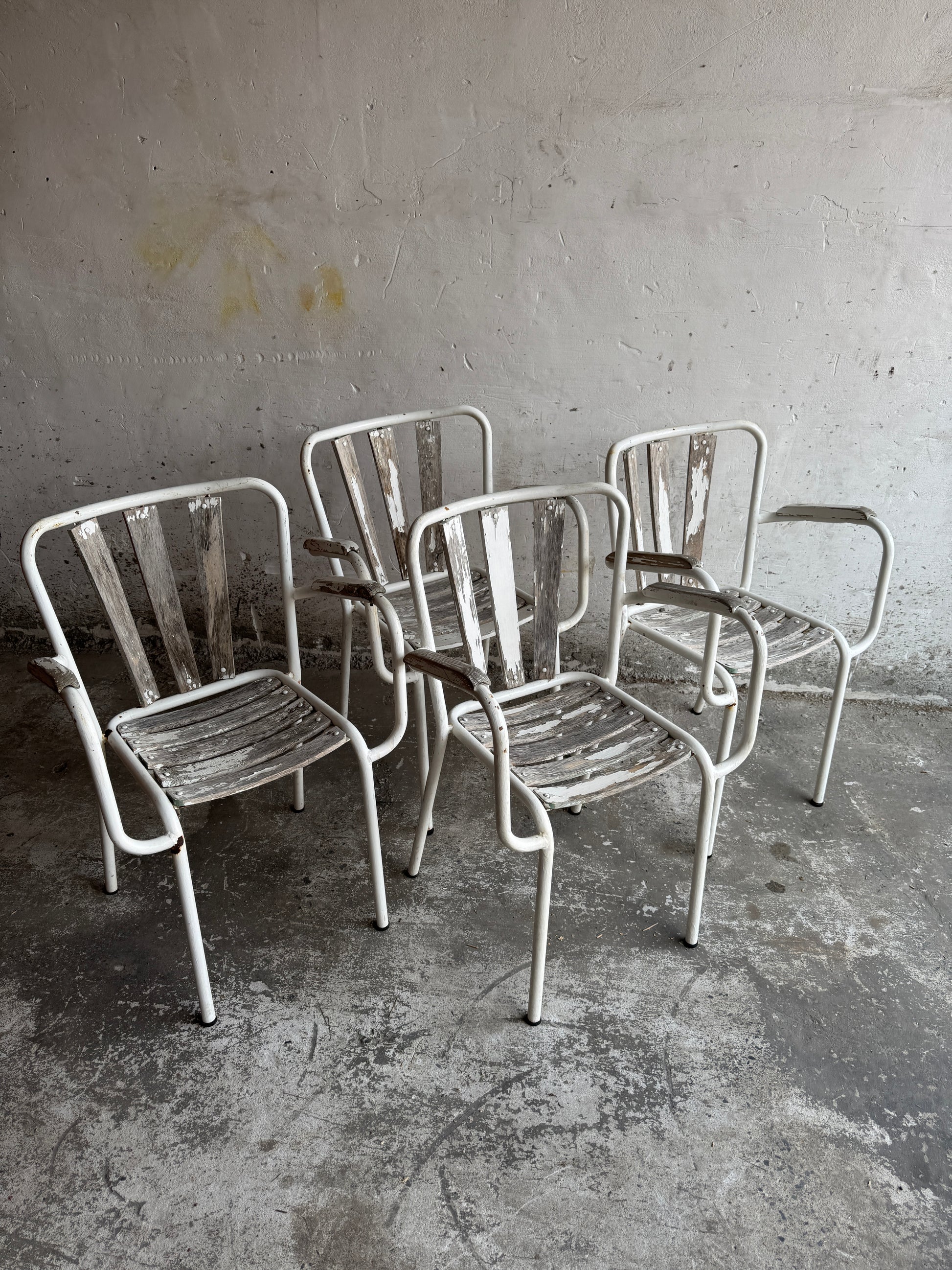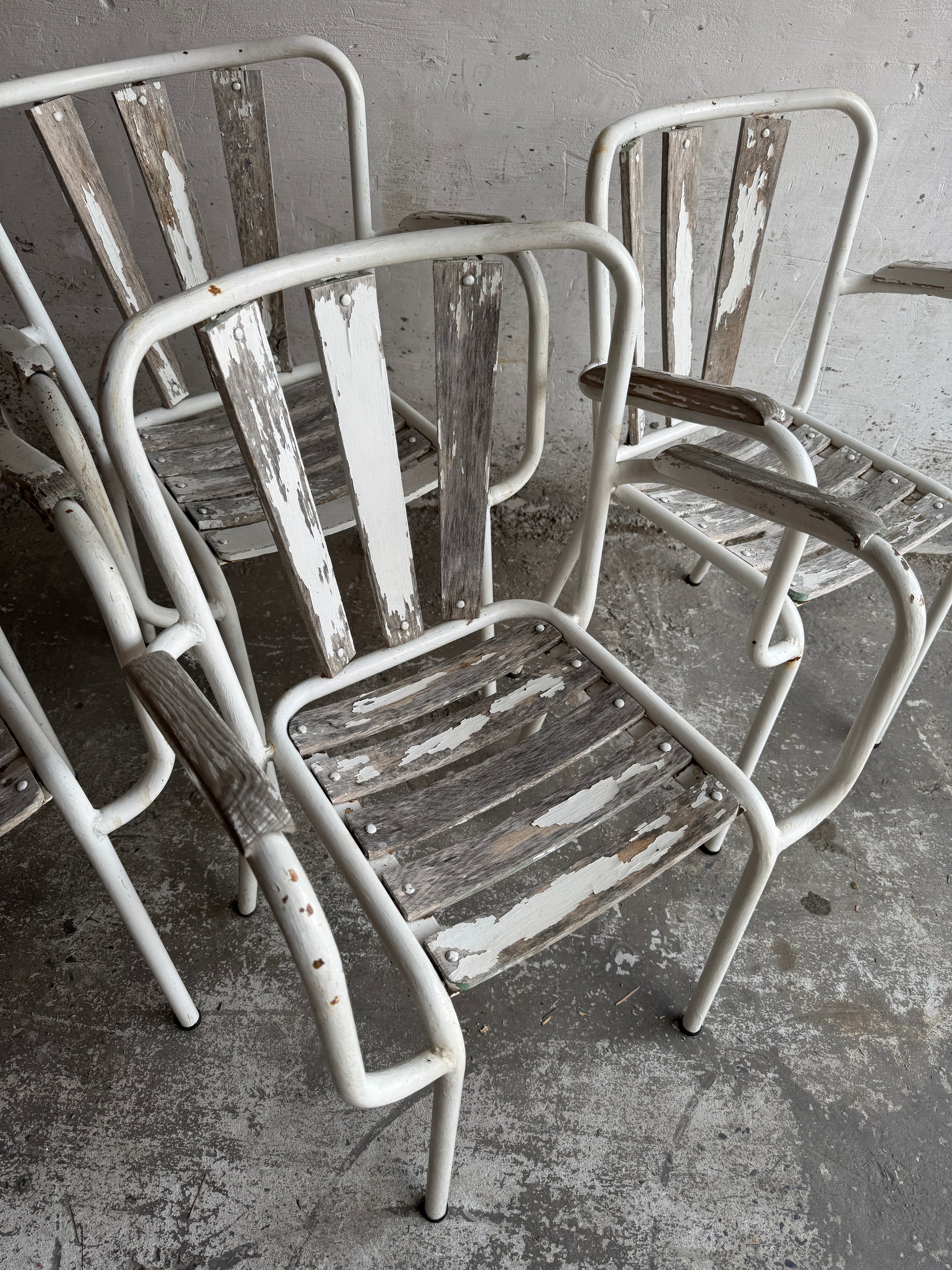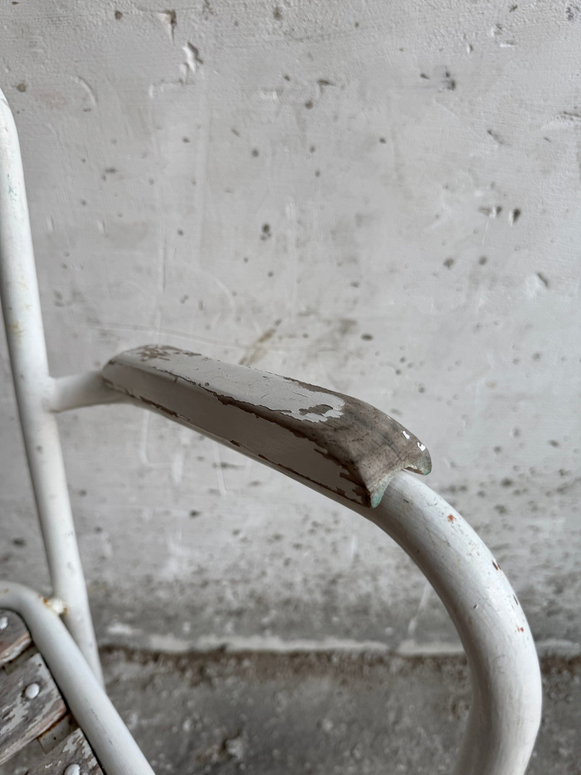 Charming vintage metal garden chairs with a flared slat-back design and timeworn white finish—solid, comfortable, and full of character.
