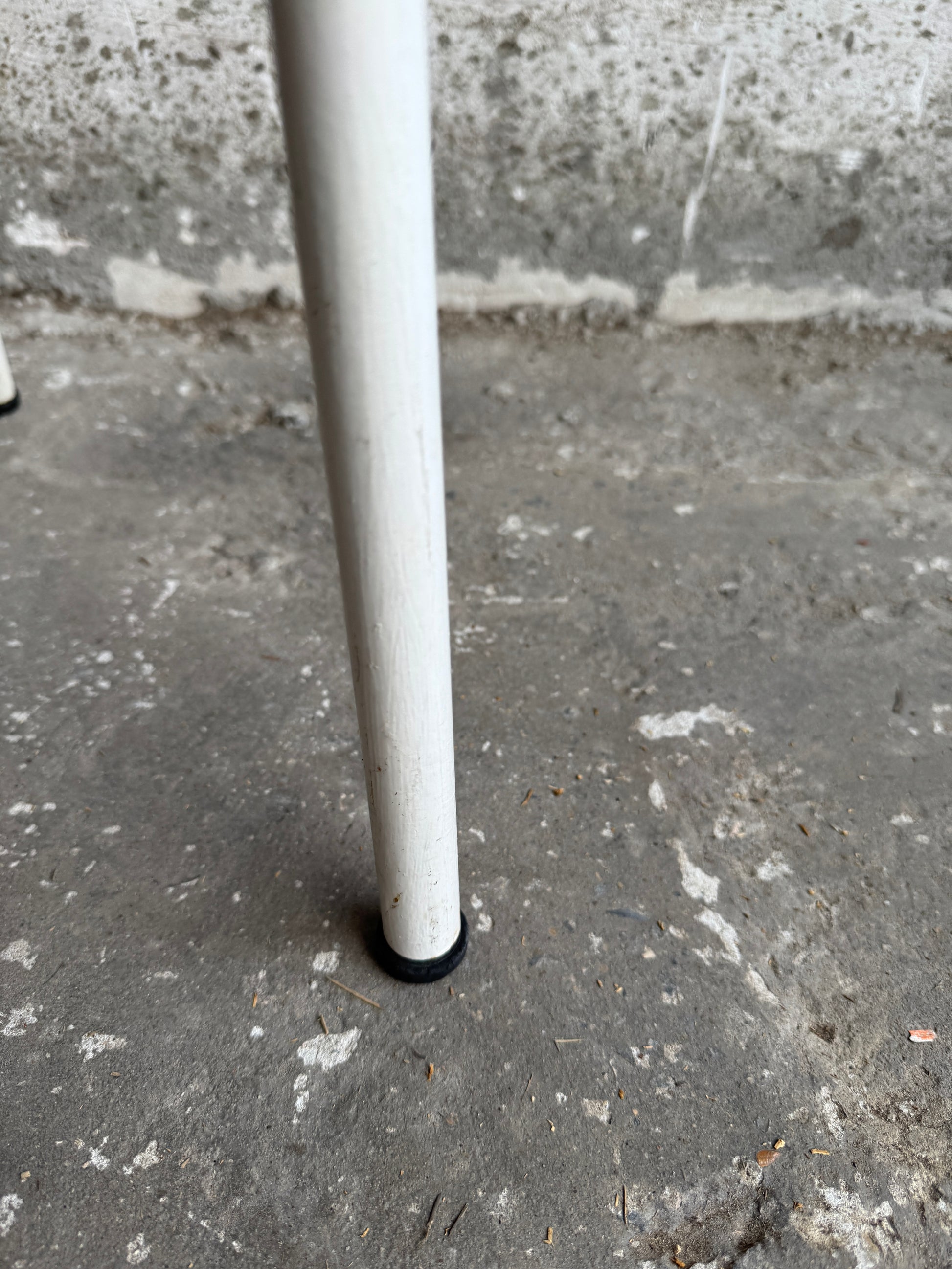 Distressed paint and authentic patina give these chairs an industrial, lived-in look. Comfortable curved backs; sturdy tubular frames for everyday seating indoors or out.