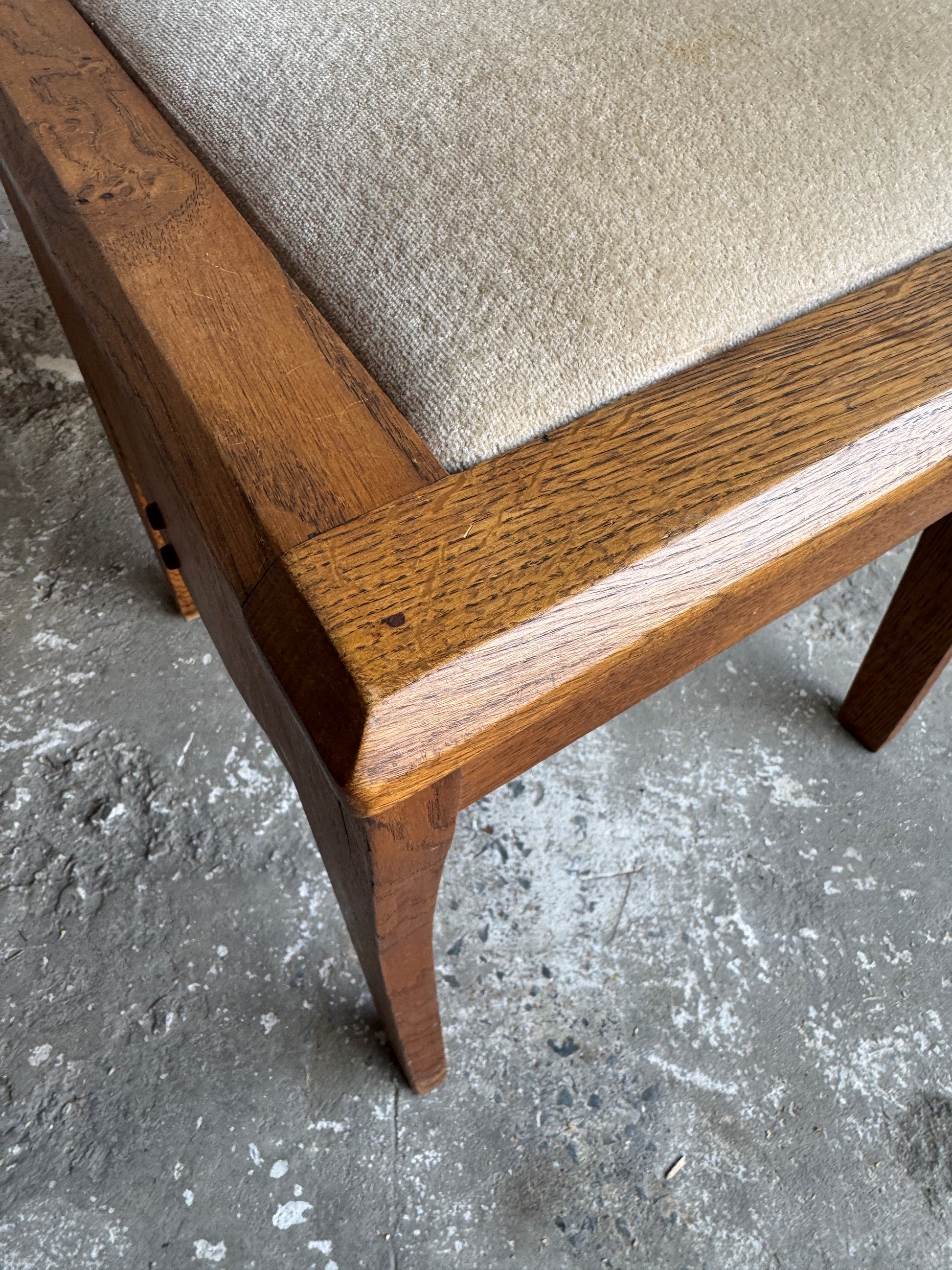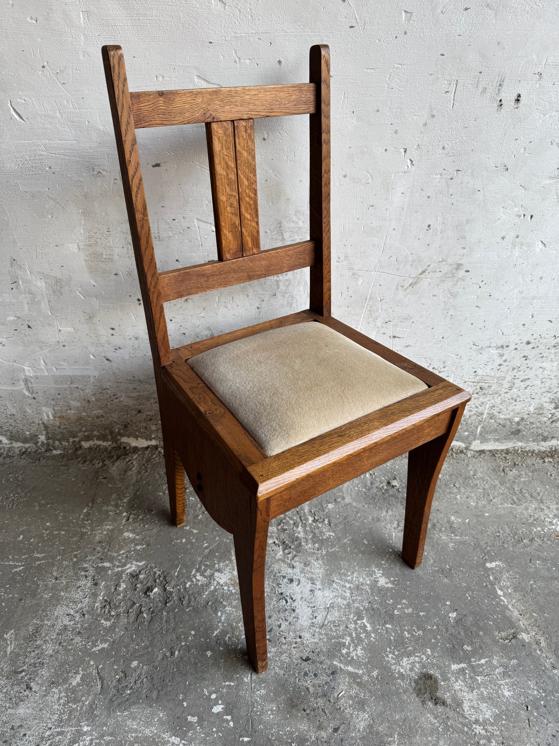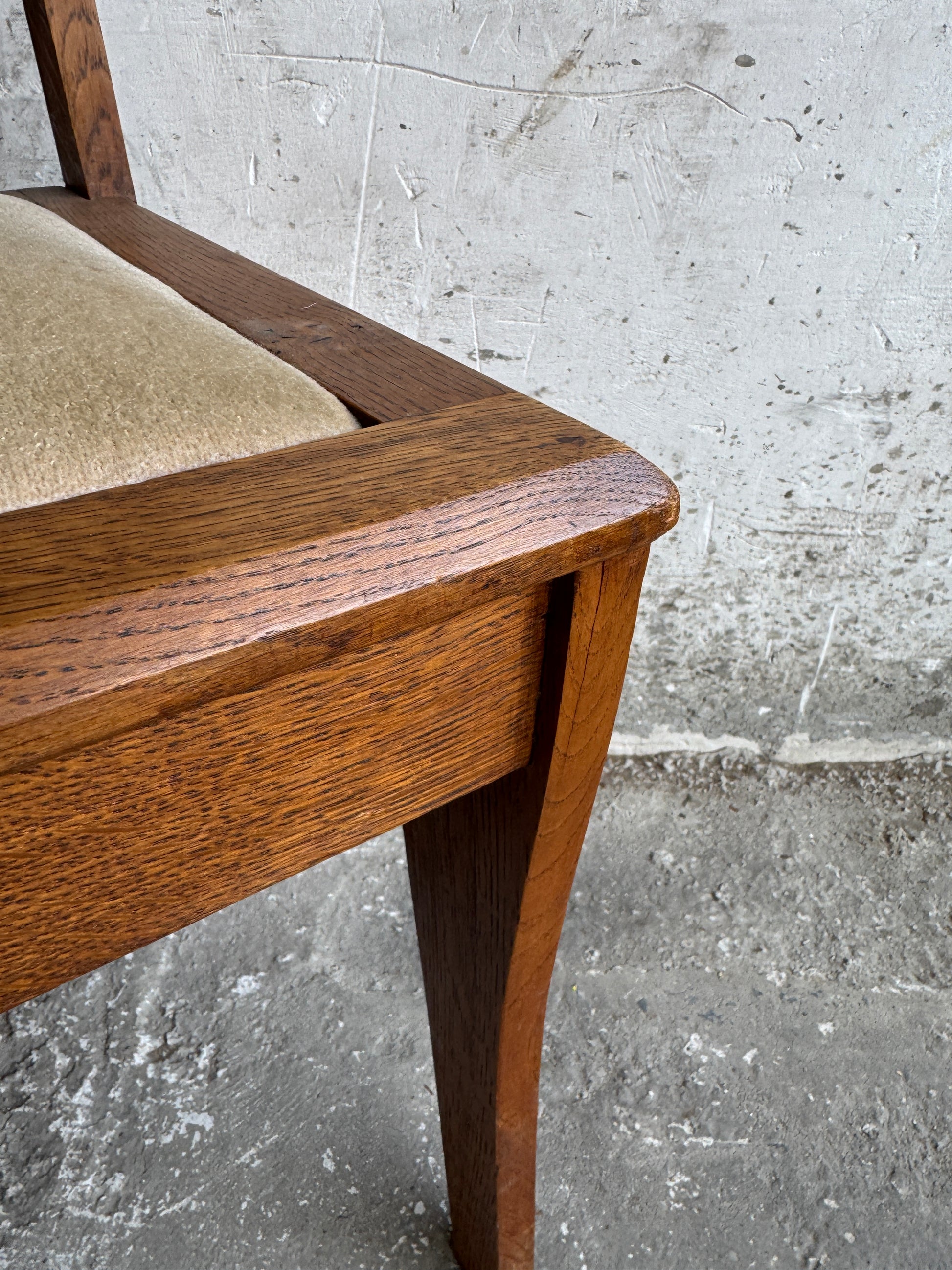 The chairs feature tall, straight backs with clean vertical lines, solid oak frames, and upholstered seats for comfort. Their timeless design combines robust craftsmanship with refined detailing, making them an authentic example of early 20th-century Dutch Art Deco furniture. Comparable to works by designers such as J.J. Zijfers or Fa. Drilling.
